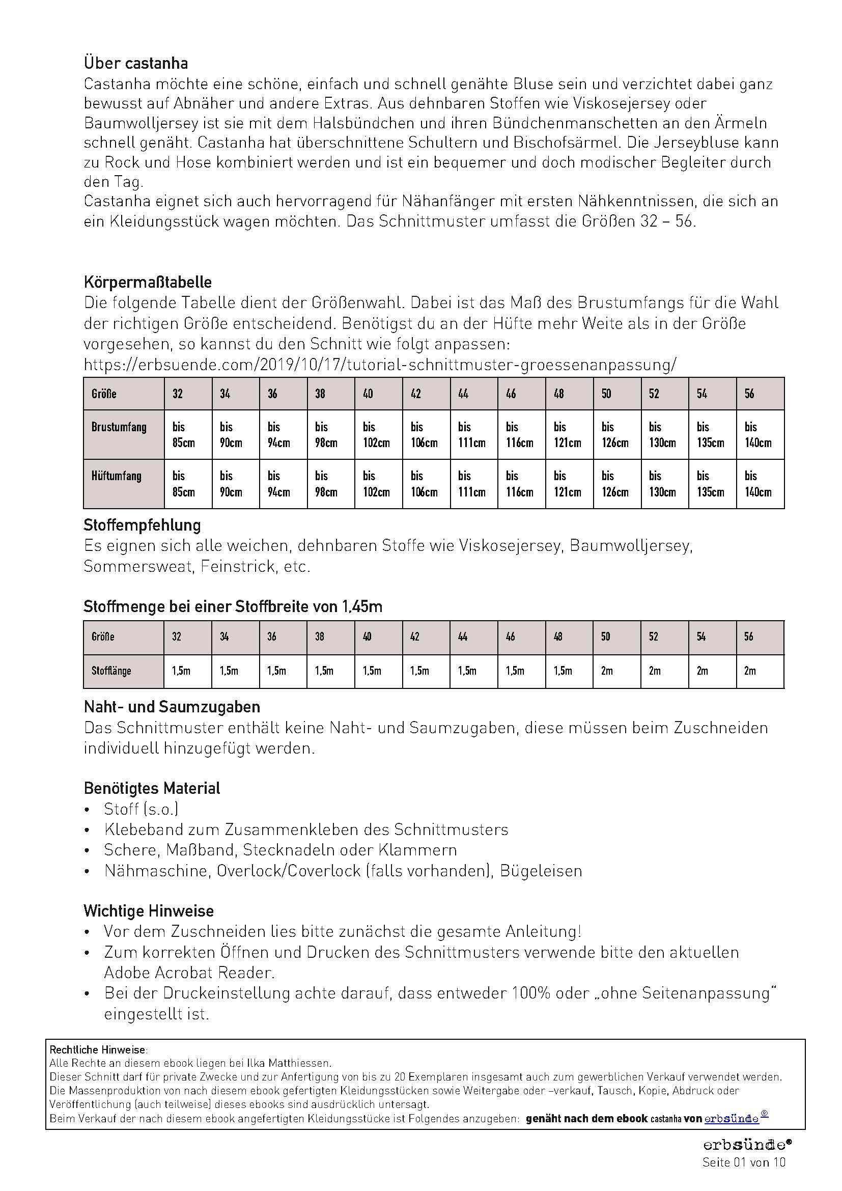 Die Massenproduktion von nach diesem Schnittmuster gefertigten Kleidungsstücken sowie Weitergabe oder -verkauf, Tausch, Kopie, Abdruck oder Veröffentlichung (auch teilweise) dieses Schnittmusters sind ausdrücklich untersagt. Beim Verkauf der nach diesem Schnittmuster angefertigten Kleidungsstücke ist Folgendes anzugeben: Genäht nach dem Schnittmuster “Castanha” von erbsünde.