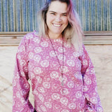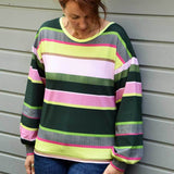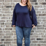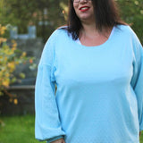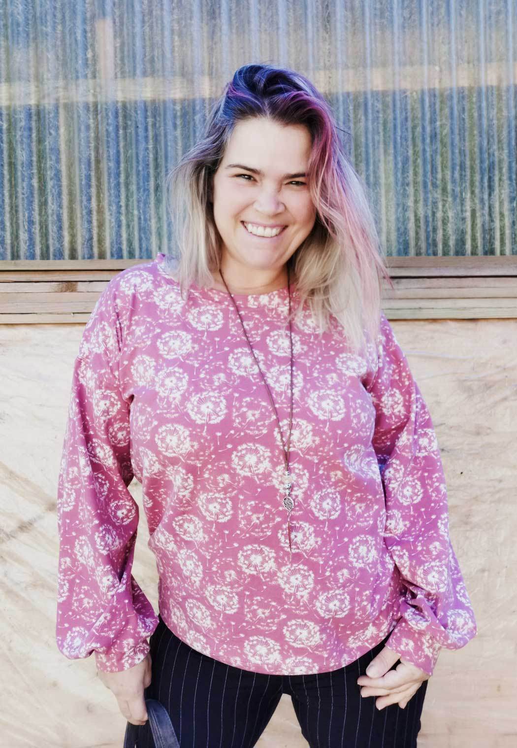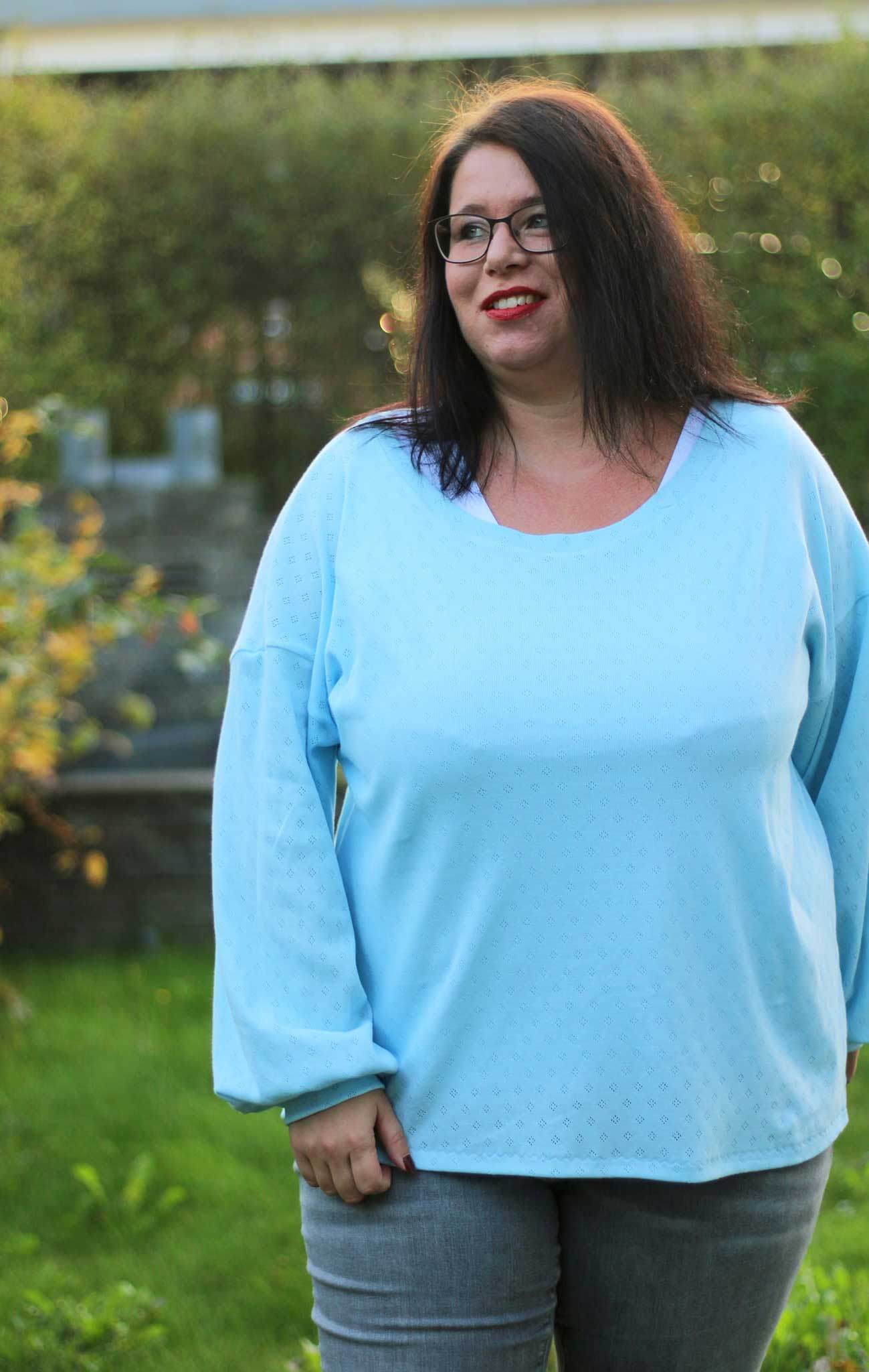 Schnittmuster zum Nähen einer einfachen, schnell genähten Jersey-Bluse mit überschnittenen Schultern und Bischofsärmeln