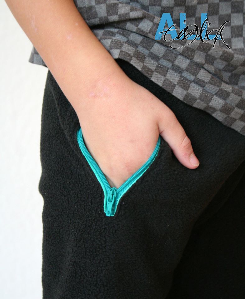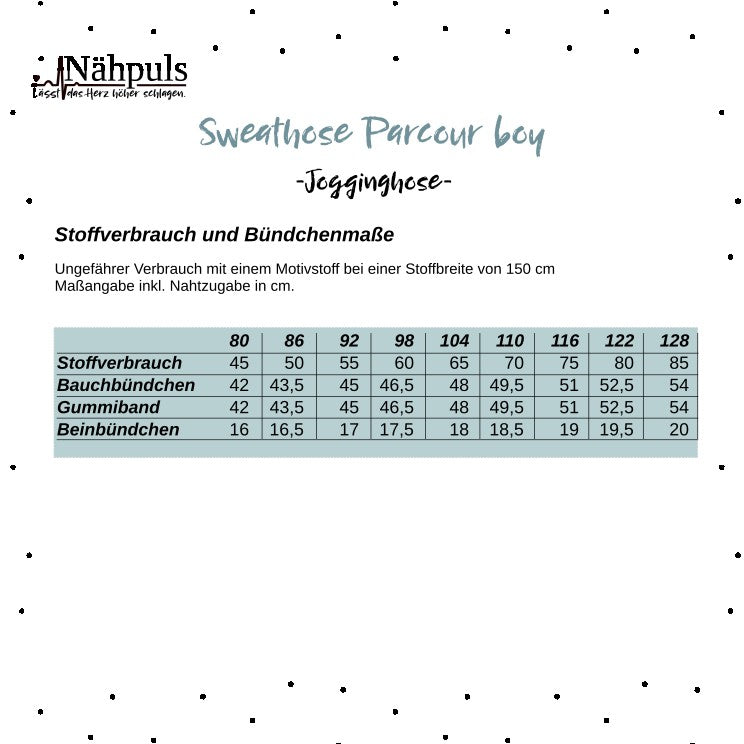 Hervorragend eignet sich dafür Winter‐ und Sommersweat, aber auch Jacquard, French Terry oder Nicki. Die Parcour Boy Hose ist für normale bis schlanke Kinder in den Einzelgrößen 80 bis 128 gradiert. Perfekt für Herbsttage, als Kindergartenhose oder Sporthose. Als Highlight besitzt sie eine senkrechte Reißverschlusstasche, um Kleinigkeiten, wie Taschentücher oder kleine Autos zu verwahren. Die Tasche kann natürlich nach Bedarf auch weggelassen oder auf nur einer, aber auch auf beiden Seiten genäht werden. Für den Bund wird ein 3 cm breites Gummiband benötigt. Der Beinabschluss wird mit Bündchen genäht.