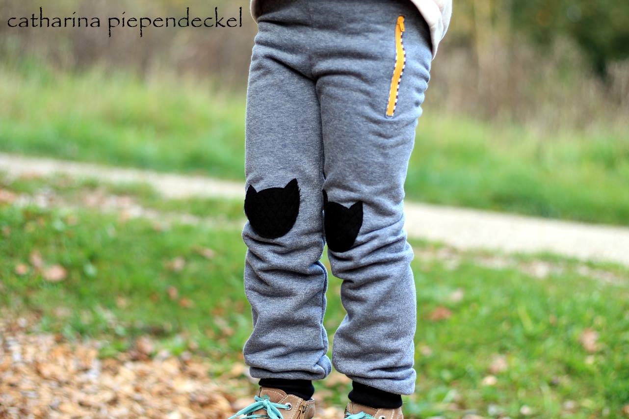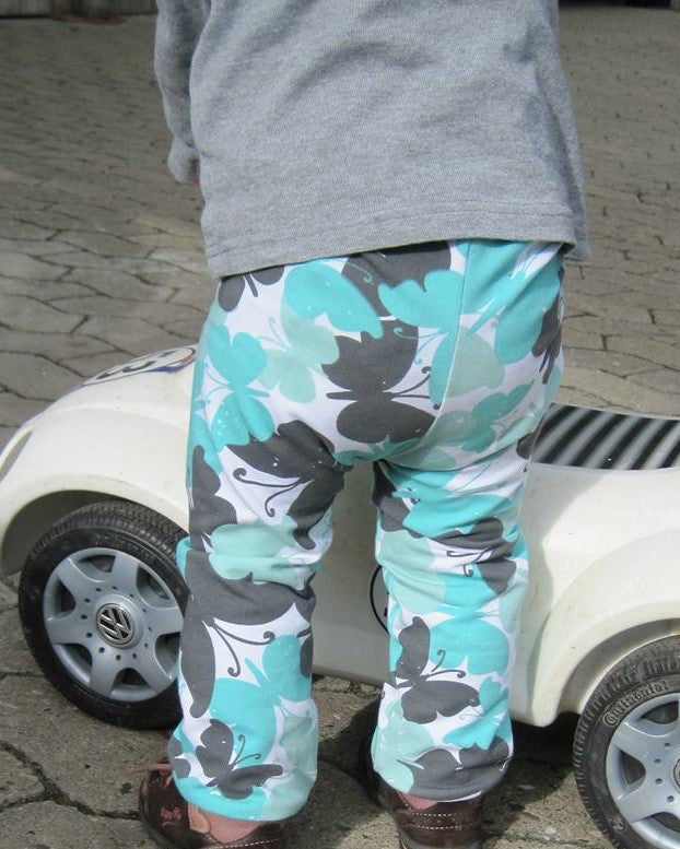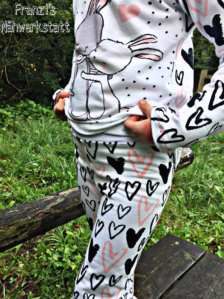 Die Tasche kann natürlich nach Bedarf auch weggelassen oder auf nur einer, aber auch auf beiden Seiten genäht werden. Für den Bund wird ein 3 cm breites Gummiband benötigt. Der Beinabschluss wird mit Bündchen genäht.