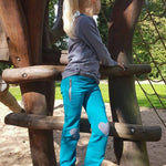 Perfekt für Herbsttage, als Kindergartenhose oder Sporthose. Als Highlight besitzt sie eine senkrechte Reißverschlusstasche, um Kleinigkeiten, wie Taschentücher oder Haarspängchen zu verwahren.
