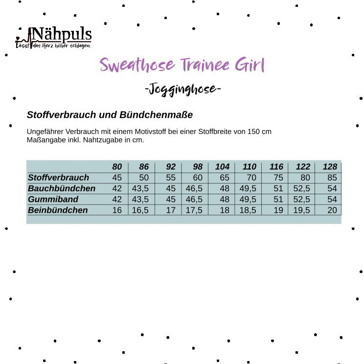 Hervorragend eignet sich dafür Winter‐ und Sommersweat, aber auch Jacquard, French Terry oder Nicki. Die Trainee Hose ist für normale bis schlanke Kinder in den Größen 80 bis 128 gradiert.