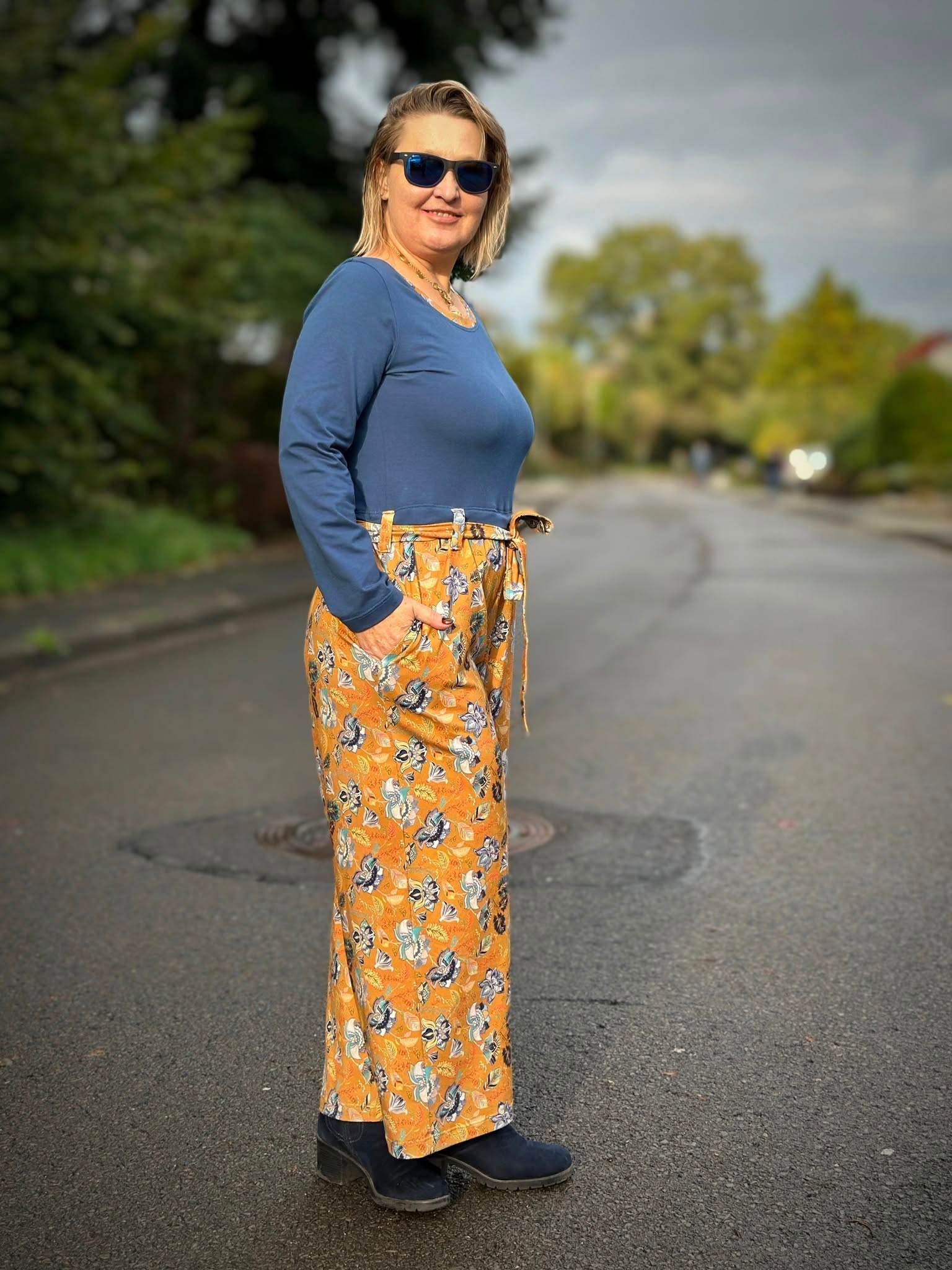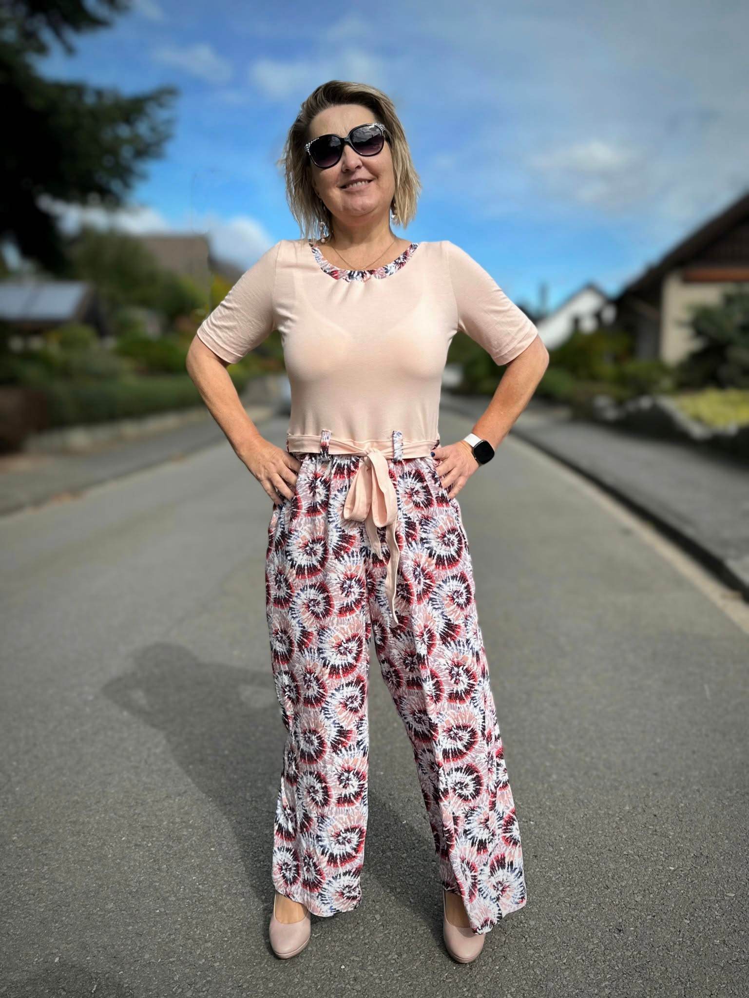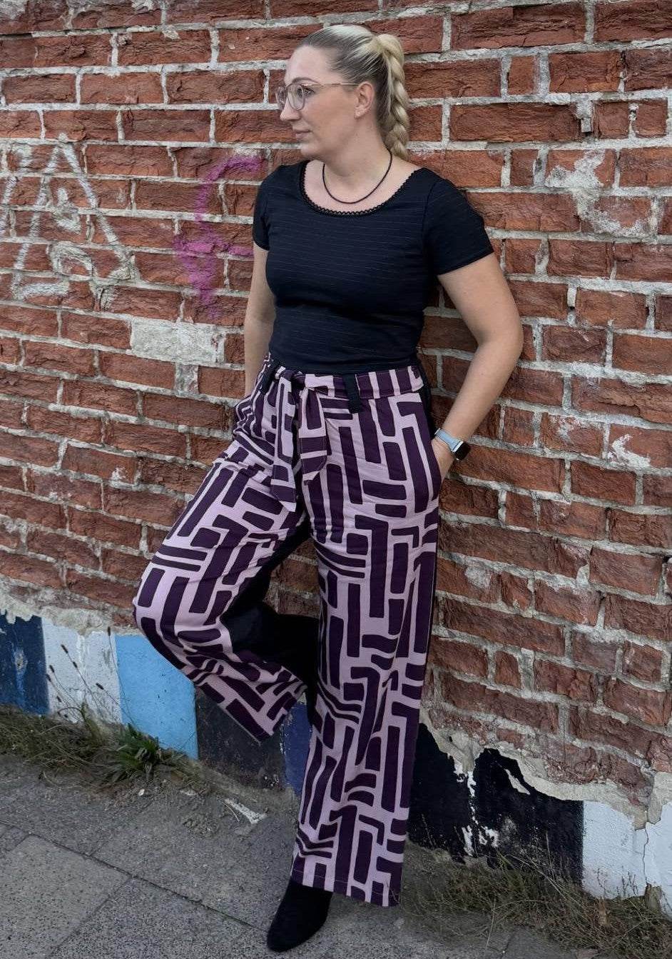Der Schnitt ist für dehnbare Stoffe für das Oberteil und leichte Viskosestoffe für die Hose konzipiert. Es gibt viel Spielraum zum tüddeln und verzieren.