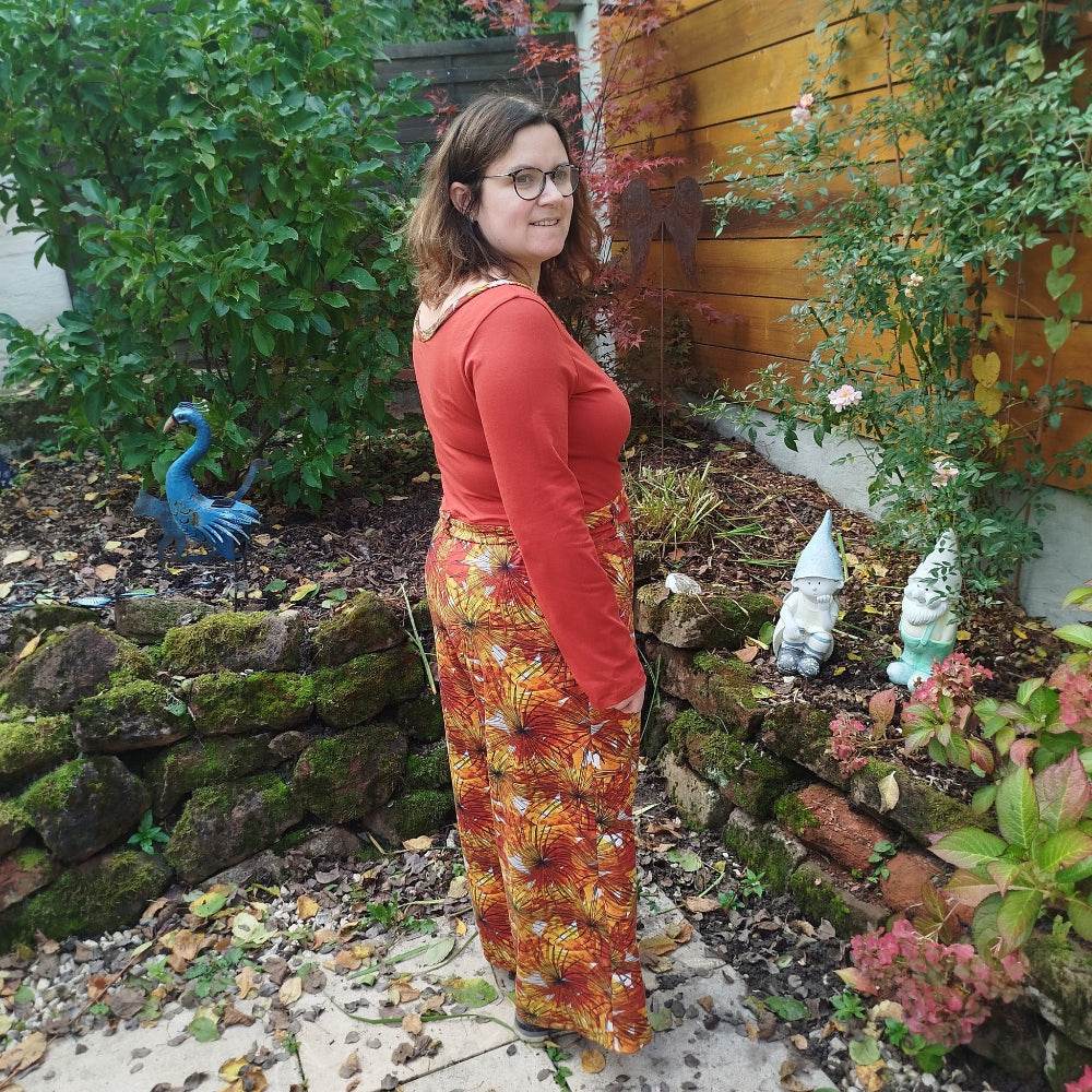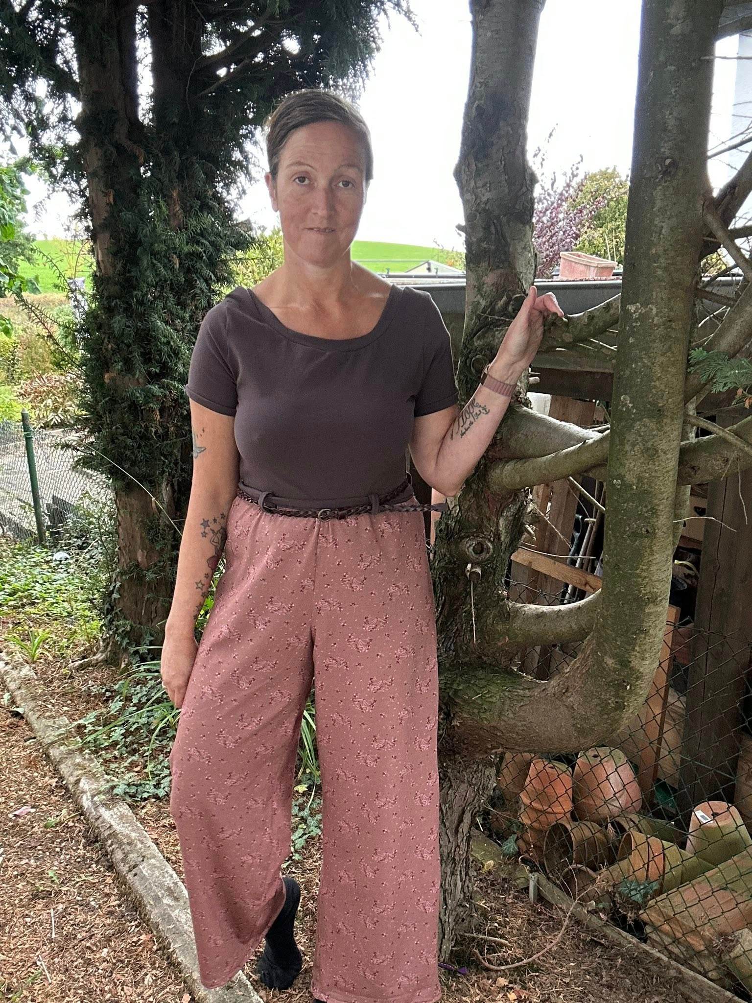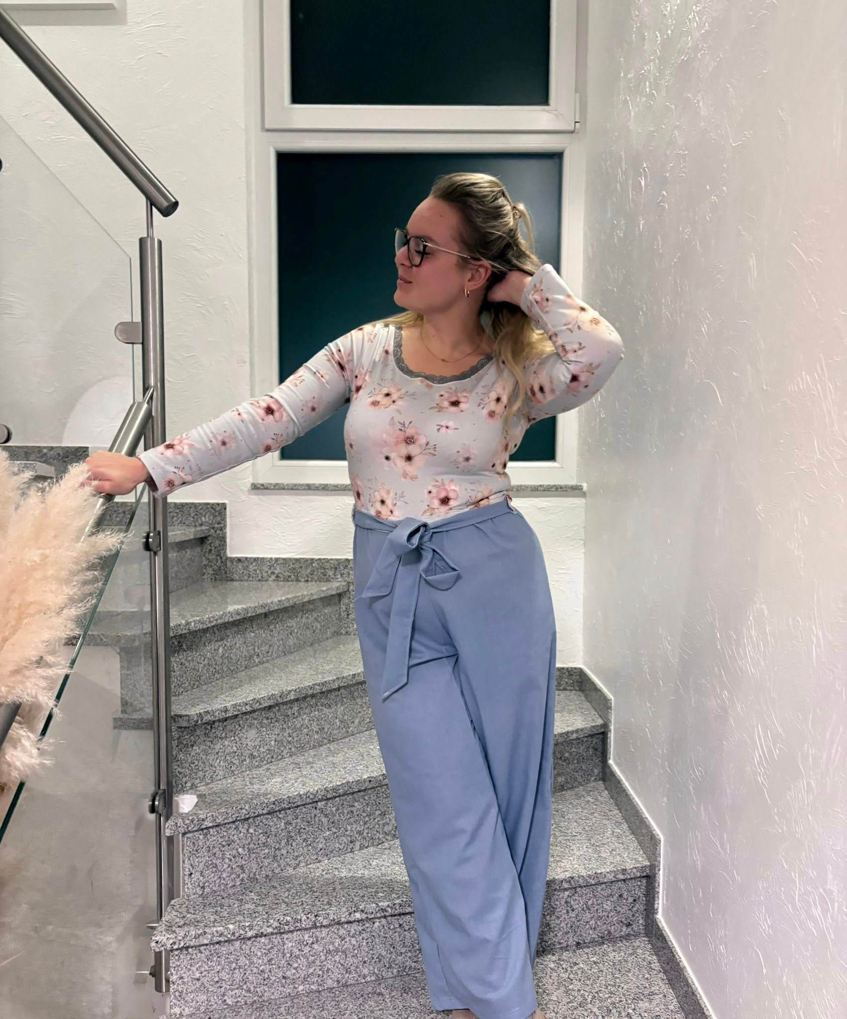 Der Schnitt ist für dehnbare Stoffe für das Oberteil und leichte Viskosestoffe für die Hose konzipiert. Es gibt viel Spielraum zum tüddeln und verzieren.