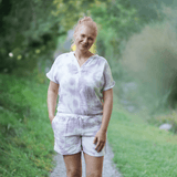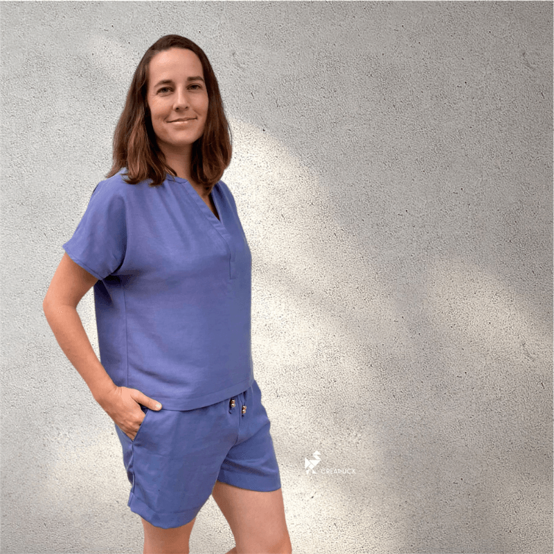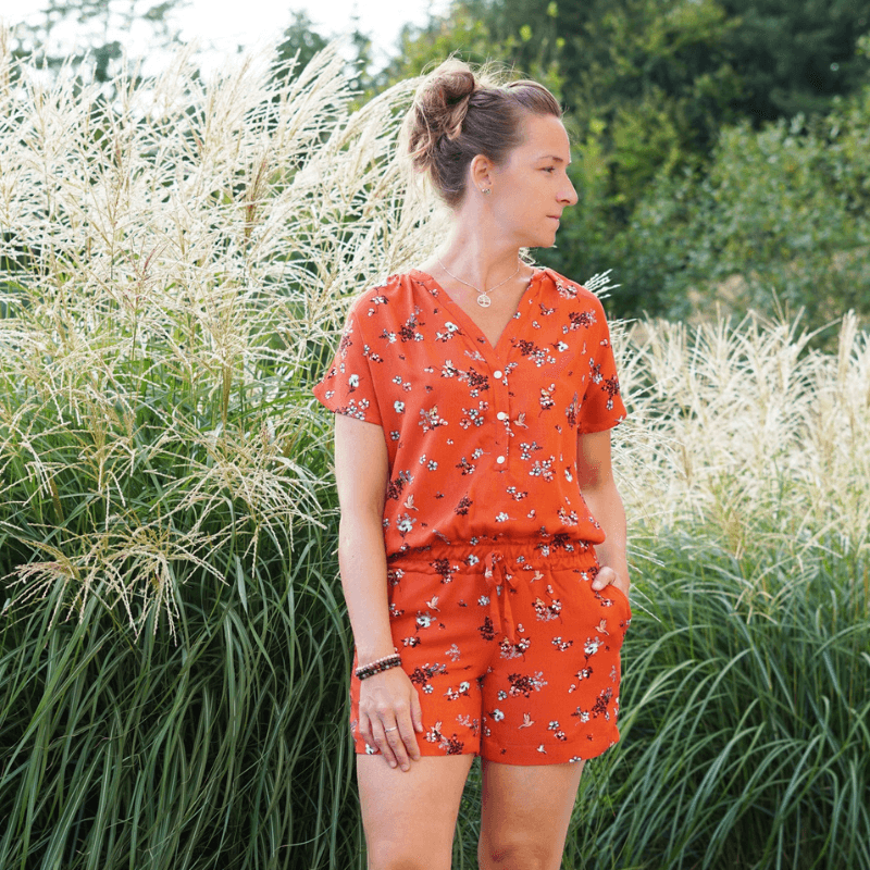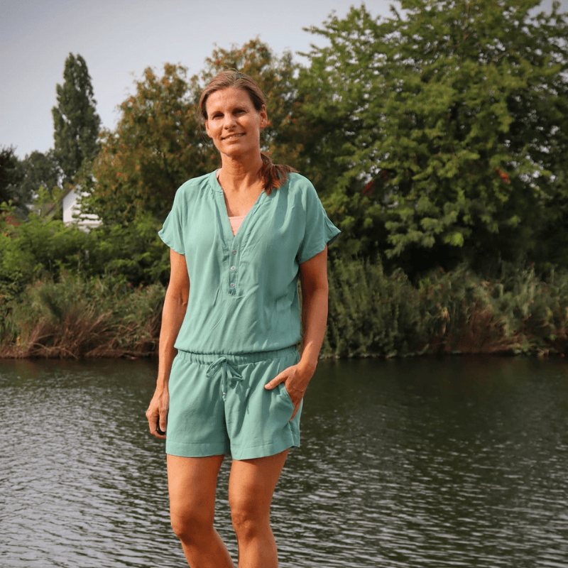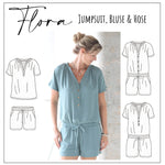 Flora ist ein moderner Jumpsuit mit überschnittenen Ärmeln, welcher auch einzeln als Bluse und Hose genäht werden kann. Die Raffung am Halsausschnitt und der Liegekragen verleihen Flora einen raffinierten Look. Beim Jumpsuit kannst du zwischen einer durchgängigen oder einer nicht-durchgängigen Knopfleiste wählen. Die Bluse wird mit Belegen am Saum und einer kurzen Leiste genäht. Die Hose sitzt auf der Hüfte, hat seitliche Eingriffstaschen und ist locker geschnitten.