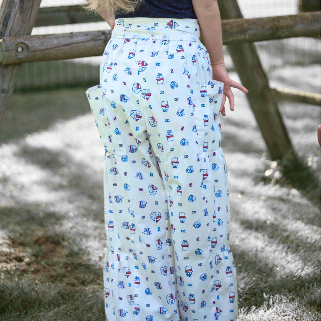 Als Variante kannst Du wahlweise Taschen nähen, in die sich problemlos kleine Schätze verstauen lassen und oder die Länge variieren mit einer 7/8 Länge. Ein weiteres Highlight ist der passende Stoffgürtel zum Binden, der der Hose eine zusätzliche persönliche Note verleiht.