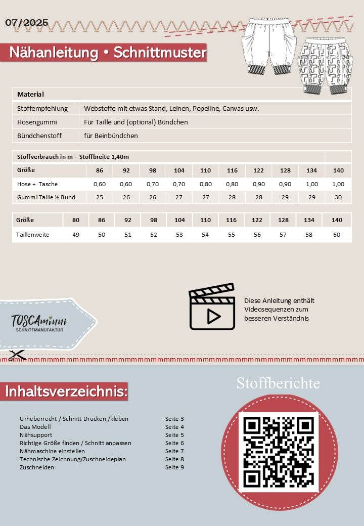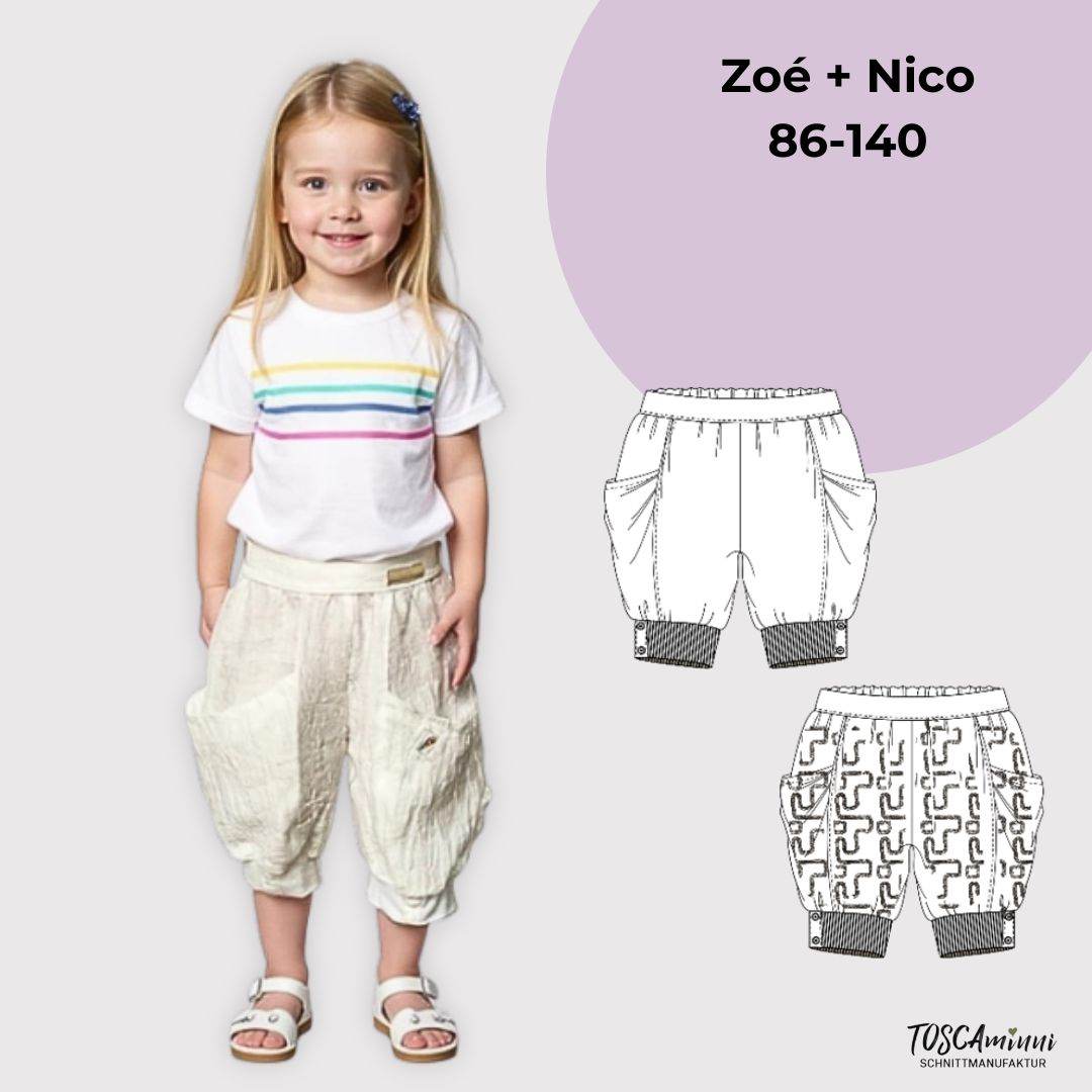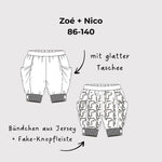 Schnittmuster für Kinder: Kurze Hose Zoè + Nico Gr. 86–140 – lockere Sommerhose mit Bündchen und großen Taschen