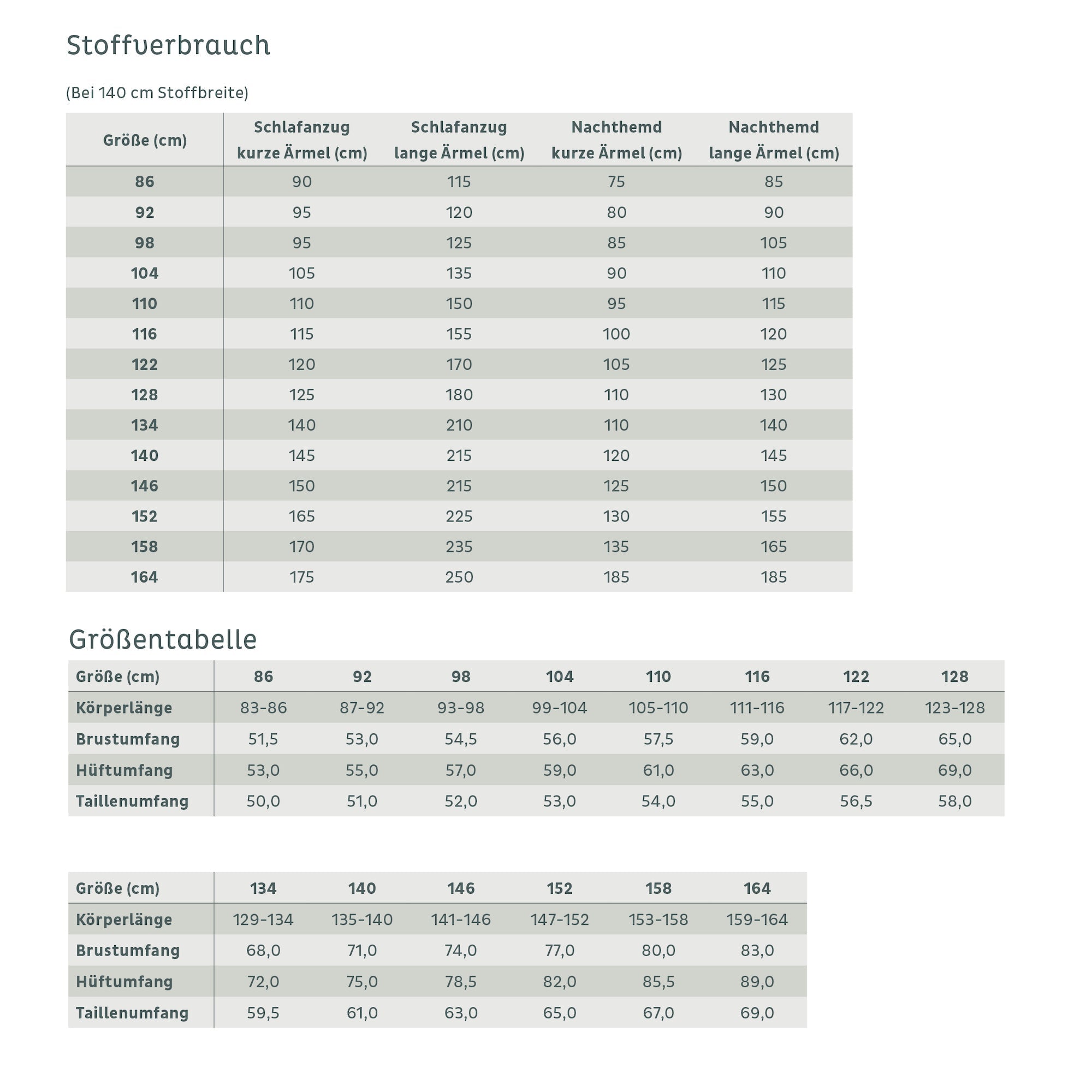Die lockere und entspannte Passform des Schnittmusters gewährleistet eine einfache Bewegungsfreiheit während des Schlafs, für eine erholsame Nacht. Wähle weiche und gemütliche Stoffe wie Baumwolle oder Flanell, um deine Kinder die ganze Nacht über angenehm warm zu halten. Für heiße Sommernächte empfehlen sich atmungsaktive Stoffe wie Musselin.