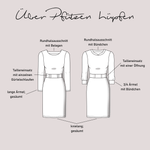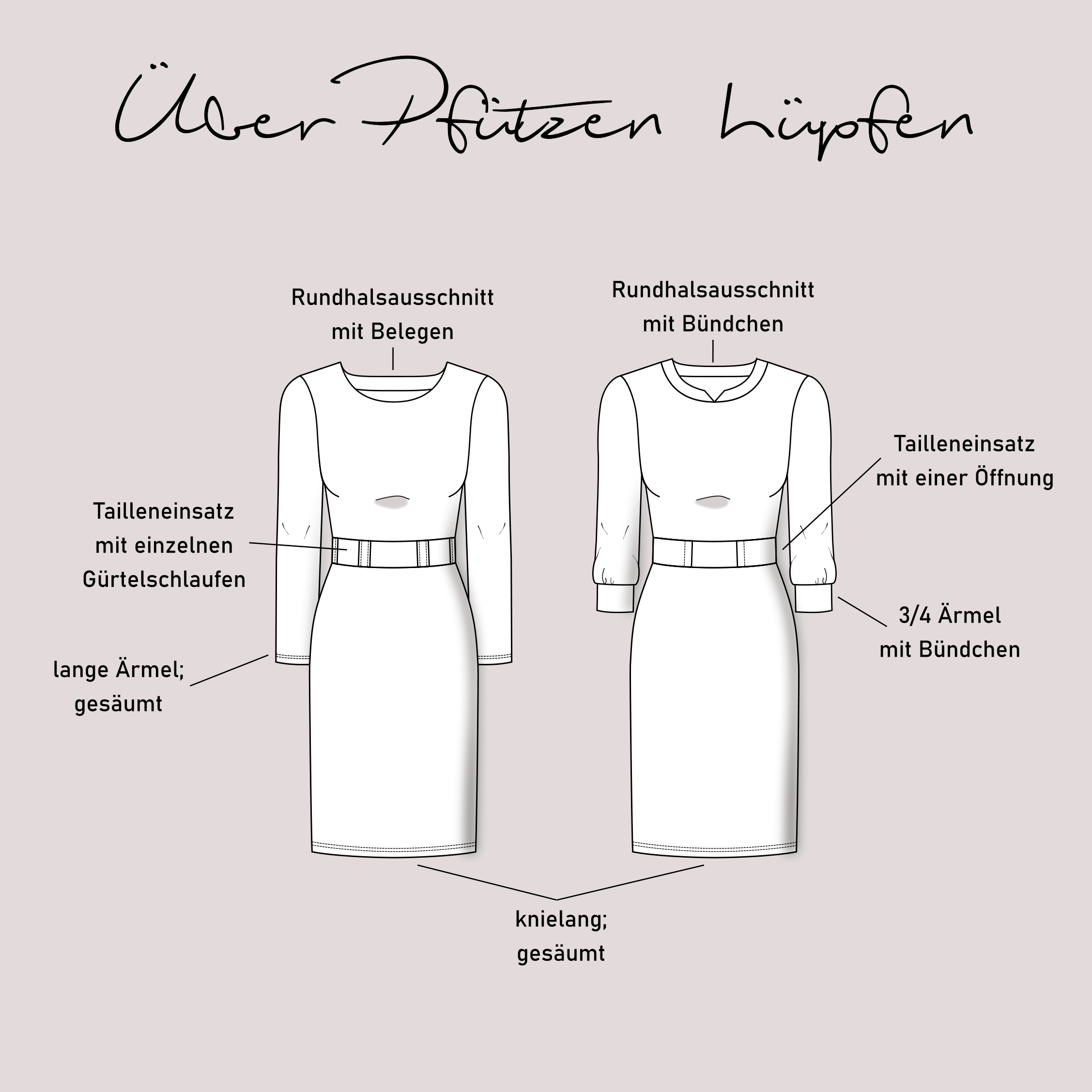 Dieser Schnitt für ein elegantes Kleid aus Maschenware mit langen und 3/4-Ärmeln, zwei Halsausschnitt-Varianten und zwei Gürtelschlaufen-Varianten, welches du sowohl zu festlichen Anlässen als auch als Business Outfit im Büro tragen kannst, trägt den schönen Namen "Über Pfützen hüpfen". Das Schnittmuster beinhaltet natürlich eine ausführliche Anleitung und die Damen Größen 32 - 62 und wird dir nach dem Kauf als Sofort Download in PDF Format zur Verfügung gestellt.