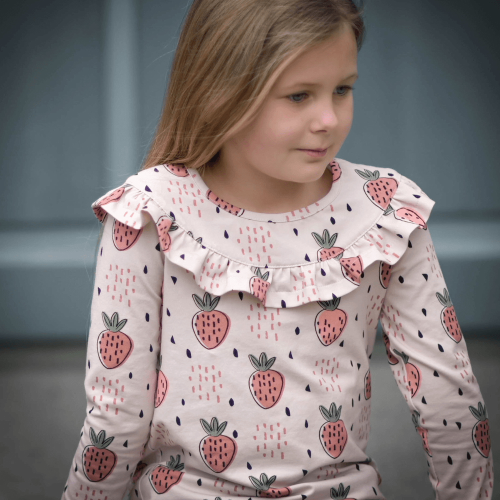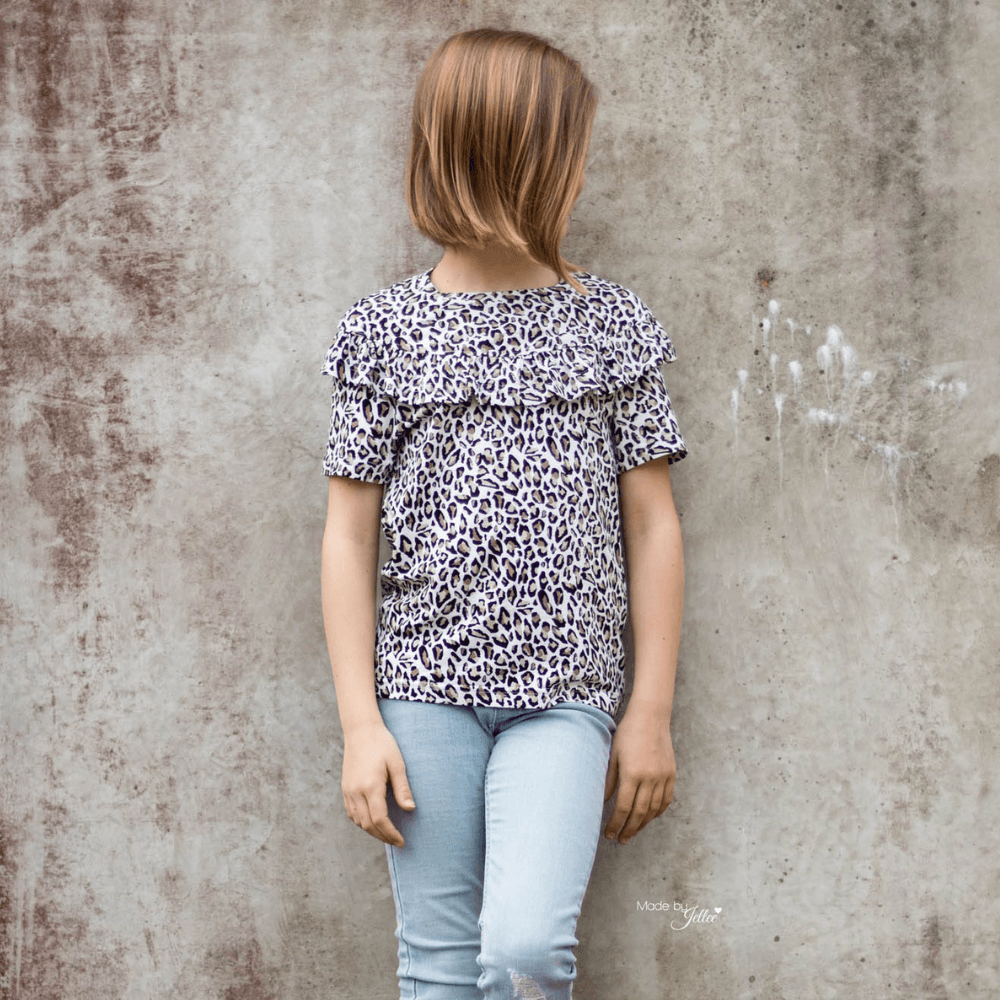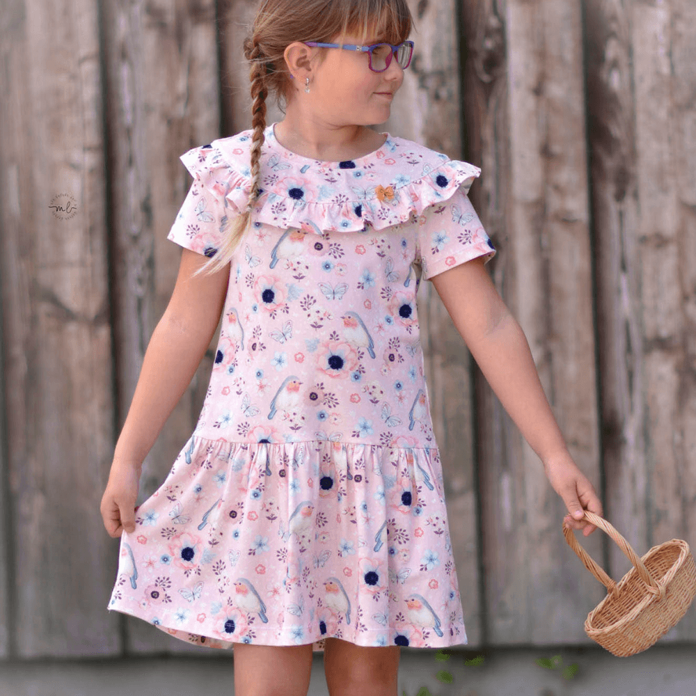 Die Valeria kann als Shirt oder Kleid wahlweise mit kurzen oder langen Ärmeln genäht werden. Durch die Teilung im Oberteil ist das Schnittmuster perfekt geeignet um Panele (auch in grossen Größen) zu verarbeiten. Die geraffte Rüsche verleiht dem Schnitt einen romantischen Touch. Die Größe 74 - 86 wird mit Knopfleiste im Rückenteil genäht, alle weiteren Größen mit normalem Halsbündchen.
