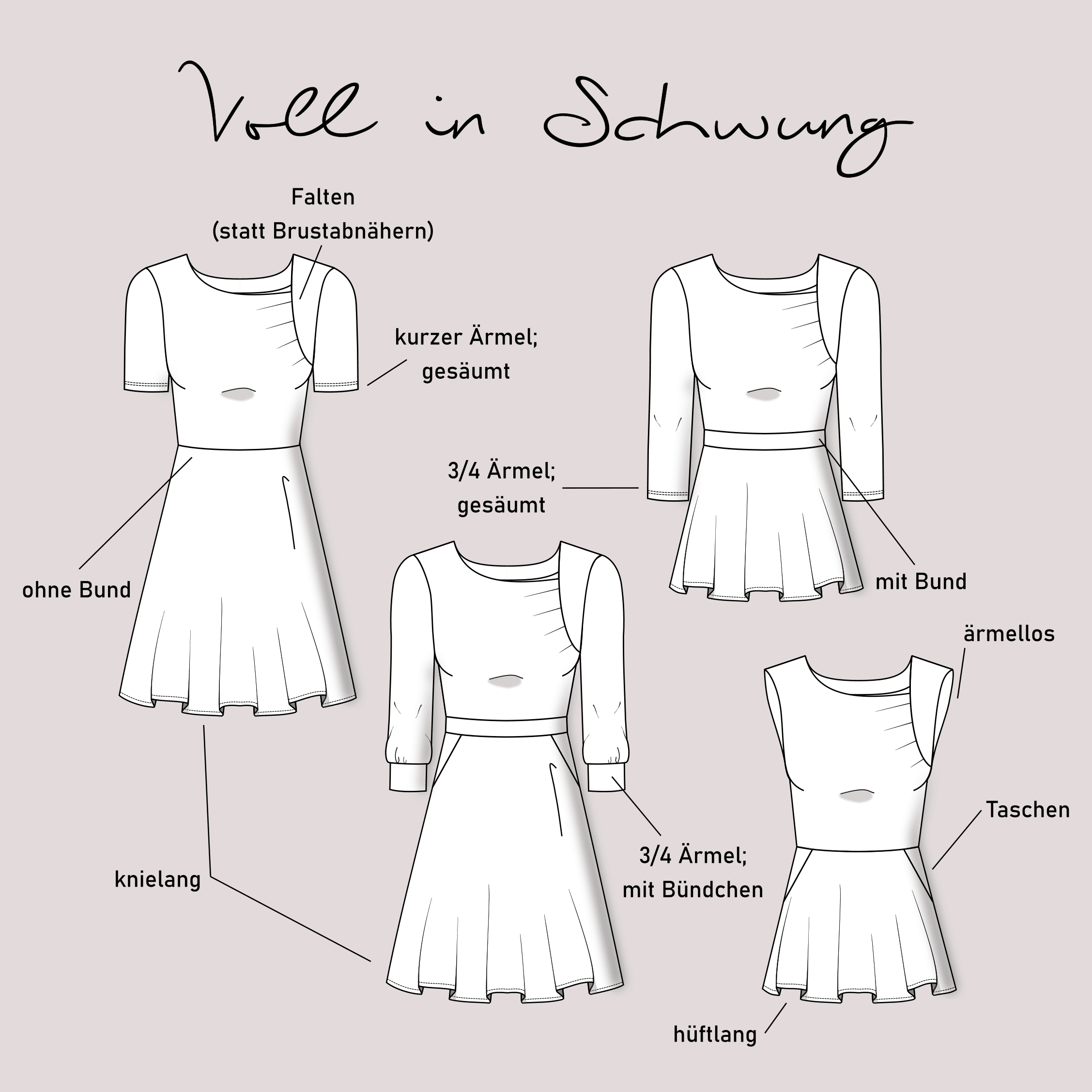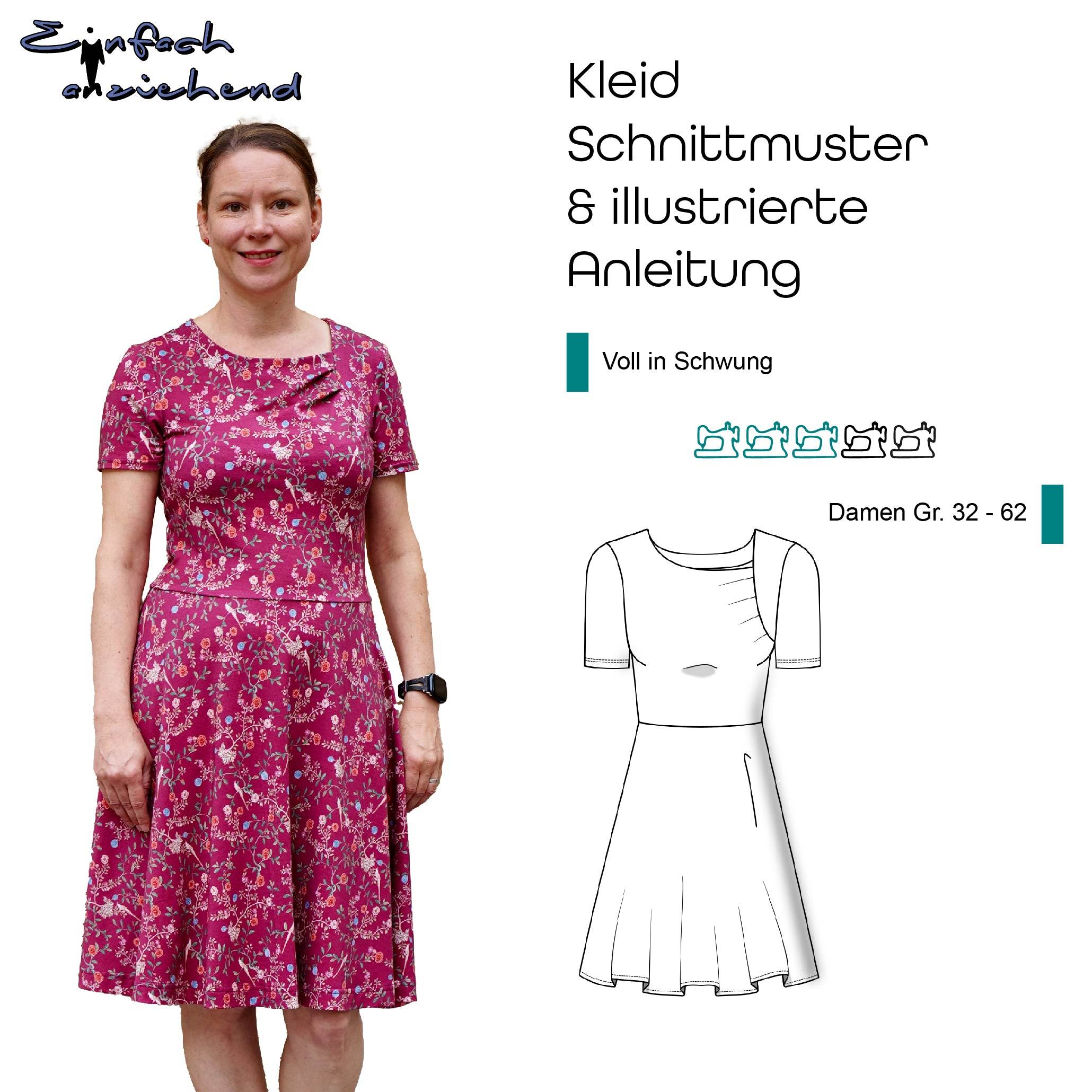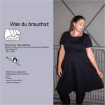 Dieser Schnitt für ein Kleid aus Maschenware mit 3/4-Ärmeln oder ärmelloser Version, zwei "Rocklängen" (durch die kurze entsteht ein Oberteil) und optionalen Taschen, trägt schönen Namen "Voll in Schwung". Das Schnittmuster beinhaltet natürlich eine ausführliche Anleitung und die Damen Größen 32 - 62 und wird dir nach dem Kauf als Sofort Download in PDF Format zur Verfügung gestellt.