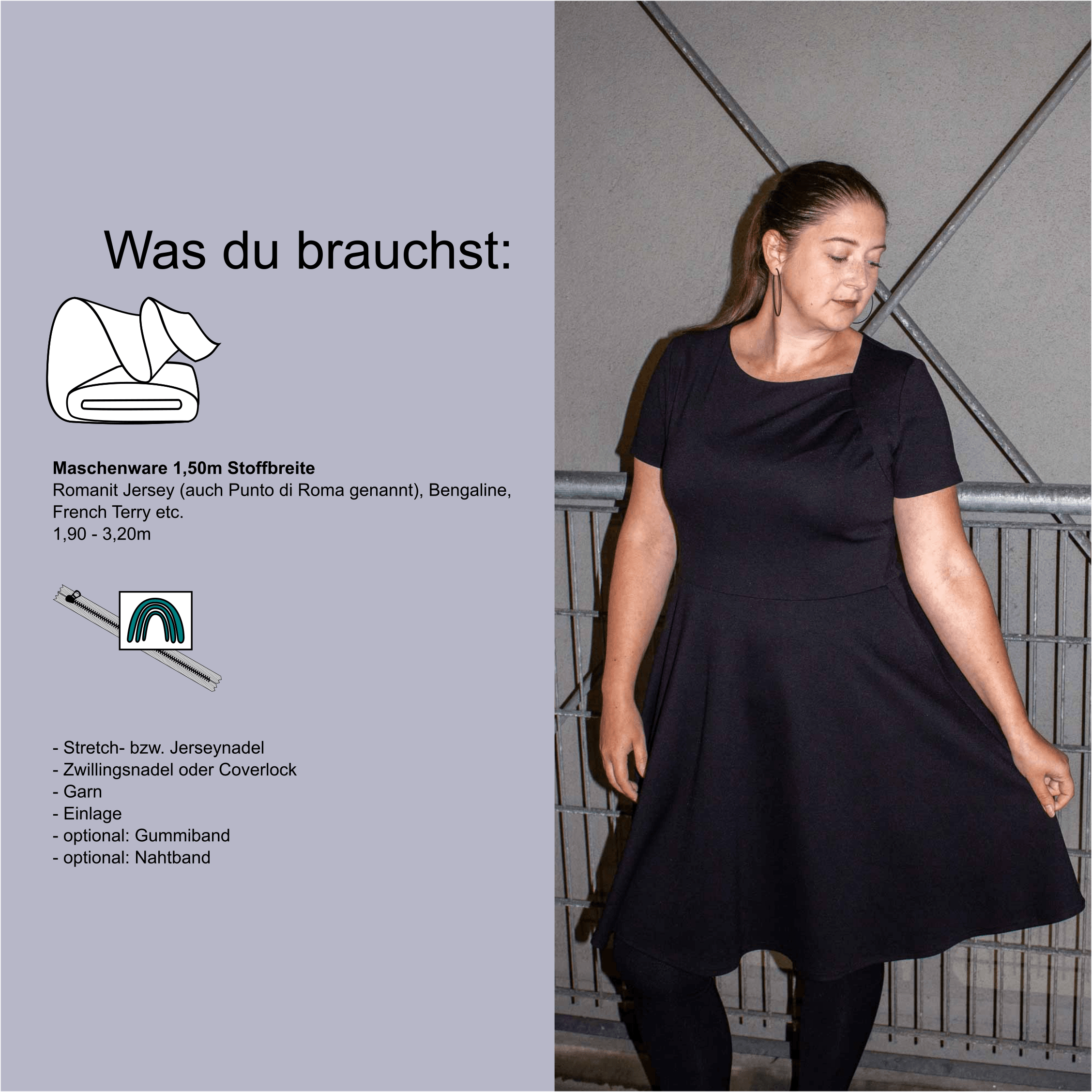 • Als Material eignen sich Romanit Jersey (auch Punto di Roma genannt), Bengaline, French Terry etc.