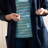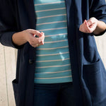 Hinweis: Die Innennähte des Cardigans bleiben sichtbar, was ihn anfängerfreundlich macht. Achte darauf, mit passendem Garn zu nähen und verwende einen Overlockstich. Für erfahrene Näher:innen bietet sich die Möglichkeit, die Nähte mit einem »Streberstreifen« zu verdecken, um ein besonders sauberes Finish zu erzielen.