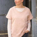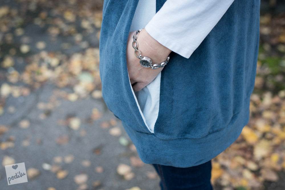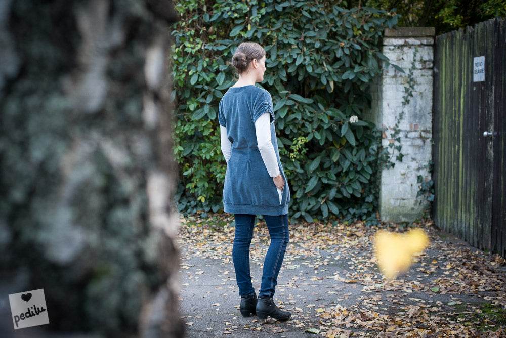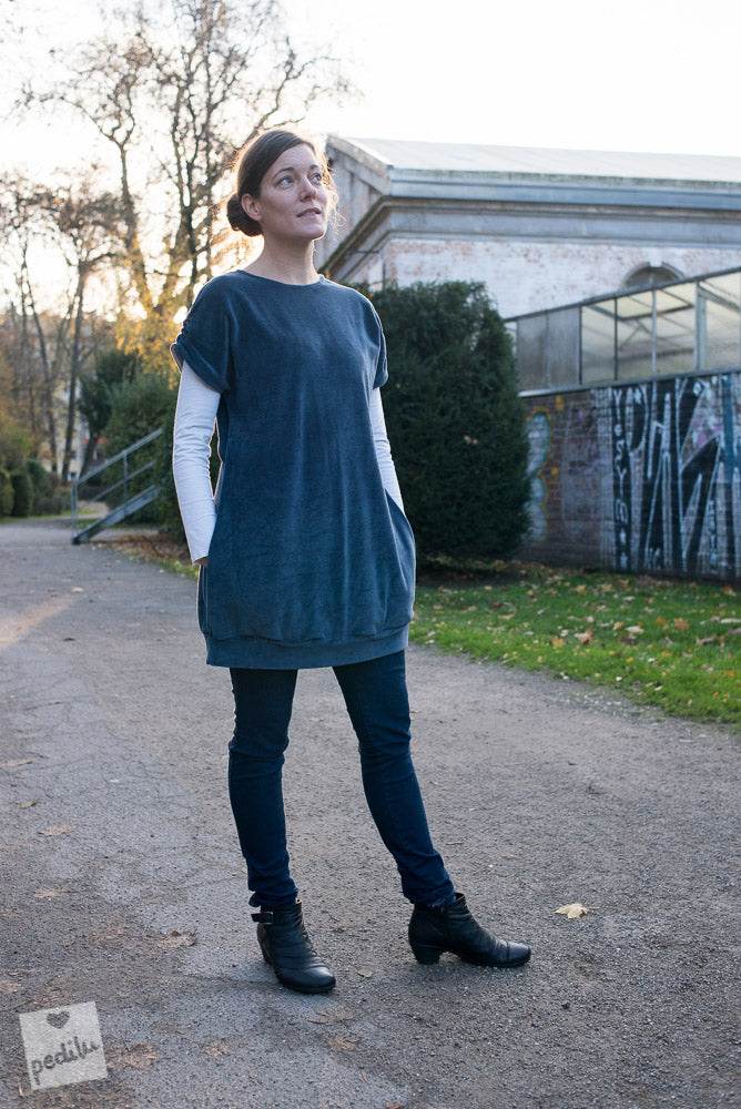 Der »LaPullunda« ist ein lässiger Long-Pullunder mit angeschnittenen Ärmeln und einem leicht tulpigen Schnitt. Er ist weit genug, um ihn bequem über ein langärmeliges Oberteil zu tragen. Der Clou des Schnitts ist die durchgehende, innenliegende Kängurutasche und für eine verspielte Note die optionale Raffung an den Ärmeln. Ob aus kuscheligem Nicki für gemütliche Tage, aus Sweat für einen sportiven Look oder als leichte Jersey-Variante für ein Sommerkleid – mit »LaPullunda« bist du in jeder Saison perfekt gestylt.