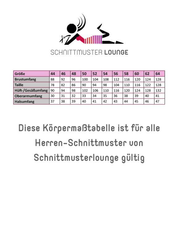 Bei dem Herren- und dem Kindermodell ist ein einfacher Innenslip im Schnitt enthalten. Der Schnitt ist bequem und angenehm weit aber nicht oversize. Nahttaschen gehören zu einer Freizeithose einfach dazu. Diese klaffen auch nicht auf, da sie im Bund gefasst sind. Gesäßtaschen sind optional. Eine optionale Passe ist an der Hinterhose eingezeichnet.