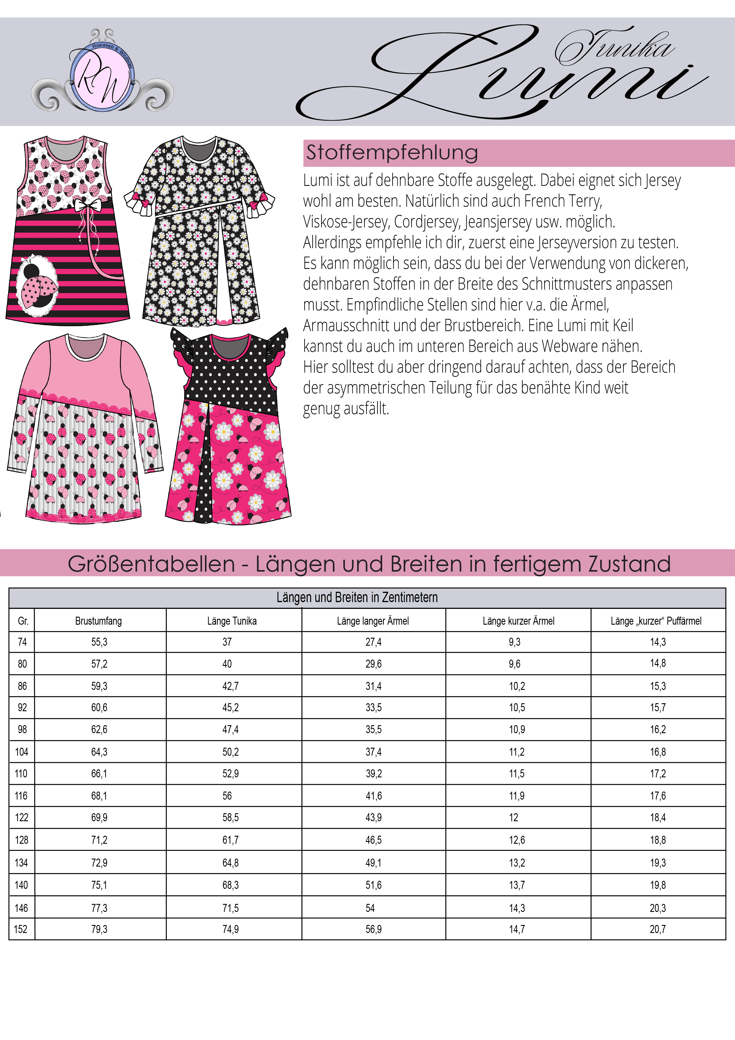 Das Schnittmuster ist in Echtgröße (du nähst hier nach echter Körpergröße) gradiert und enthält keine Nahtzugabe. Es umfasst die Größen 74 bis 152 und ist damit für eine Körpergröße zwischen 74 und 157cm geeignet. In den Dateien findest du die A4-Versionen zum Ausdrucken, eine Großdruck-Datei sowie die Beamerdatei - alle Versionen inkl. Ebenen zum Ein- und Ausblenden der Größen. Lumi ist auf Jersey ausgelegt.