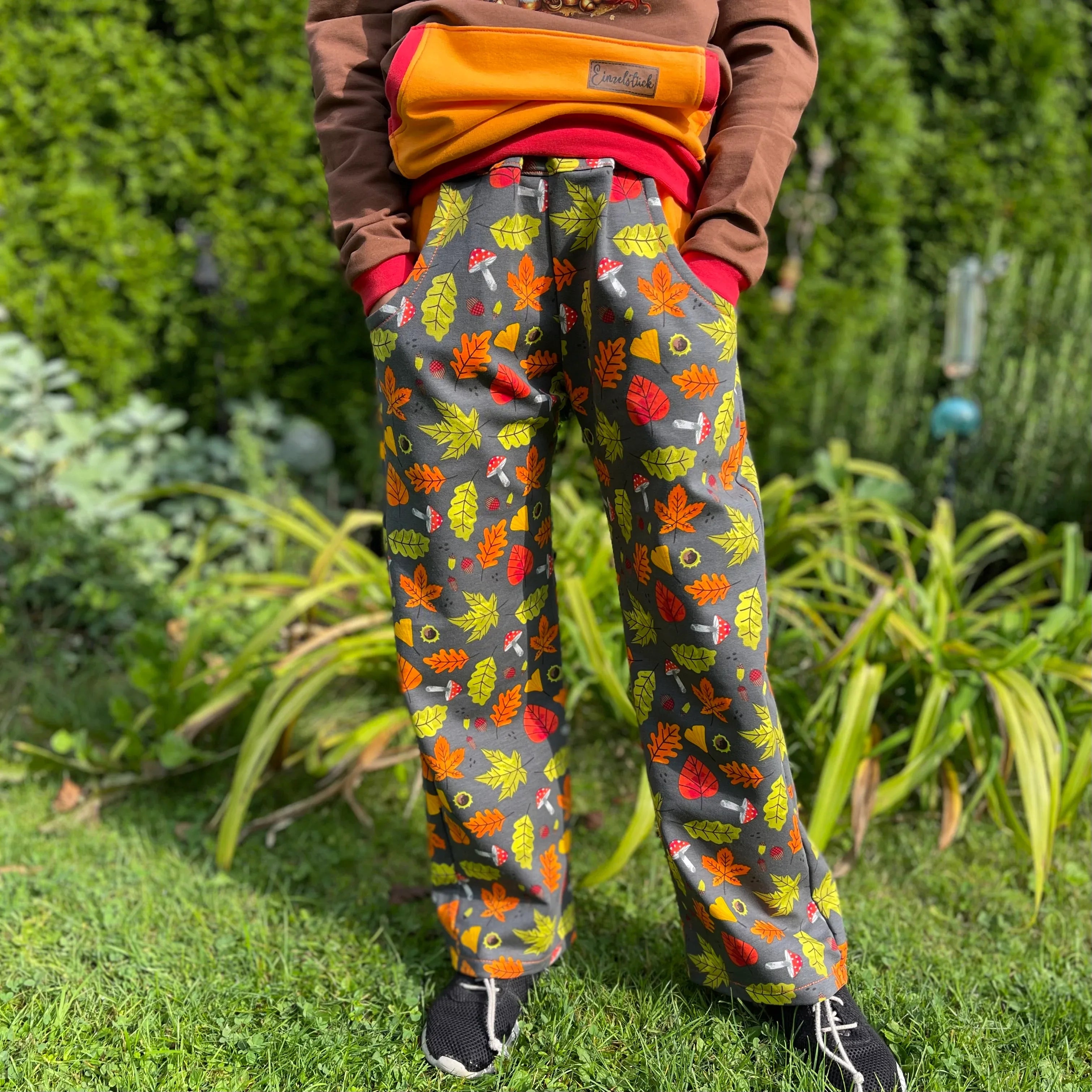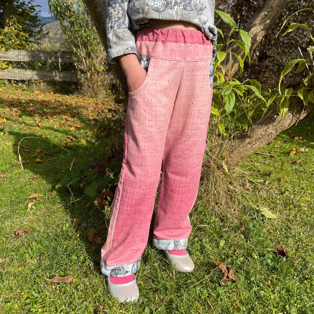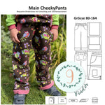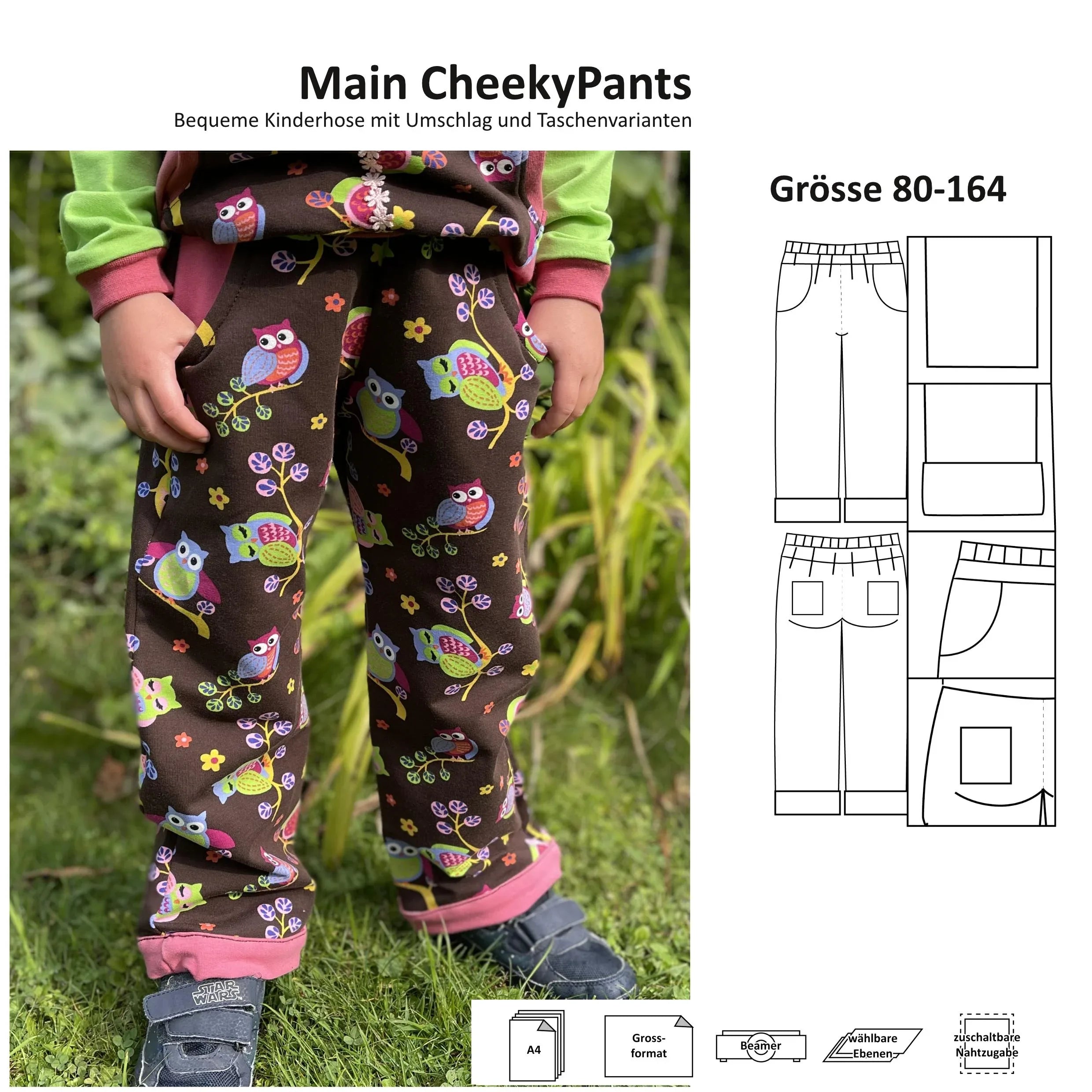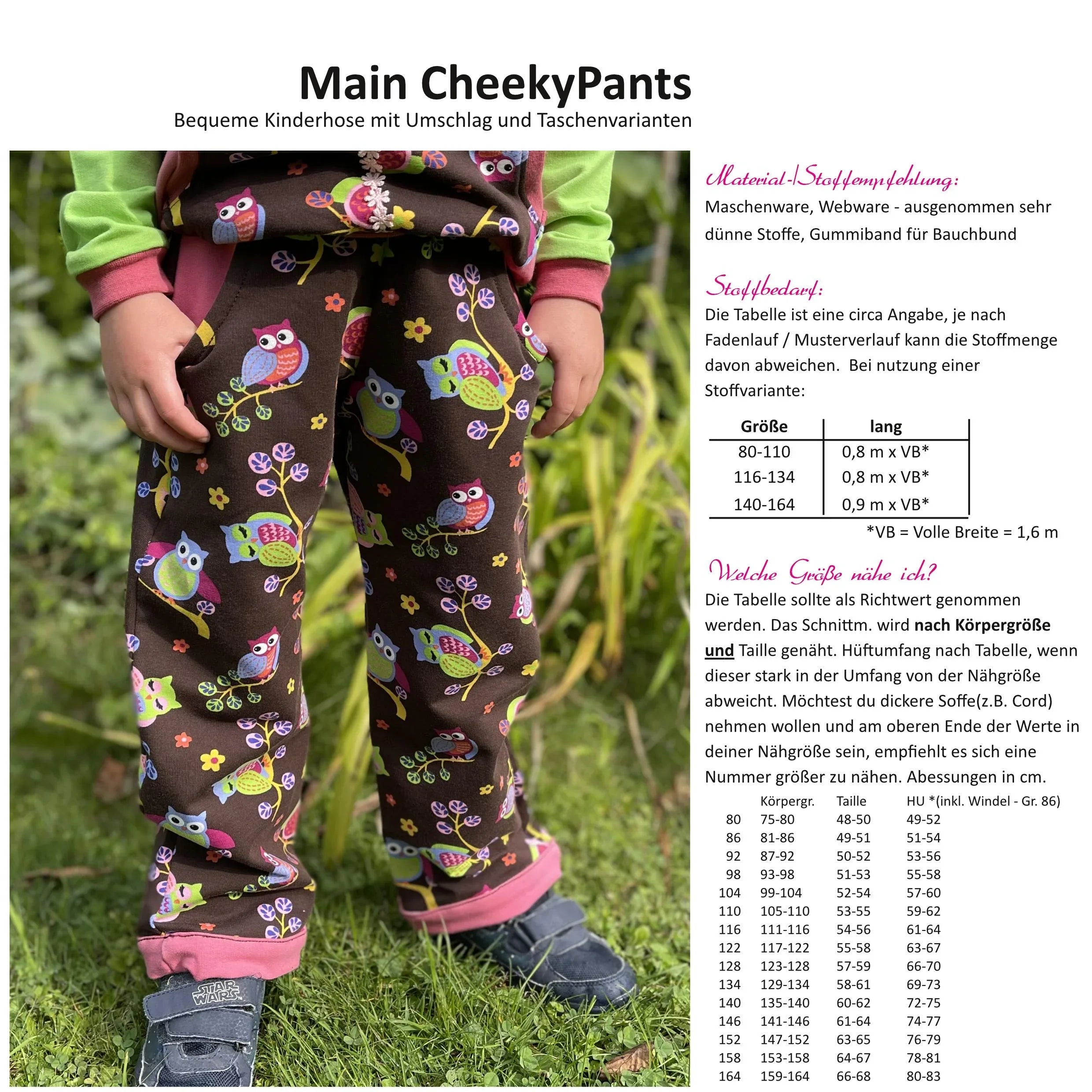 Die Main CheekyPants ist insbesondere oben weit und bequem geschnitten, damit sich dein Kind frei bewegen kann und nichts stört. Der Bund ist gerafft und sitzt mit dem Gummiband bequem auf Taillienhöhe. Allgemein ist die Hose im oberen Bereich weit gehalten. Die Beine sind gerade geschnitten und kann unteren mit einem Umschlag genäht werden. Vorne gibt es zwei praktische Eingriffstaschen, ideal für Fundstücke unterwegs. Optional sind Potaschen sowie ein Zwickel möglich.