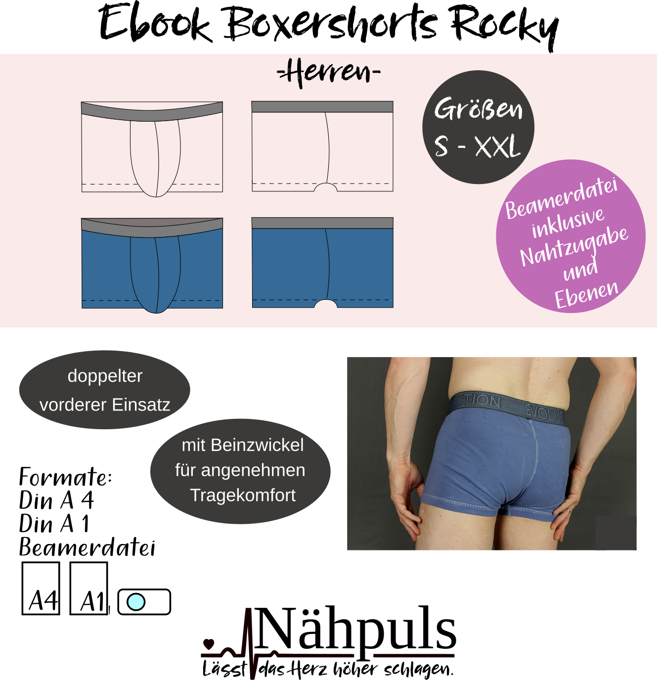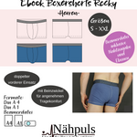 Nutzungsrecht: Der Verkauf genähter Kleidungsstücke nach dem Ebook Männer Boxershorts Rocky ist in einer Kleinserie von bis zu 20 Exemplaren gestattet. Weitergabe, Tausch oder Vervielfältigung von Schnittmuster oder Tutorial ist verboten. Alle Rechte liegen bei Nähpuls.