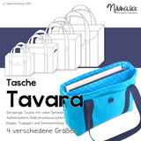 Tavara ist eine gräumige Tasche mit vielen Optionen. Du kannst sie von der einfachen Shopper-Tasche ohne Schnick-Schnack bishin zur Tasche mit Klappe, Außensteckfächern, Reißverschlussfach und Inneneinteilung . Auch eine Befestigung für einen Schultertragegurt kannst du einnähen. Du kannst zwischen 4 verschiedenen Größen wählen: S (28 cm x 21 cm), M (36 cm x 27 cm), L (44 cm x 33 cm) und XL (52 cm x 39 cm).