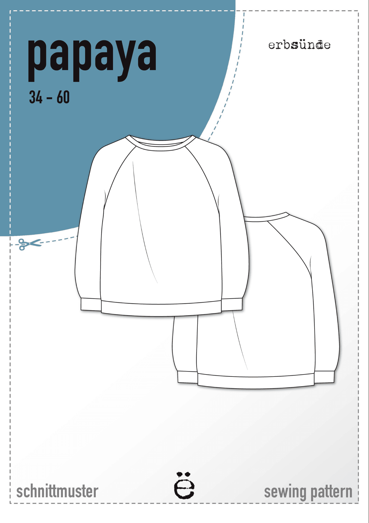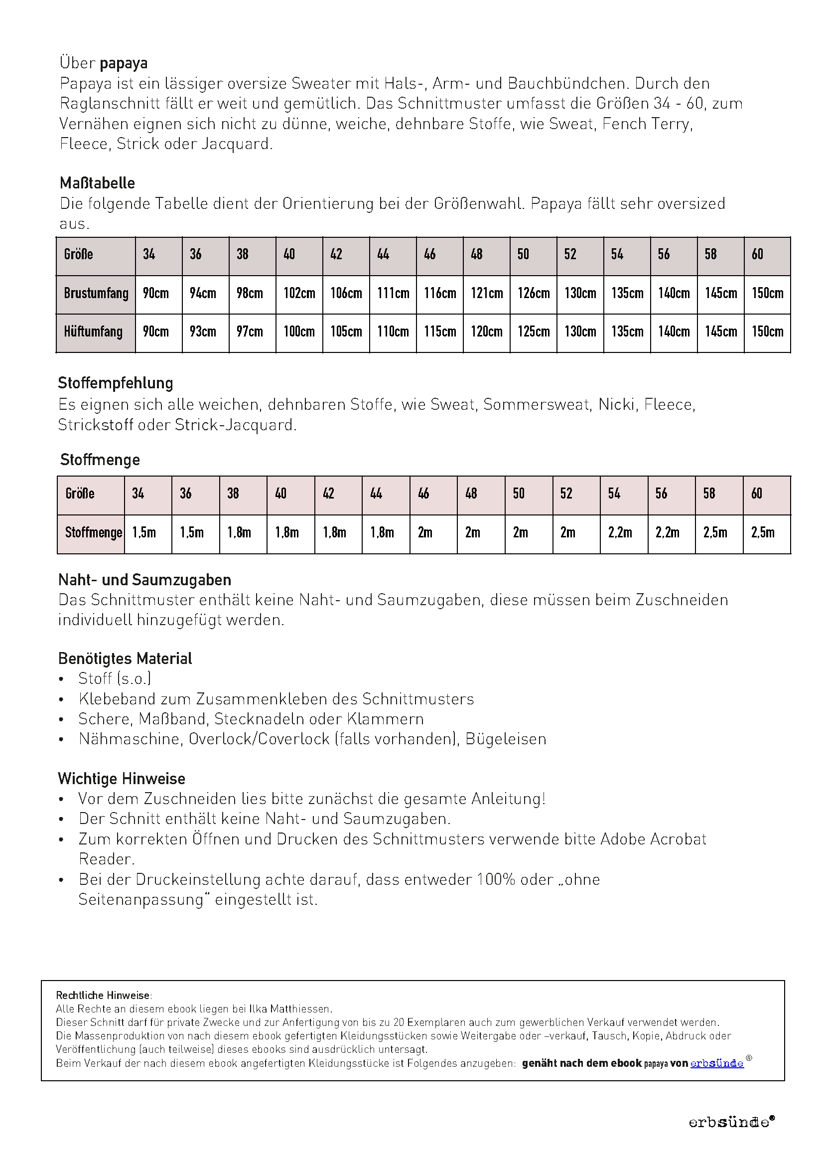Die Massenproduktion von nach diesem Schnittmuster gefertigten Kleidungsstücken sowie Weitergabe oder -verkauf, Tausch, Kopie, Abdruck oder Veröffentlichung (auch teilweise) dieses Schnittmusters sind ausdrücklich untersagt. Beim Verkauf der nach diesem Schnittmuster angefertigten Kleidungsstücke ist Folgendes anzugeben: Genäht nach dem Schnittmuster “Papaya” von erbsünde.