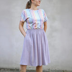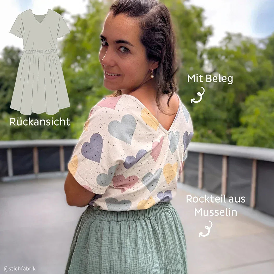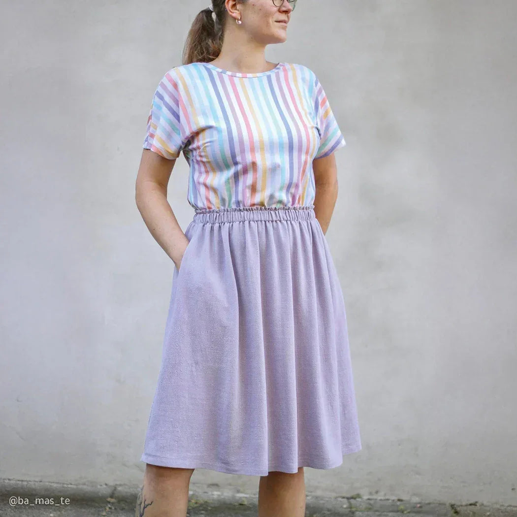 Das Paperbag Duett ist ein sportlich-feminines Schnittmuster für ein Kleid und ein Shirt mit lockerem Schnitt, das aus dehnbarem Jersey genäht wird. Es hat überschnittene Schultern, einen angesetzten Rock mit Paperbag-Bund und Brustabnäher für eine schöne Passform. Der Rockteil kann wahlweise aus Jersey oder aus luftigem Musselin gearbeitet werden. Für zusätzlichen Komfort lassen sich optionale Nahttaschen integrieren. Der V-förmige Rückenausschnitt ist ein besonderes Detail und kann entweder mit einem sportlichen Bündchen oder mit einem Beleg verarbeitet werden – je nachdem, welchen Look du bevorzugst. Das Oberteil ist ausserdem separat als tailliertes "slim fit" oder lockeres Shirt "relaxed fit" im Schnittmuster enthalten und ist damit ein vielseitiges Basic für deine Garderobe.