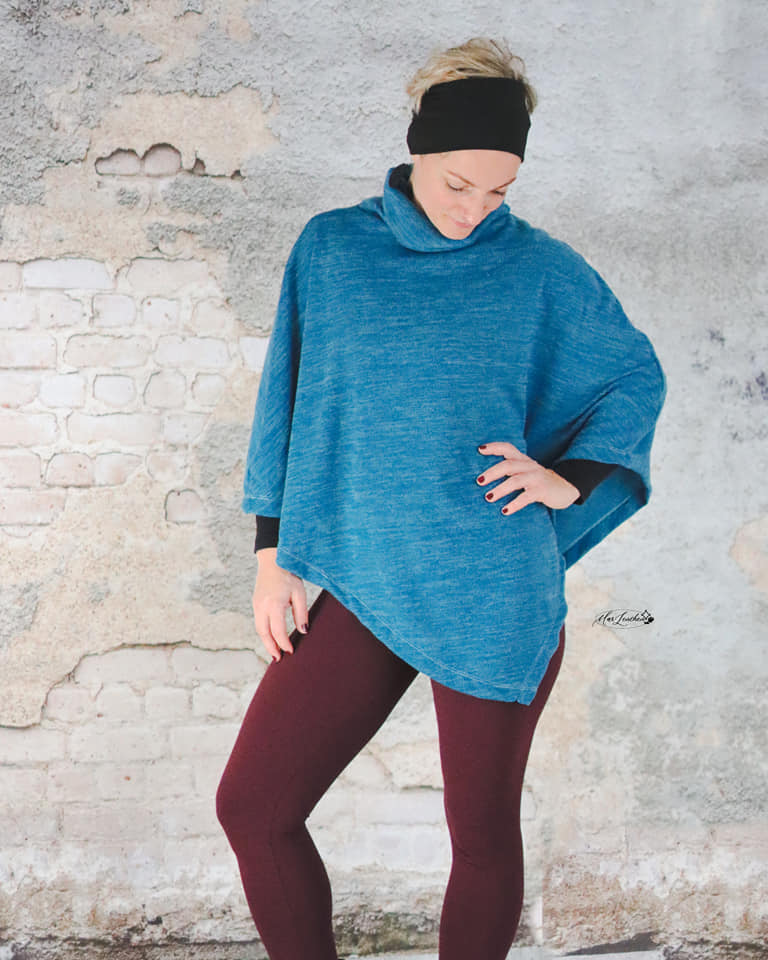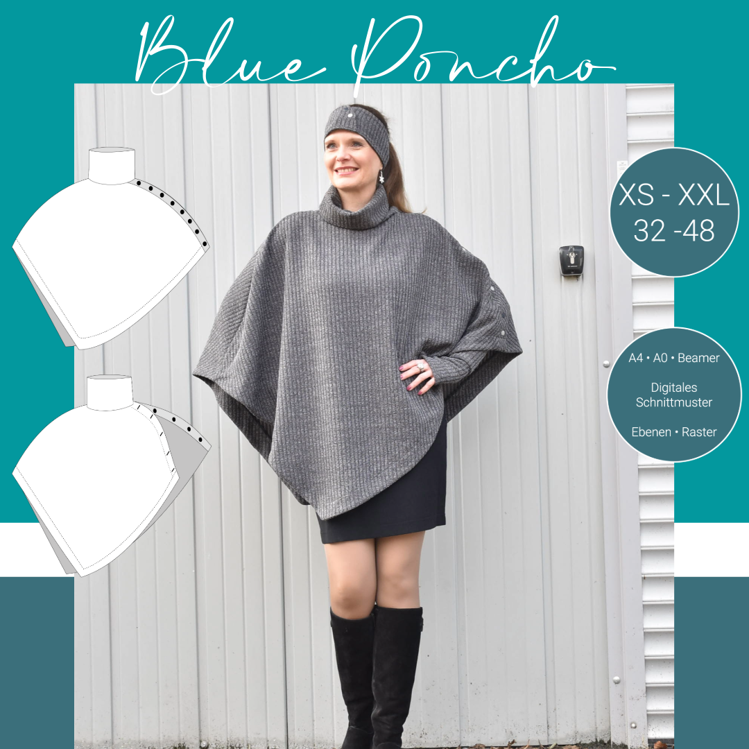 Durch den einzigartigen asymmetrischen Schnitt ist der BluePoncho alles andere als langweilig. Mit den Belegenbekommst du einen sauberen, professionellen Abschluss. Alternativ kannst du auch einen Rollsaum oder eine einfache Versäuberung wählen, um deinem Poncho einen individuellen Touch zu verleihen.