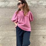 Feine Bindebänder am geschlitzten Ausschnitt und verspielte Puffärmel verleihen der Bluse dezente, aber wirkungsvolle Akzente. Die an die obere Passe gerafften Unterteile bringen eine luftige Leichtigkeit in dein Outfit. POPPY passt perfekt zu einem mühelos schicken Look, sei es im Büro oder in der Freizeit.