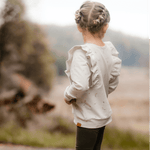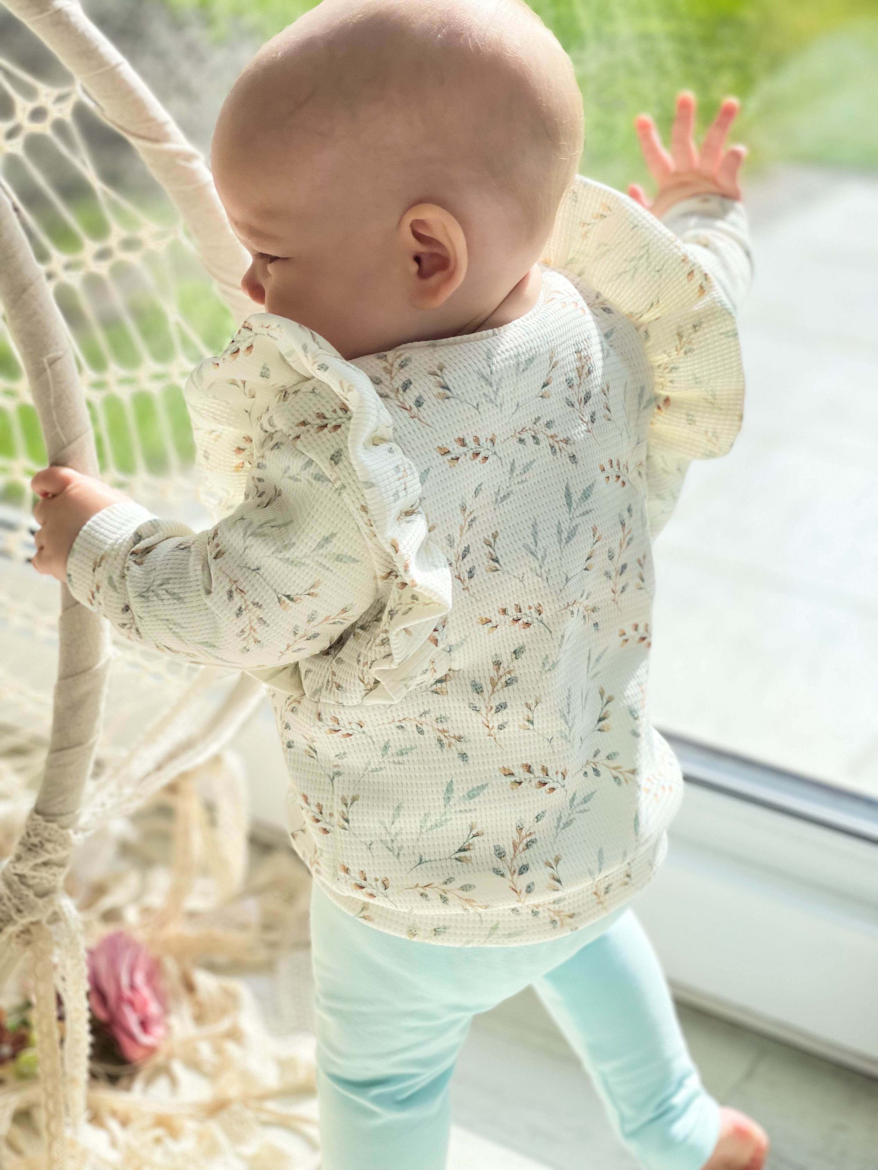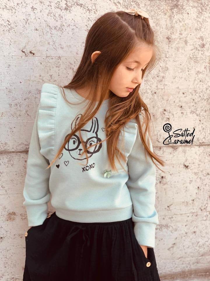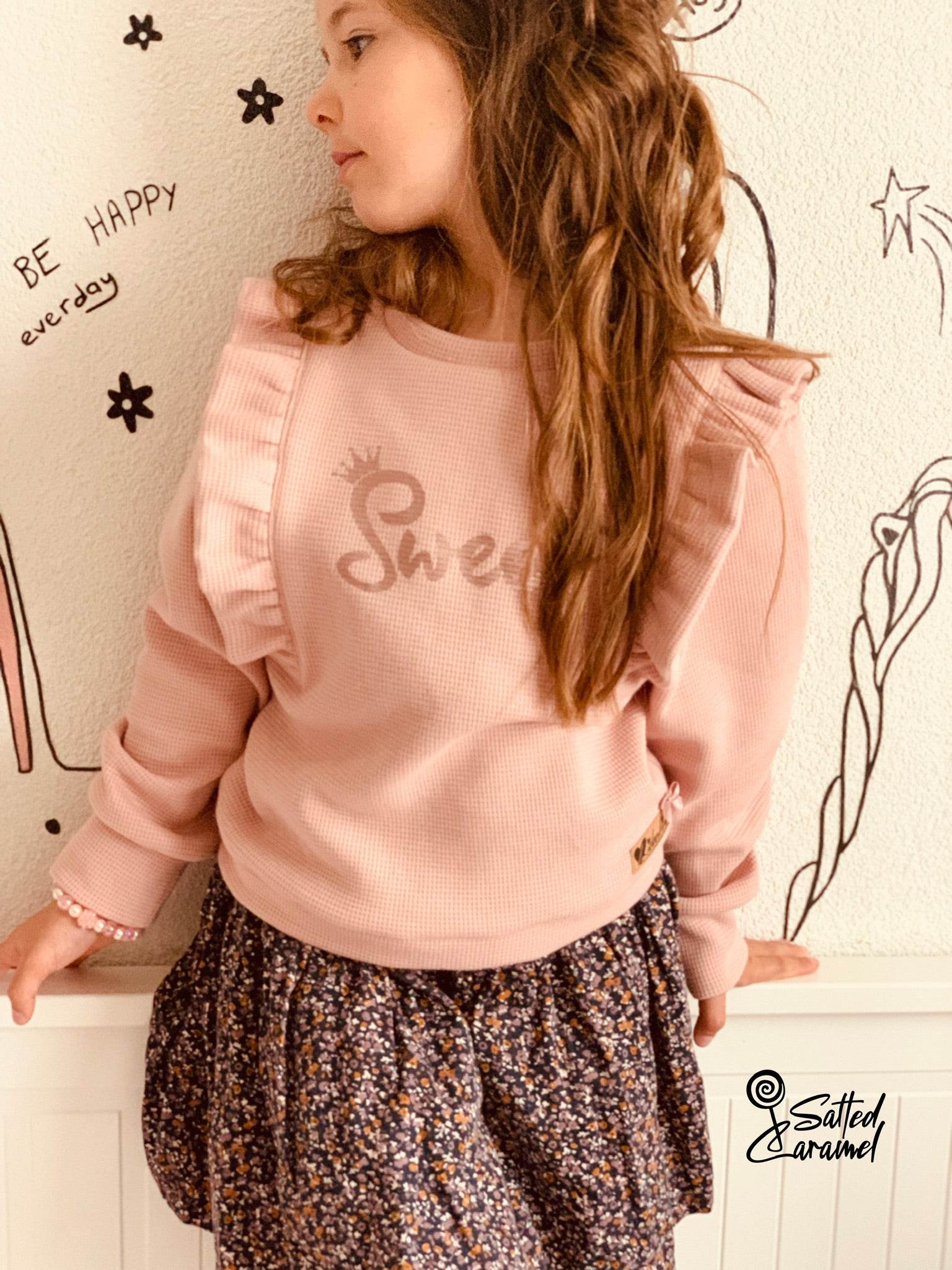 Der Sweater lässt sich in unterschiedlichen Varianten nähen. Du hast die Auswahl zwischen einem kurzen Sweater, der sich super mit einem Rock oder einer Shorts kombinieren lässt, und einem langen Sweater. Der Sweater lässt sich aus leicht dehnbaren Stoffen wie French Terry, Sweat, Jacquard etc. nähen. Die Armbündchen wurden als Faltbündchen designt, damit der Sweater noch ein wenig mit deinem Kind mitwachsen kann.