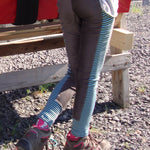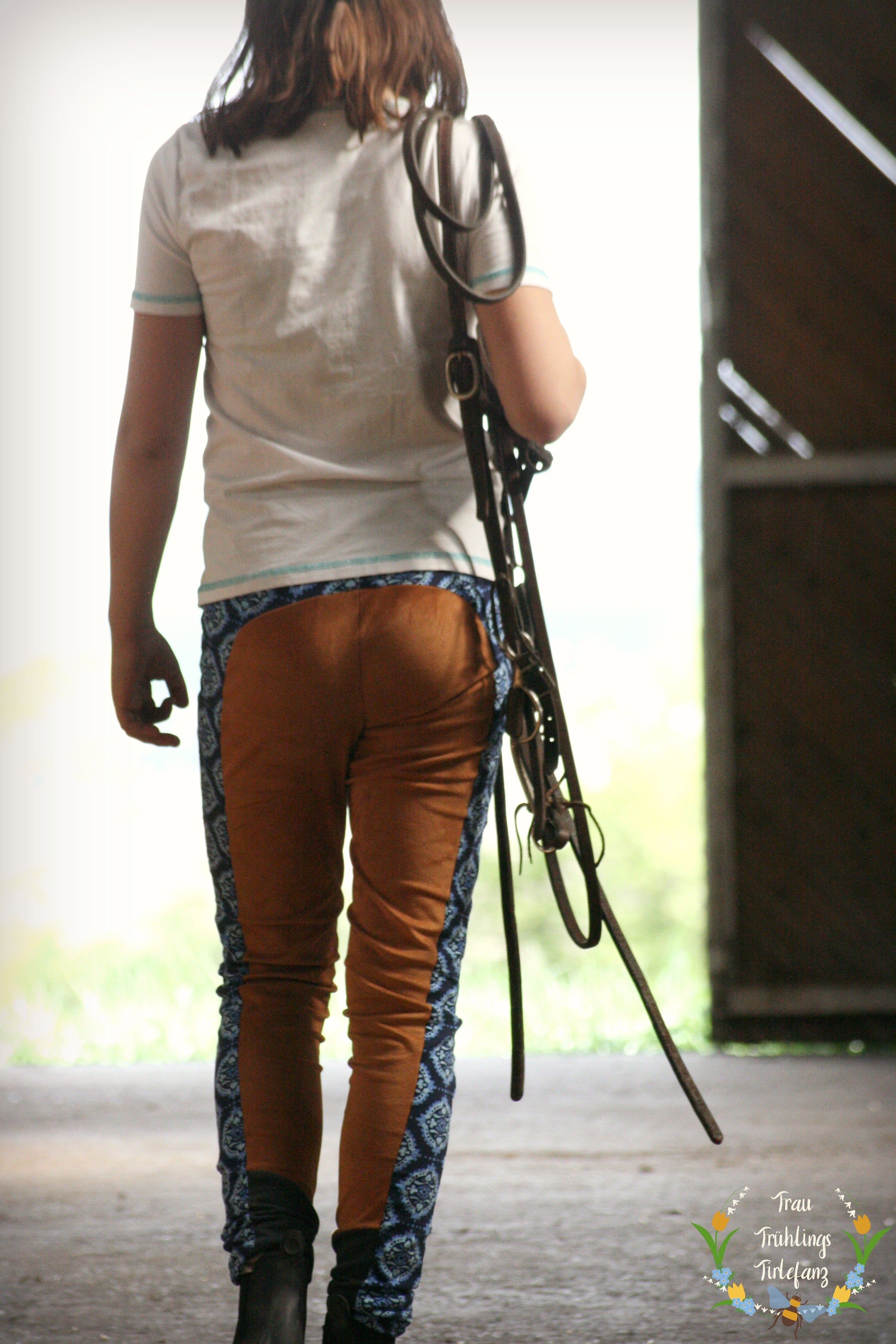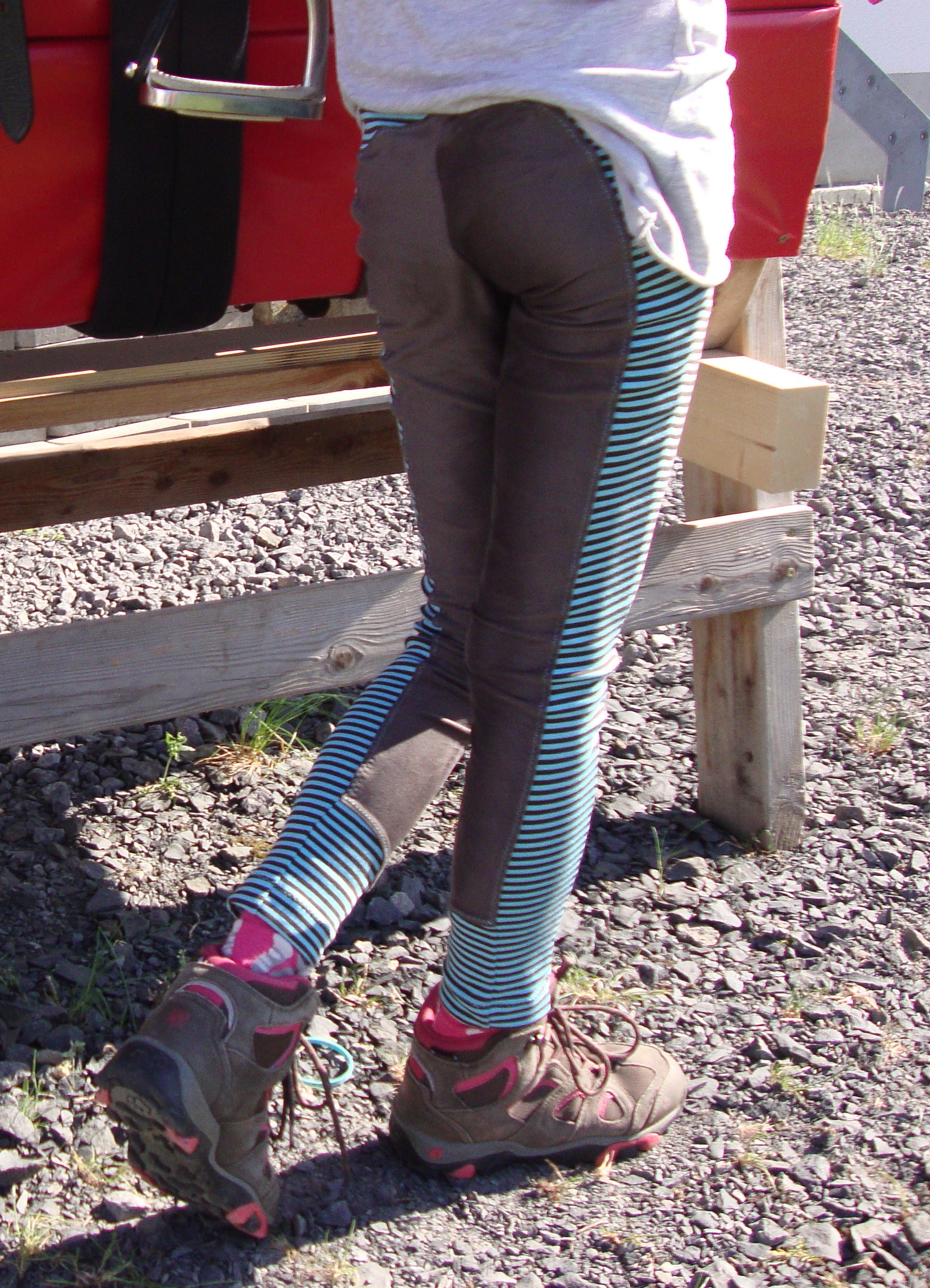 Wer eine Reithose nähen möchte, muss darauf achten, dass das Beinteil/Besatz aus rutschhemmenden Material, wie dehnbares Wildlederimitat, elastisches Waschleder oder Jeans mit Elasthan ect. ist. Das Vorder- und Rückteil bei der Reithose muss zwingend aus sehr elastischem Stoff, wie Jersey, Sommersweat oder Romanitjersey ect. genäht werden. Für eine Turnhose im Reithosenstil können Jersey oder Sommersweat verwendet werden. Die Reithose Ride On ist in den Größen 134 bis 170 gradiert und für normal bis schmal gebaute Mädchen geeignet. Der Bundabschluss wird mit 3 cm Gummiband genäht.