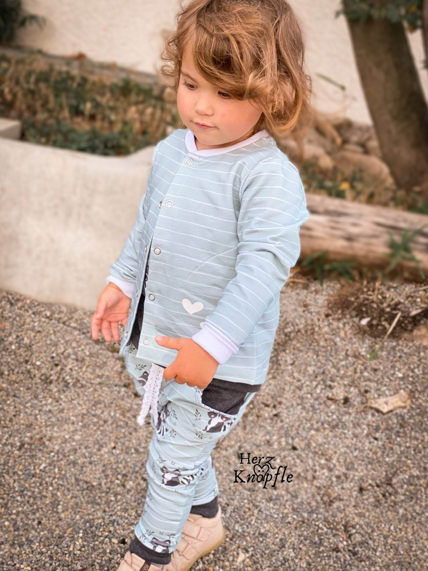 Im Probenähen sind sogar Beispiele aus Walk und Jeans entstanden. Wenn Du mit dickeren oder nicht dehnbaren Stoffen arbeiten, das Jäckchen füttern oder mehr als ein Shirt drunterziehen möchtest, empfehle ich Dir allerdings, ggf. eine Nummer größer zu nähen, je nachdem, wo sich der BU des Kindes in der Maßtabelle befindet.