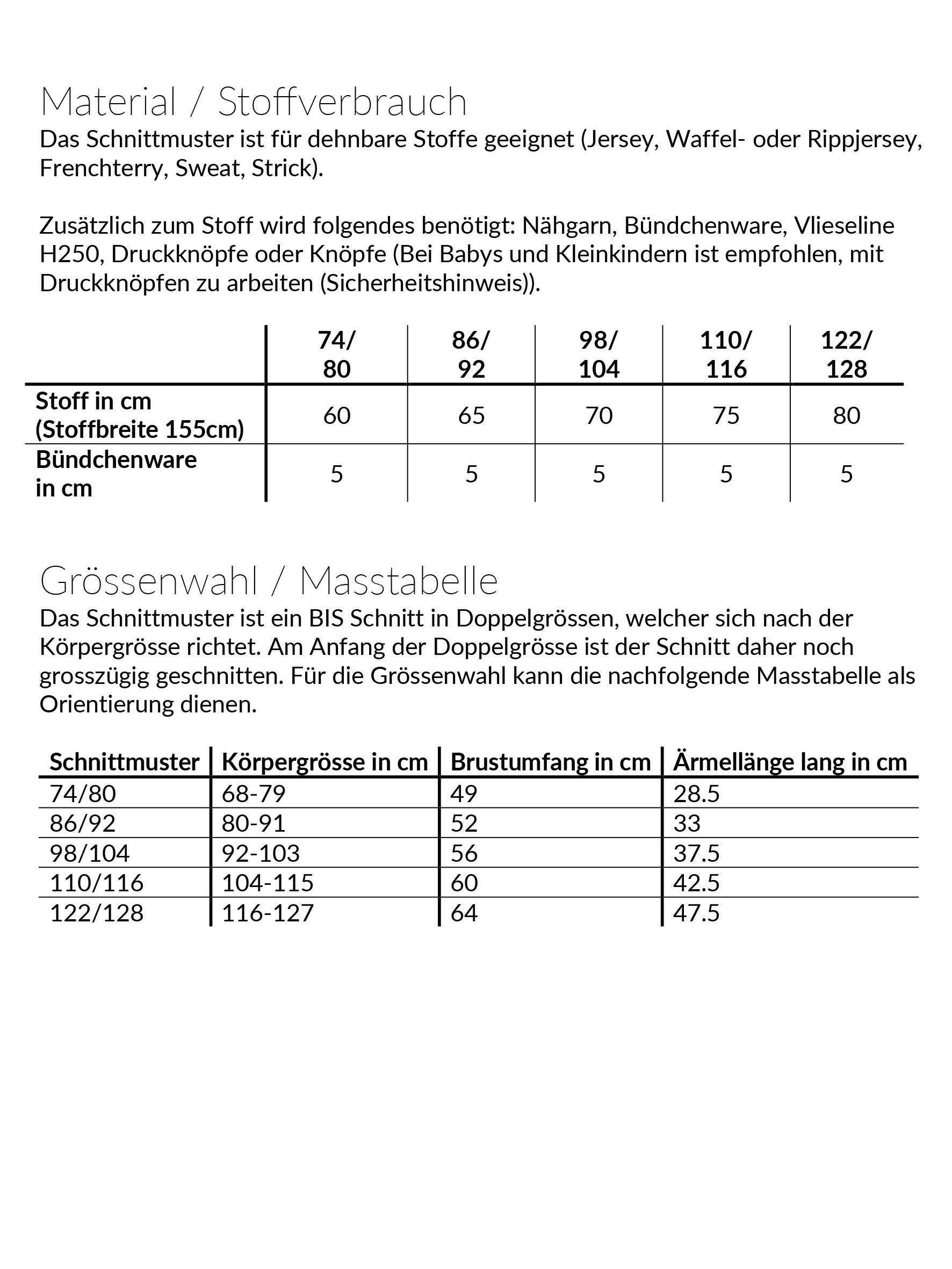 - Stoffempfehlung: French Terry, Sweat, Jersey, Ripp- und Waffeljersey etc.