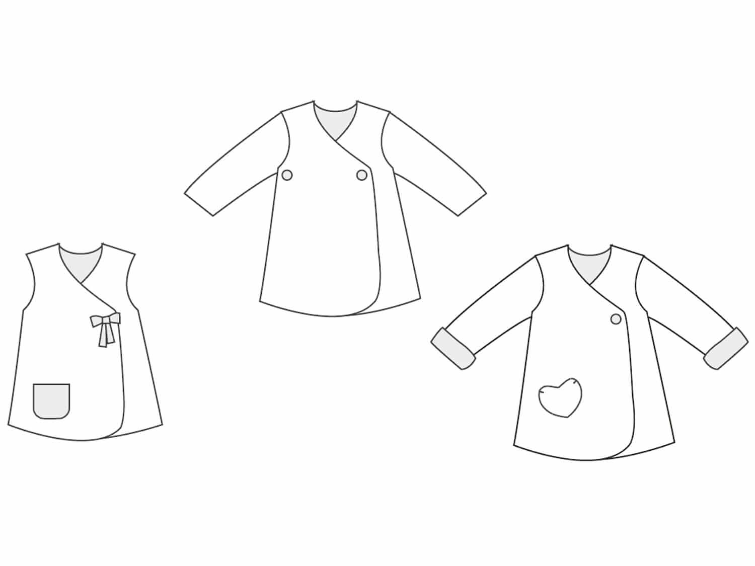 Mit diesem 2-in-1 Set nähst du ein verspieltes Wickelkleid mit weitem Rock sowie eine praktische Wendejacke, die du beidseitig tragen kannst. Ideal für Frühling, Herbst oder festliche Anlässe – je nach Stoffwahl schlicht, farbenfroh oder gemustert.