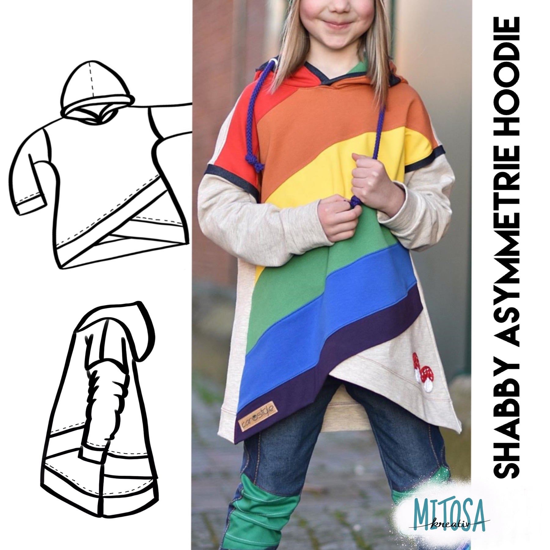 Auf der Suche nach einem stylischen und bequemen Hoodie-Schnittmuster für Kinder? Der Shabby Asymmetrie Hoodie überzeugt mit seinem einzigartigen, asymmetrischen Saum und der lockeren Oversized-Passform für maximalen Komfort und Bewegungsfreiheit. Wähle zwischen Hoodie mit Kapuze, Langarmshirt oder Kurzarmshirt – perfekt für jede Jahreszeit!