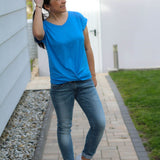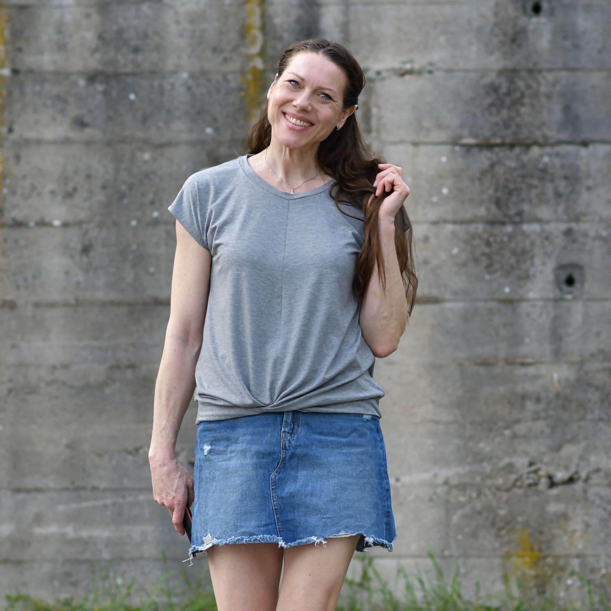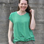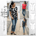 ATTING bekommst du in den Größen 34-54. Der Schnitt enthält zwei Längen, einen Rundhalsausschnitt und einen V-Ausschnitt. Im Vorderteil wird das Shirt am Saum mit einem Twist genäht.