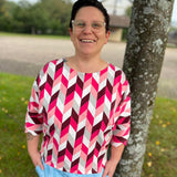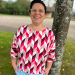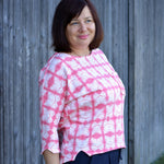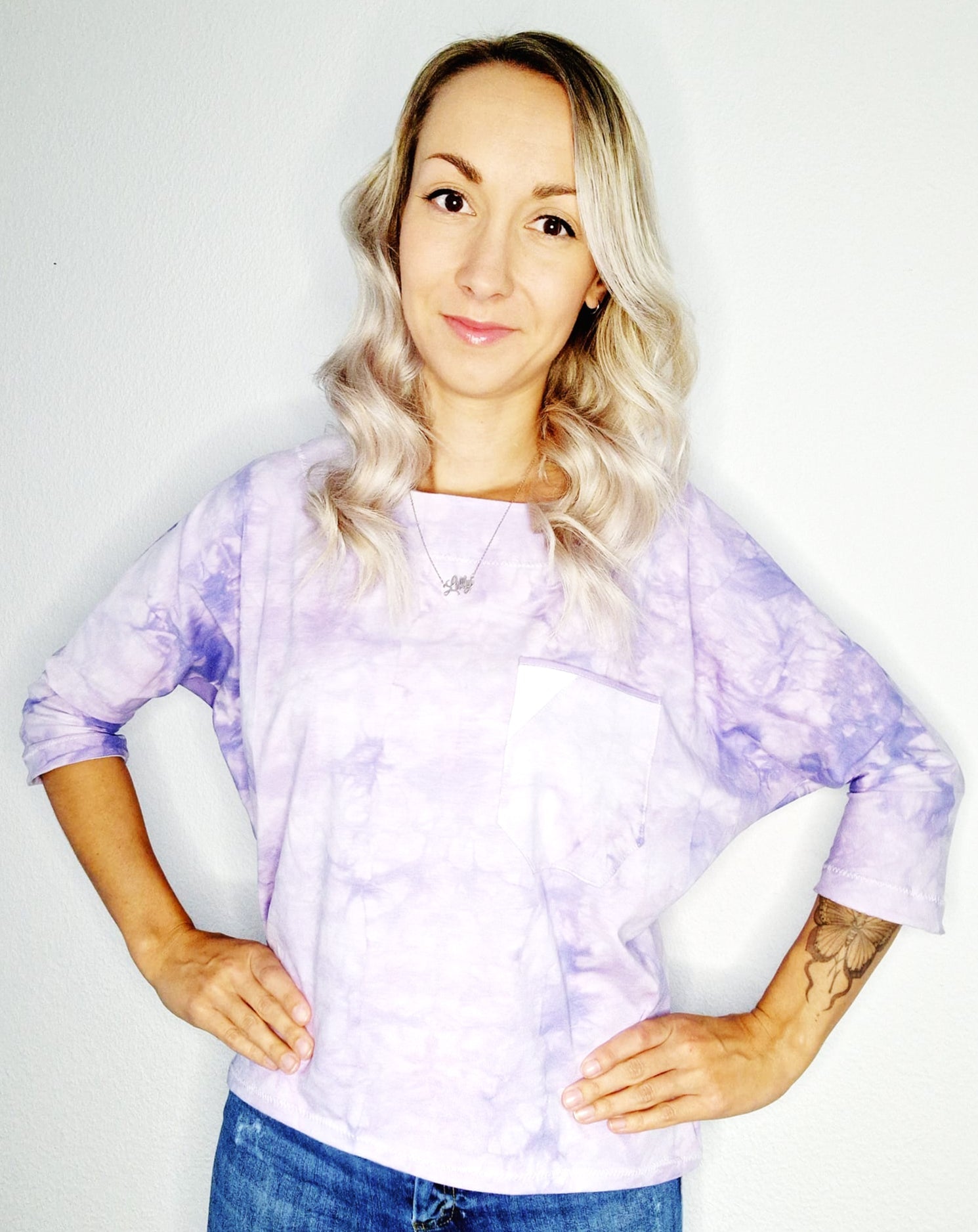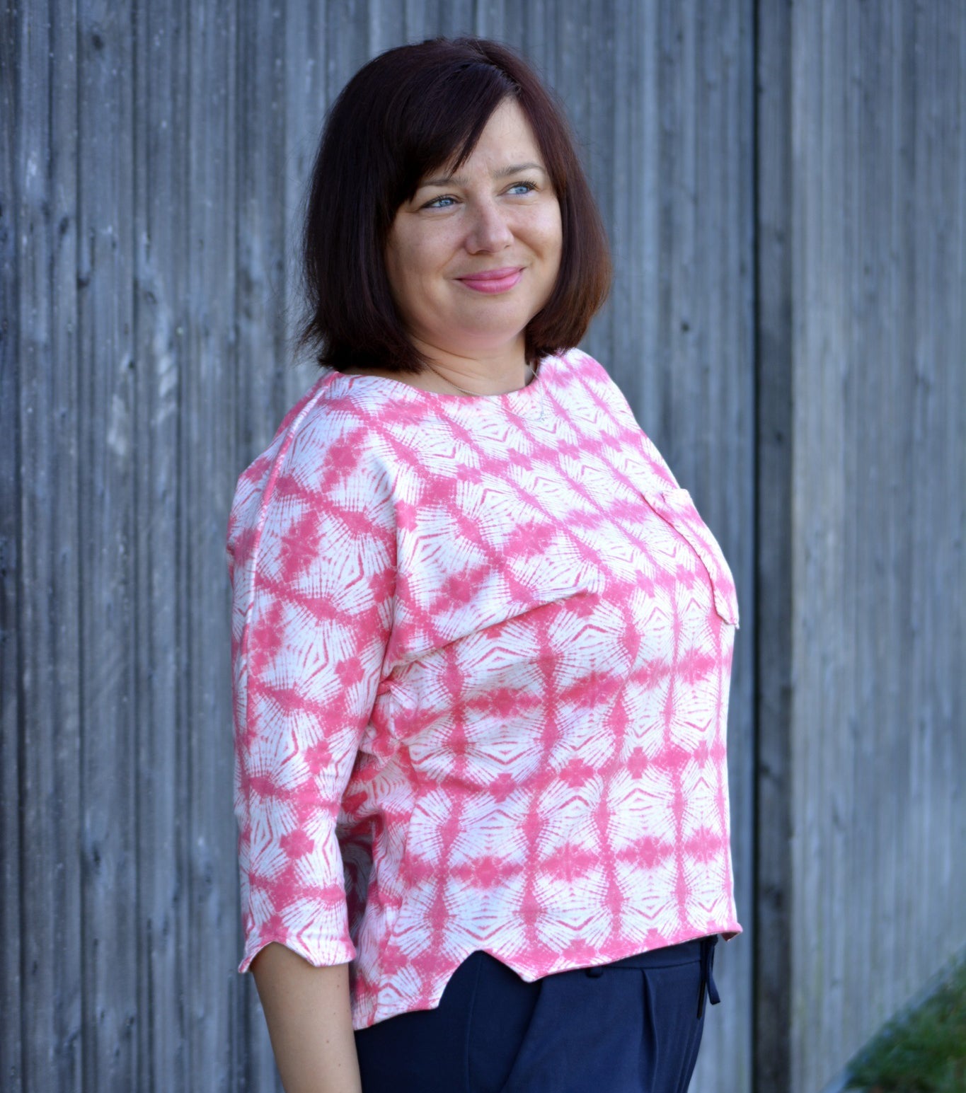 Das Shirt fällt leger und zeigt einen modernen Vokuhilalook, der durch die ¾-Ärmel und die Belege komplettiert wird. Optional kannst du das Shirt mit einer stylischen Brusttasche nähen, die ebenfalls mit Teilungen und CutOuts verziert werden kann.