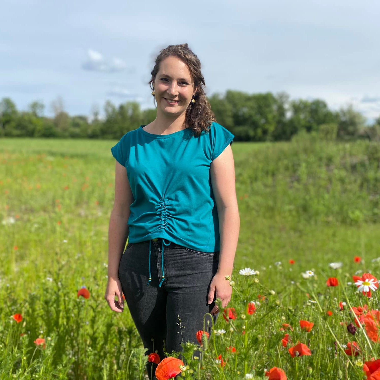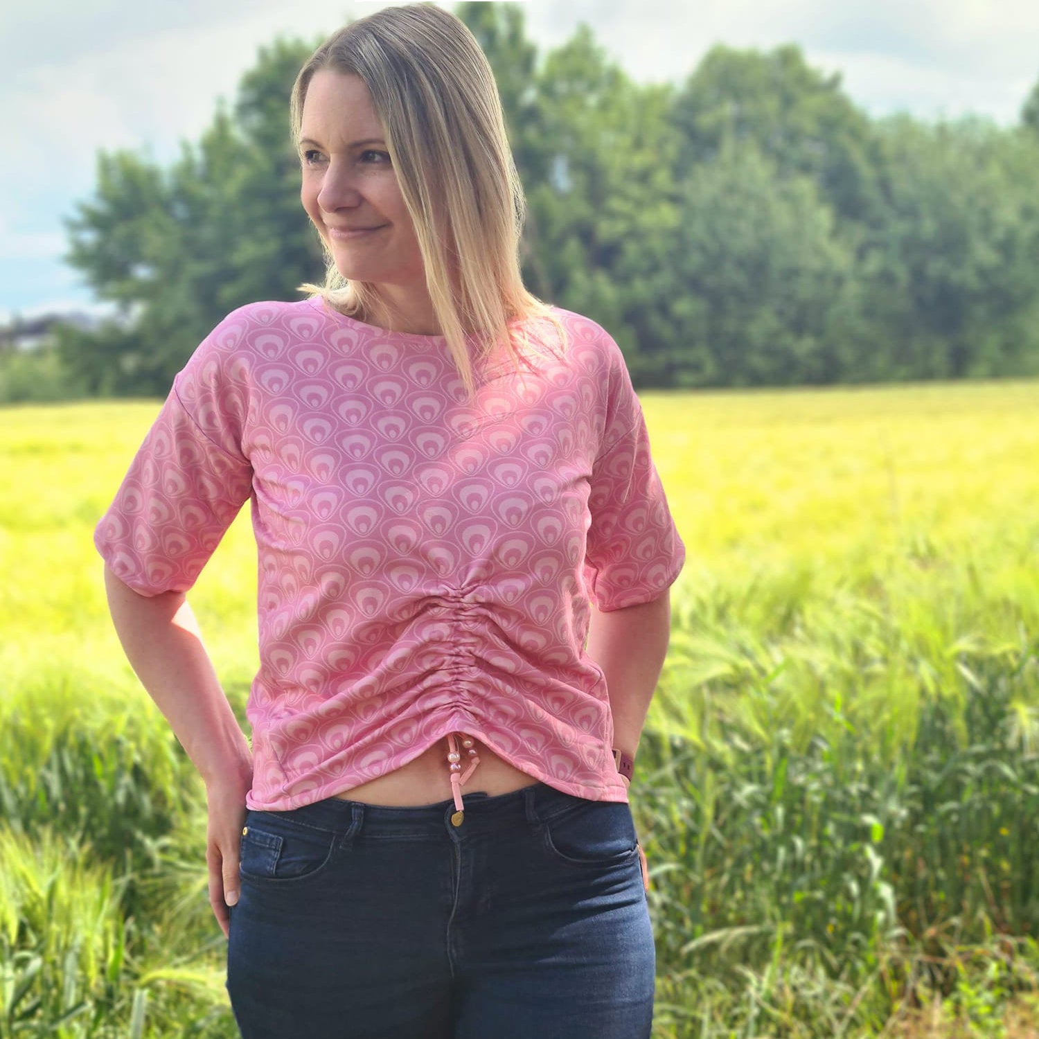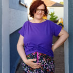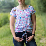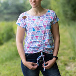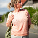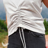Mit seinem überschnittenen Rücken sorgt es für einen lässigen Look und wird durch die optionale Raffung am Vorderteil zum echten Hingucker. Du kannst es zudem mit einer seitlichen Teilung nähen – so erhältst du mit nur einem Schnitt viele verschiedene Looks.