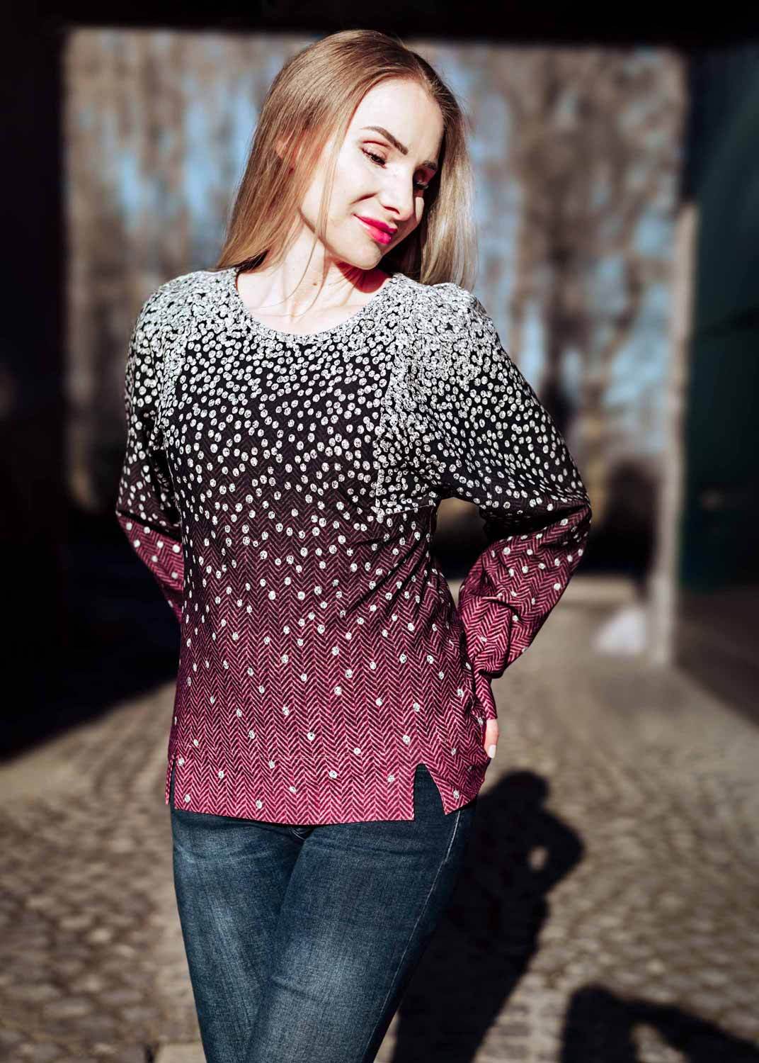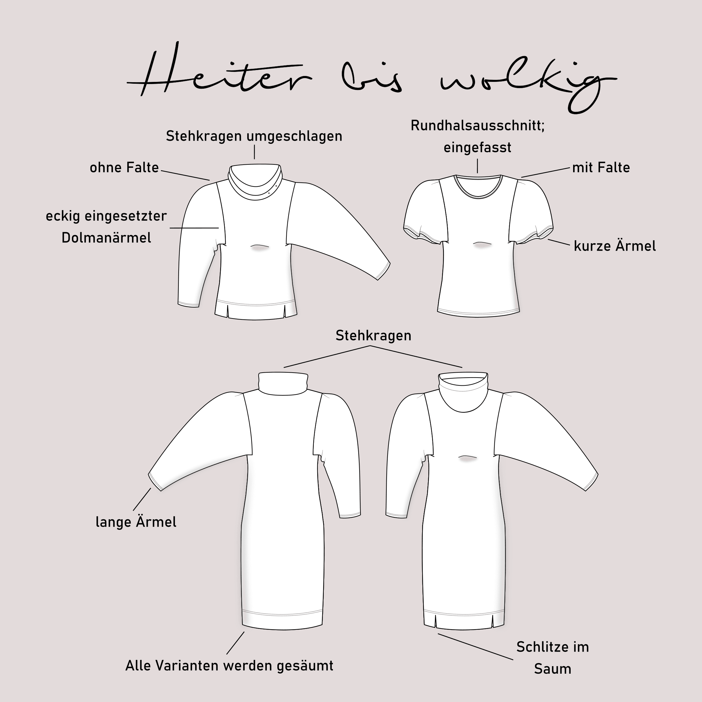 Dieser Schnitt für ein Oberteil, einen Pullover oder ein Kleid mit Kragen oder Rundhalsausschnitt, langen oder kurzen Dolman Ärmeln und optionalen Schlitzen im Saum, trägt den schönen Namen "Heiter bis wolkig". Das Schnittmuster beinhaltet eine ausführliche, schriftliche Anleitung (und Zugang zur bebilderten Anleitung) und die Damen Größen 32 - 62 und und wird dir nach dem Kauf als Sofort Download in PDF Format zur Verfügung gestellt.
