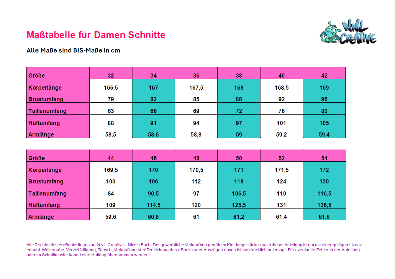 - Eine Vervielfältigung, Weitergabe, Veröffentlichung oder ein Verkauf, Kopieren, Abdruck, Tausch des Schnittmusters ist untersagt.