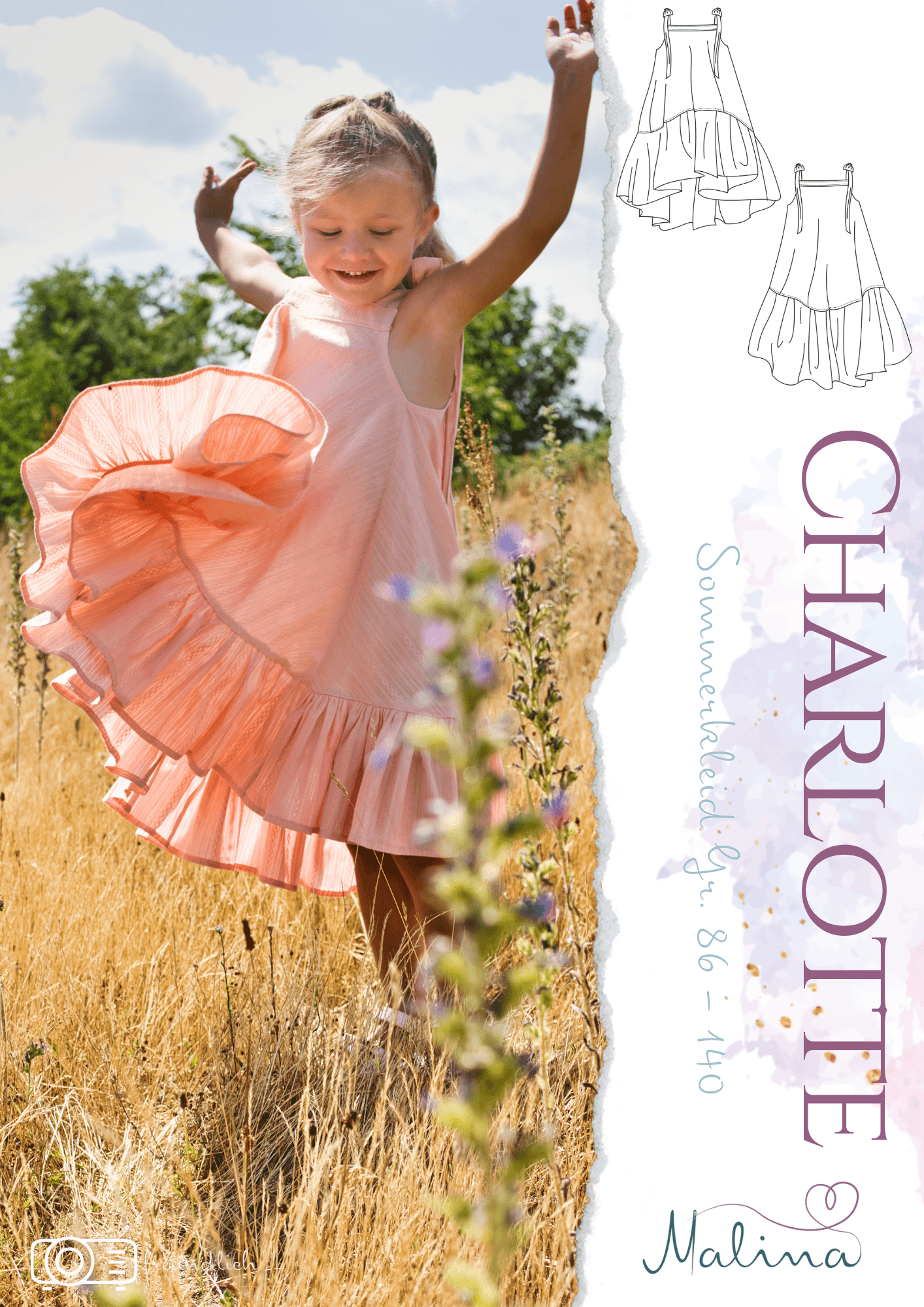 Mit diesem Schnittmuster kannst du das Sommerkleid „Charlotte“ in den Größen 86–140 nähen und deiner kleinen Prinzessin das perfekte Kleid für warme Tage zaubern!