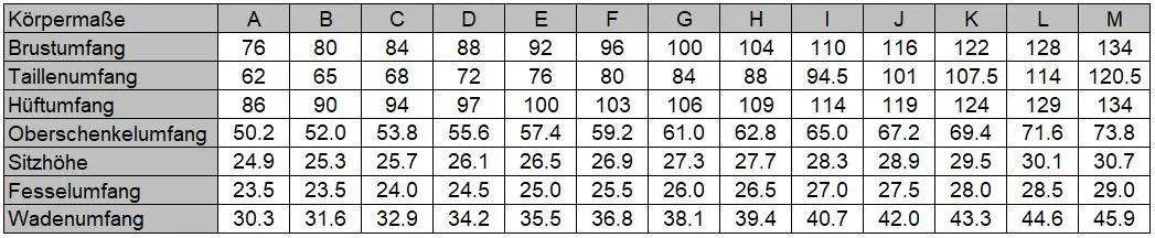 Die Schnittkomponenten sind in den Größen A-M (Hüftumfang 86-134) gradiert.