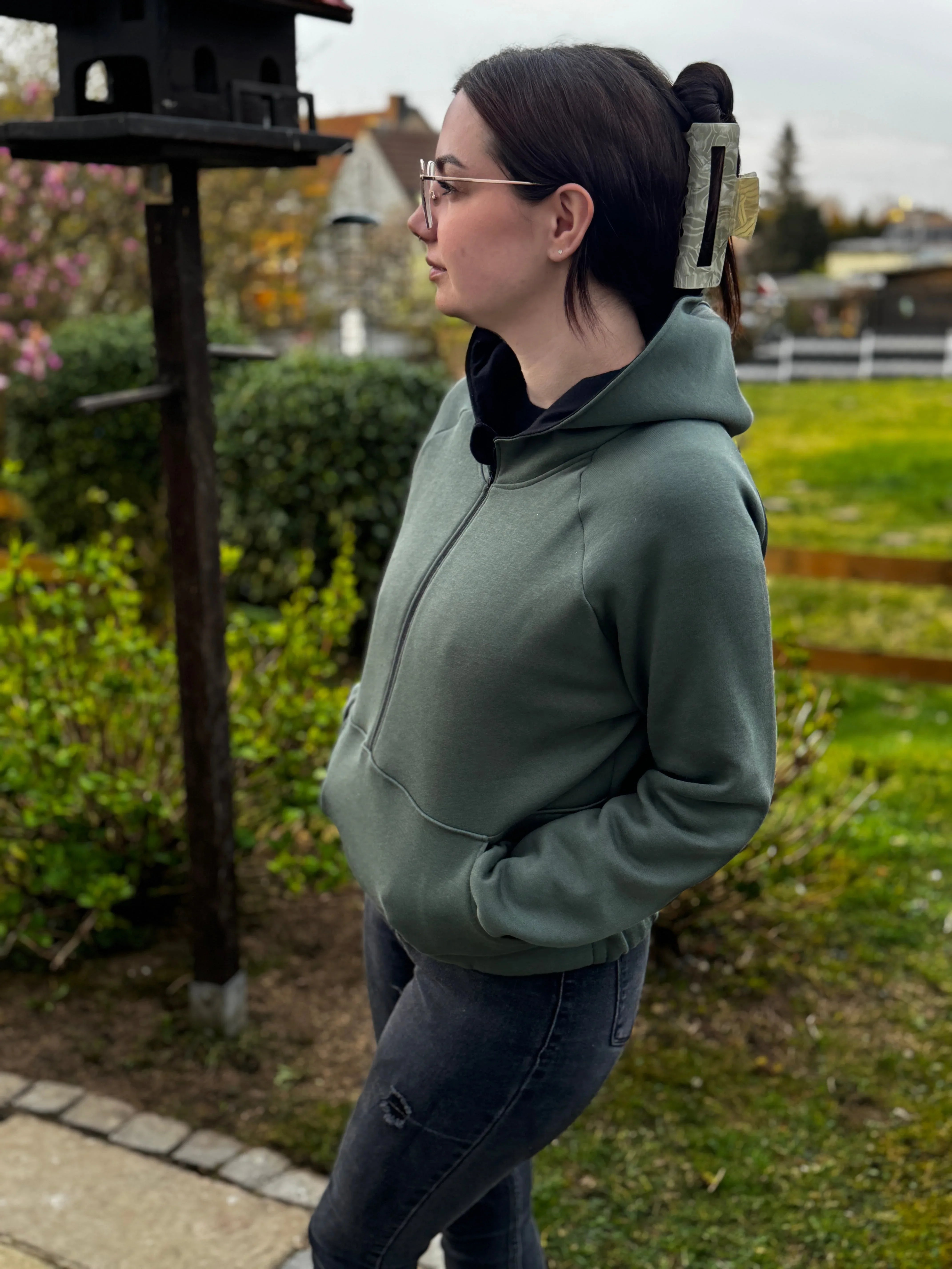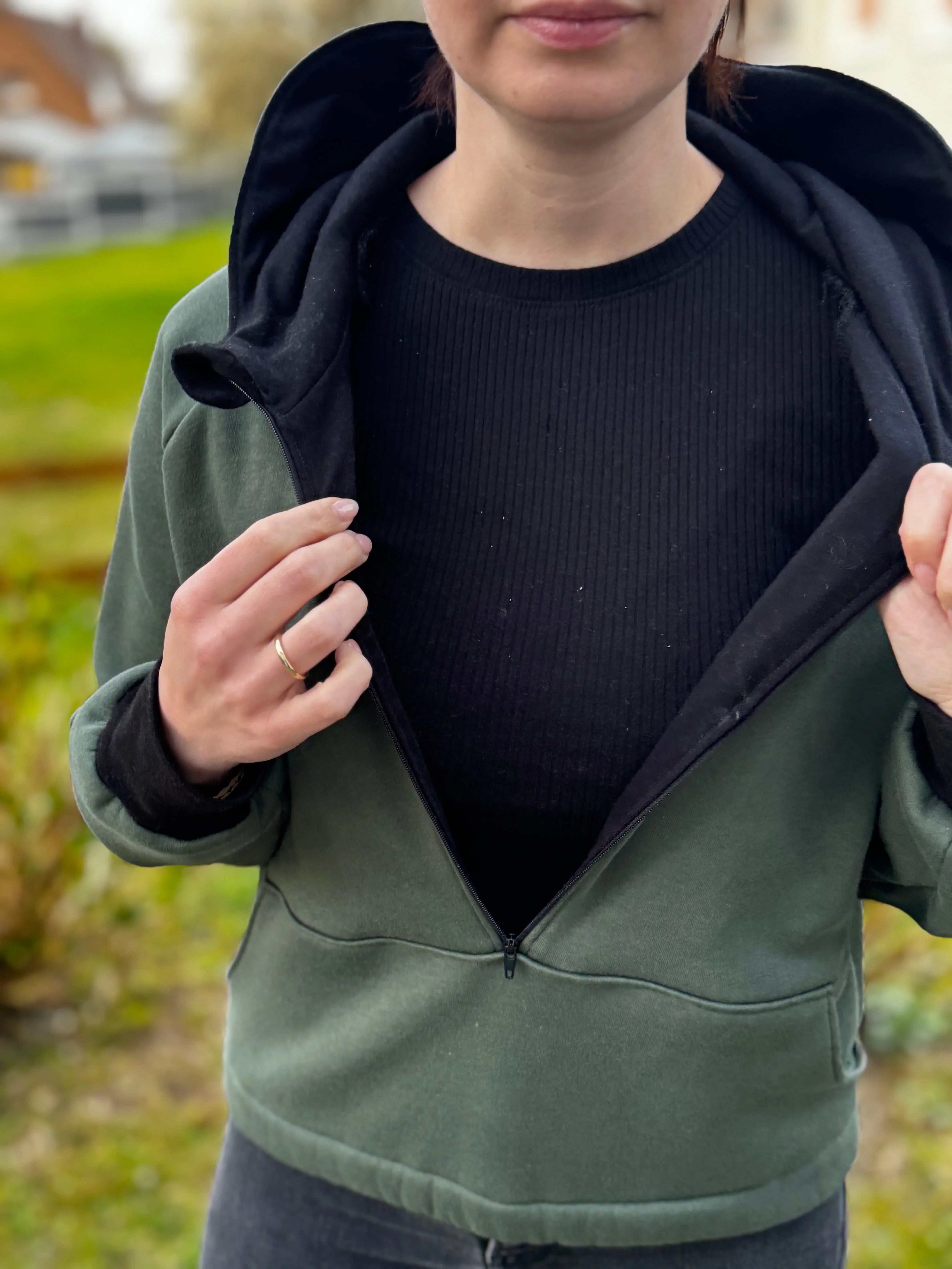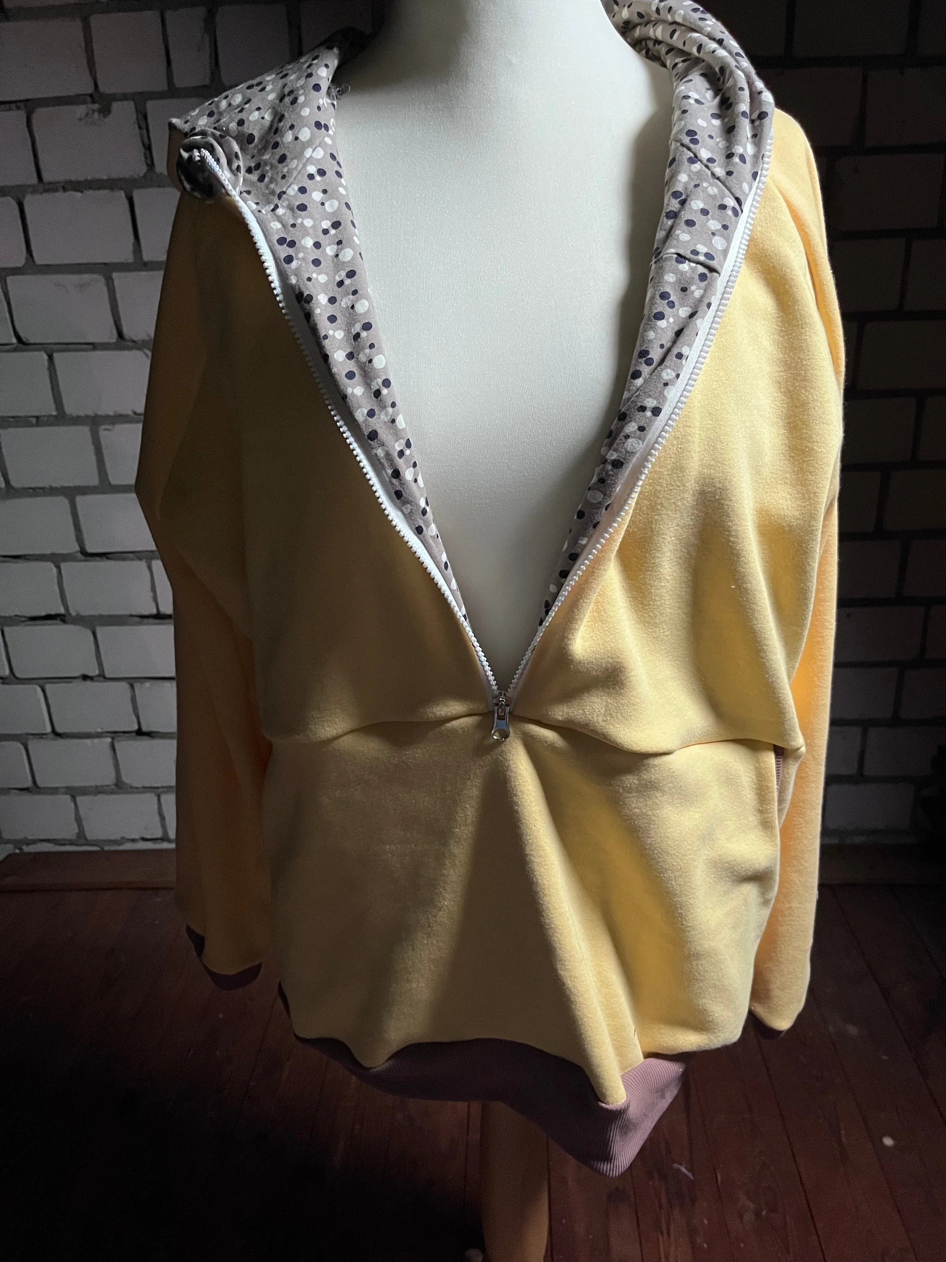 Der Still-Zip-Hoodie Maracuja ist für das diskrete Stillen in der Öffentlichkeit konzipiert. Der Reißverschluss geht weit genug auf, damit der Zugang zur Milch leicht ermöglicht wird. Gleichzeitig sieht der Hoodie auch beim öffnen noch wunderschön aus, da er von innen so gefüttert ist, dass beim Stillen keine rohen Nähte zu sehen sind. Der Stillpulli wird aus dickeren, elastischen Stoffen, wie Sweat oder French Terry genäht. Er hat Raglanärmel. Die Kapuze sowie die Bauchtasche sind ebenfalls gefüttert.