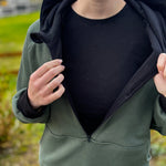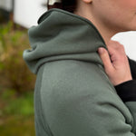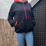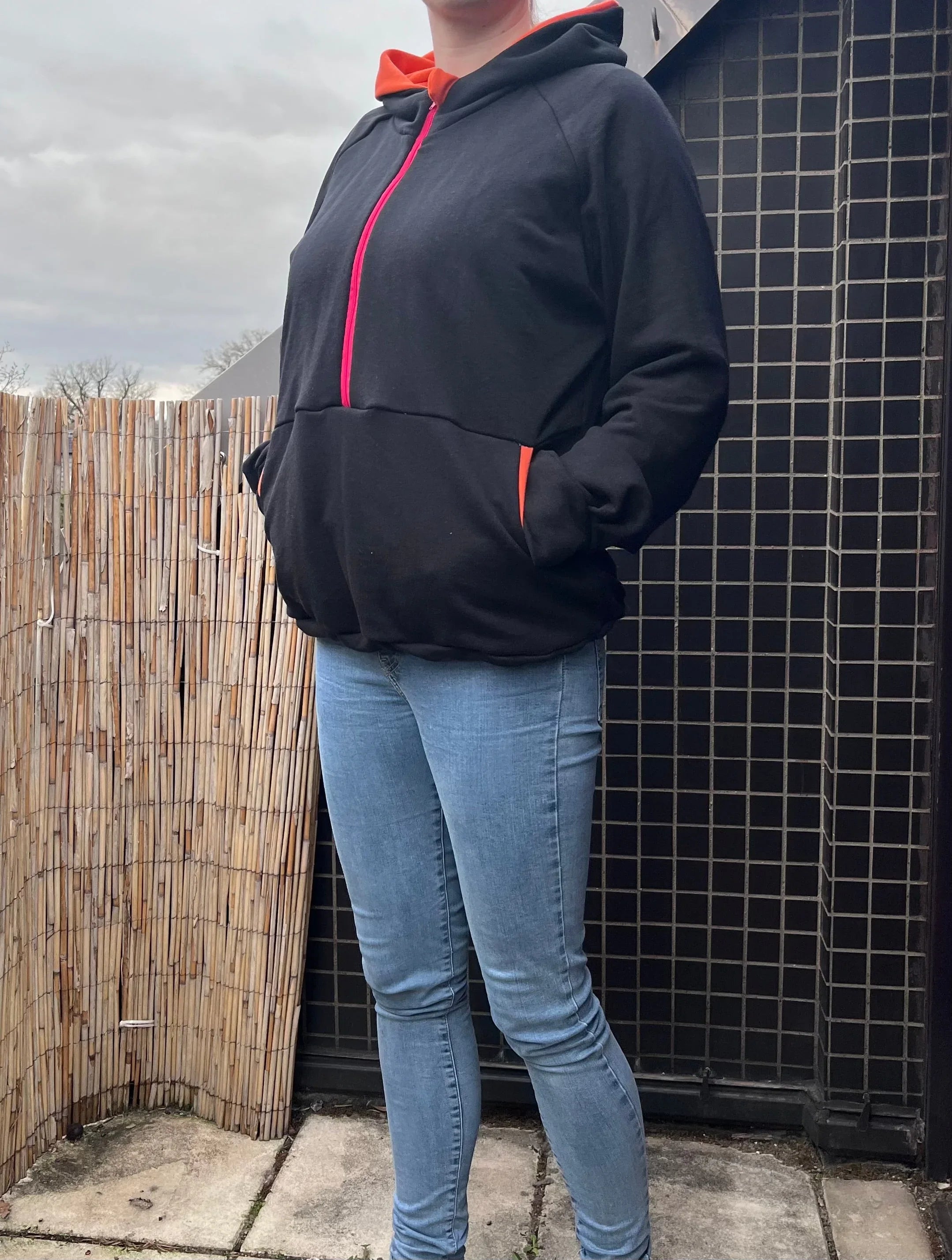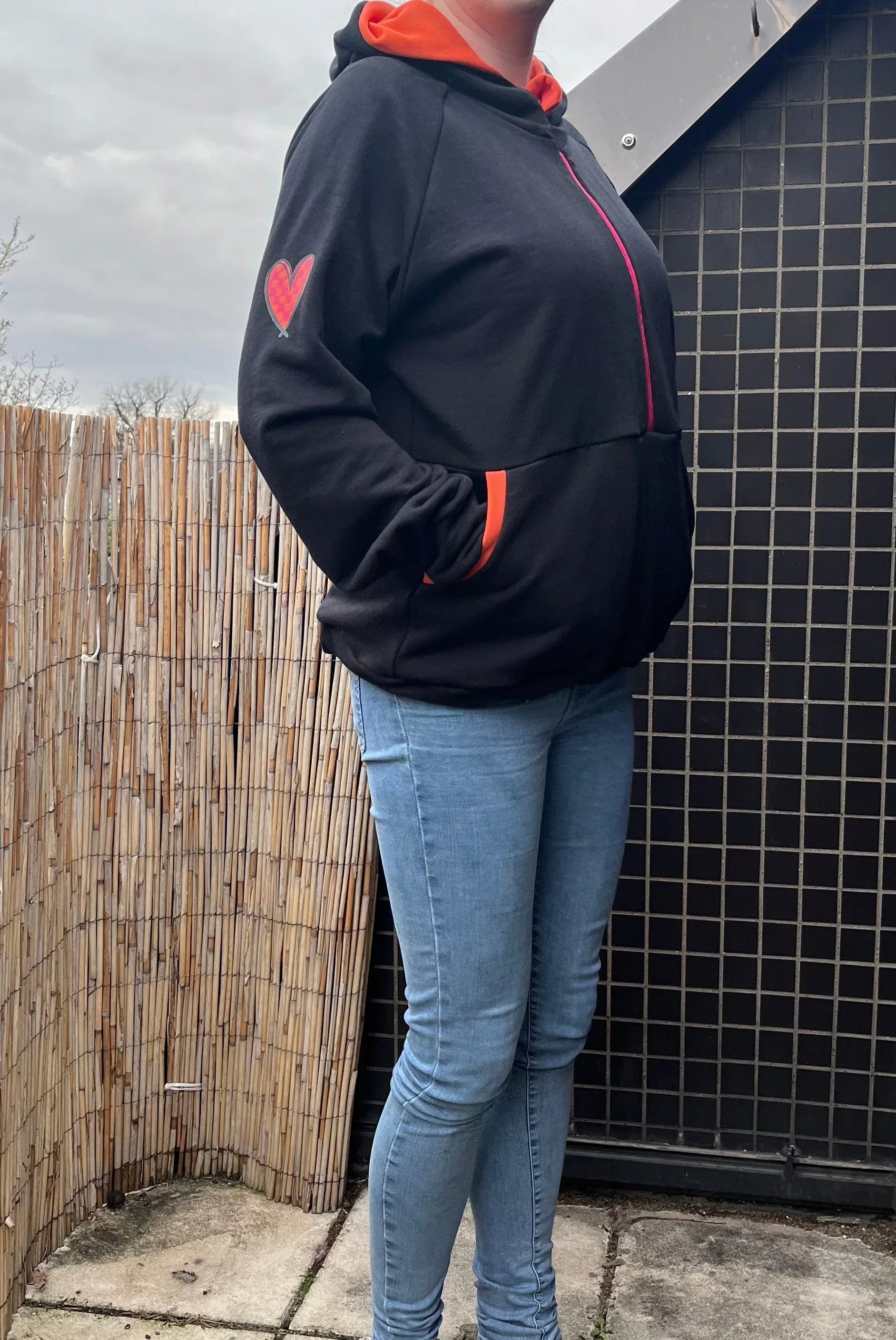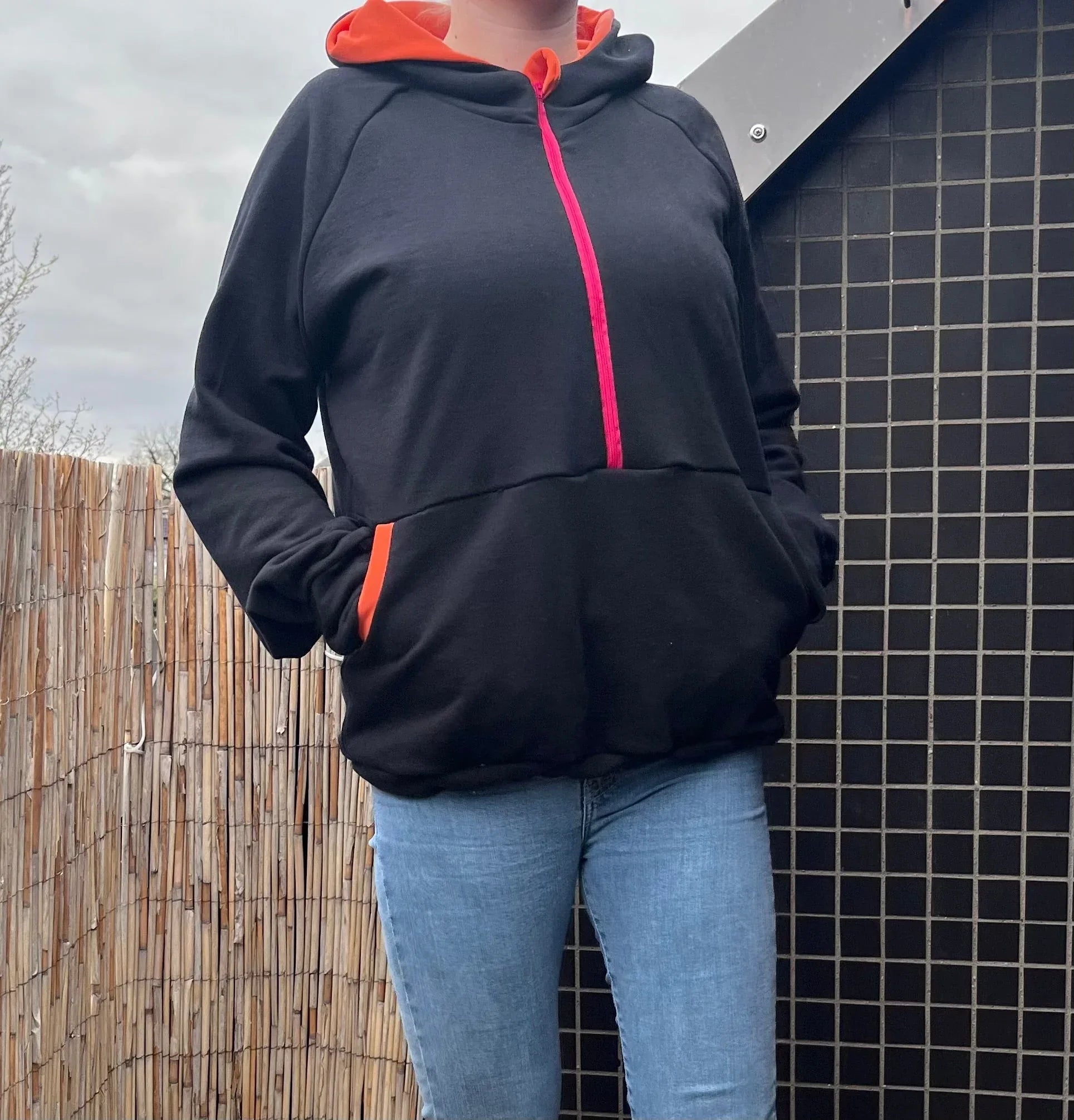 Der Still-Zip-Hoodie Maracuja ist für das diskrete Stillen in der Öffentlichkeit konzipiert. Der Reißverschluss geht weit genug auf, damit der Zugang zur Milch leicht ermöglicht wird. Gleichzeitig sieht der Hoodie auch beim öffnen noch wunderschön aus, da er von innen so gefüttert ist, dass beim Stillen keine rohen Nähte zu sehen sind. Der Stillpulli wird aus dickeren, elastischen Stoffen, wie Sweat oder French Terry genäht. Er hat Raglanärmel. Die Kapuze sowie die Bauchtasche sind ebenfalls gefüttert.
