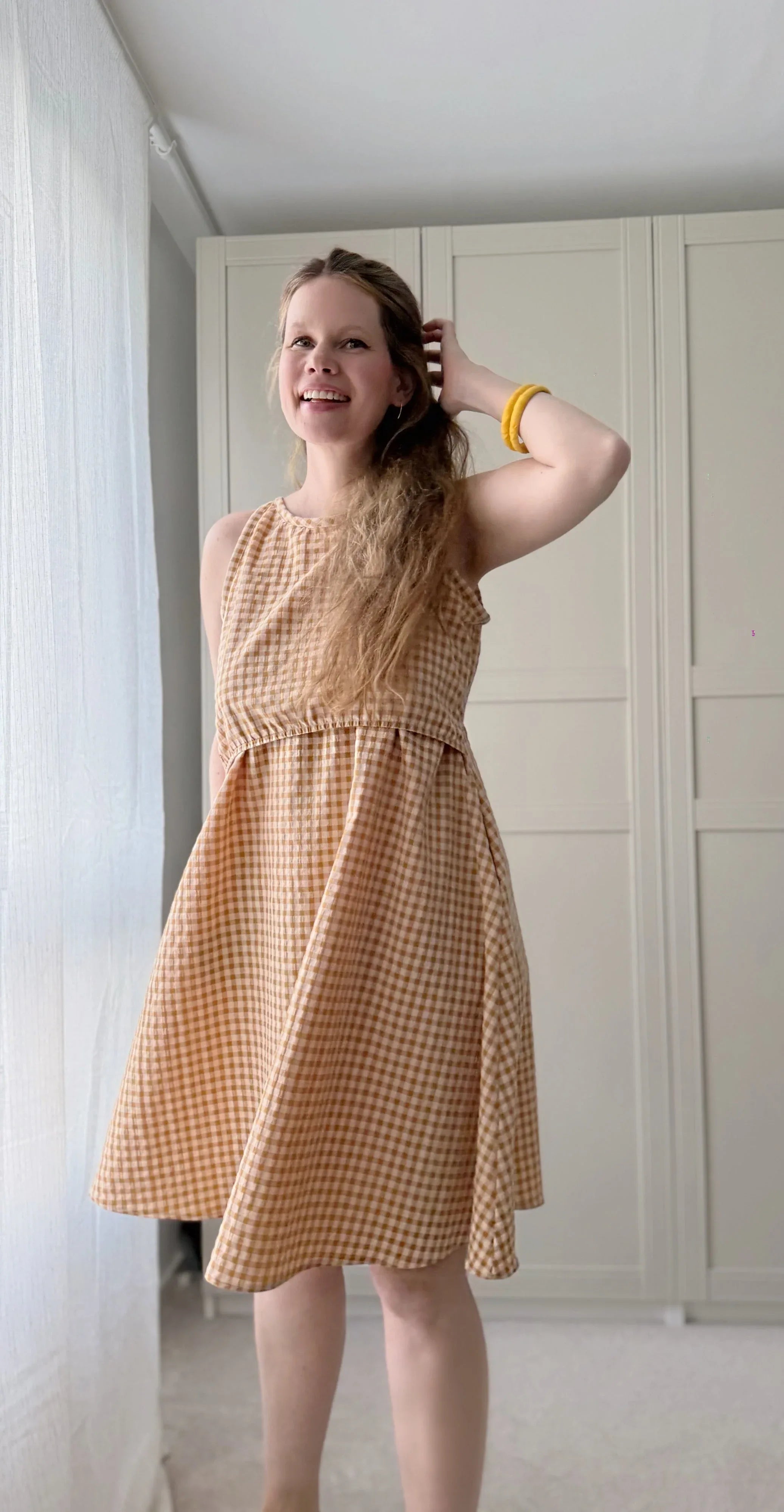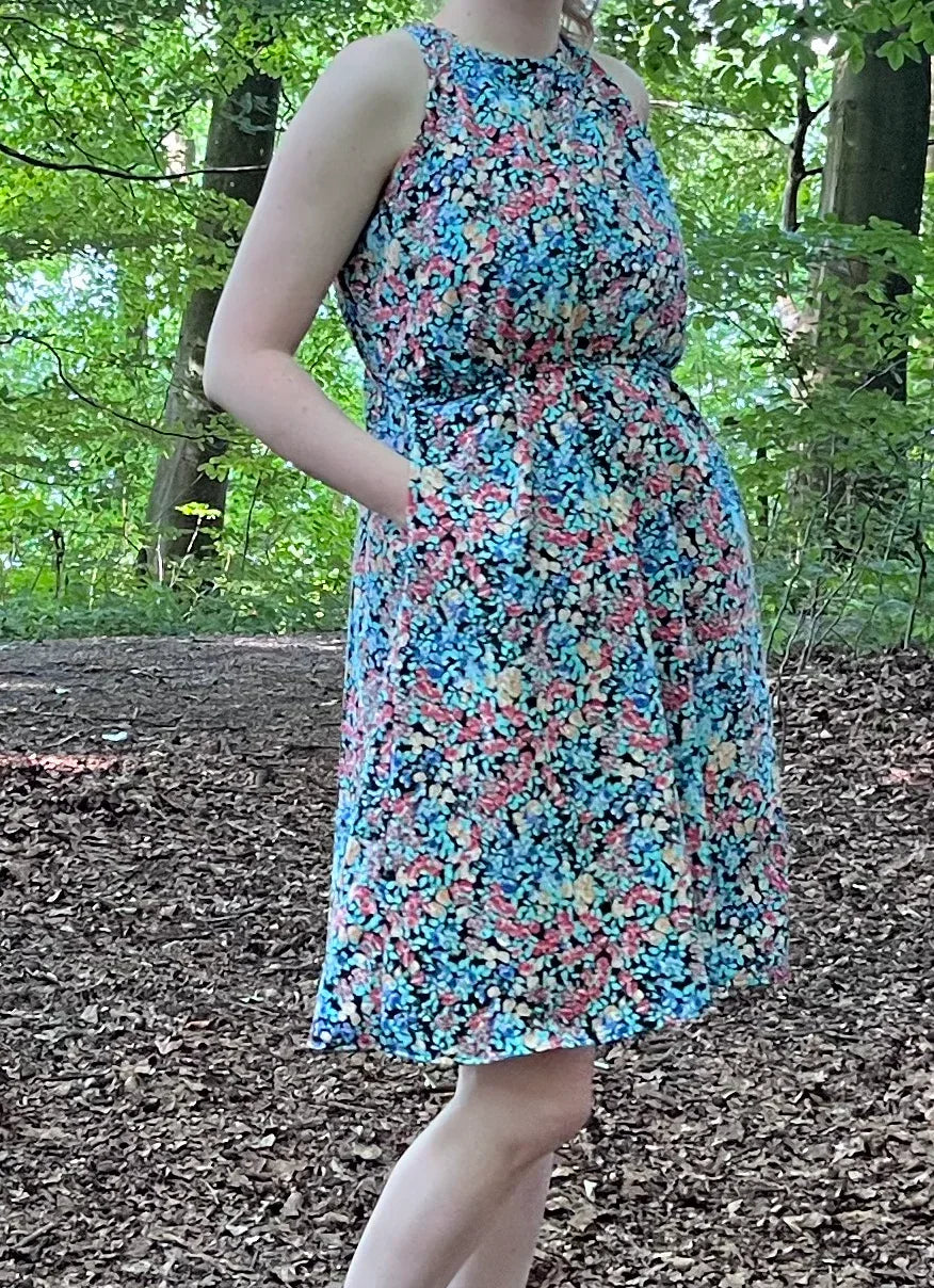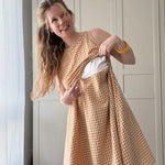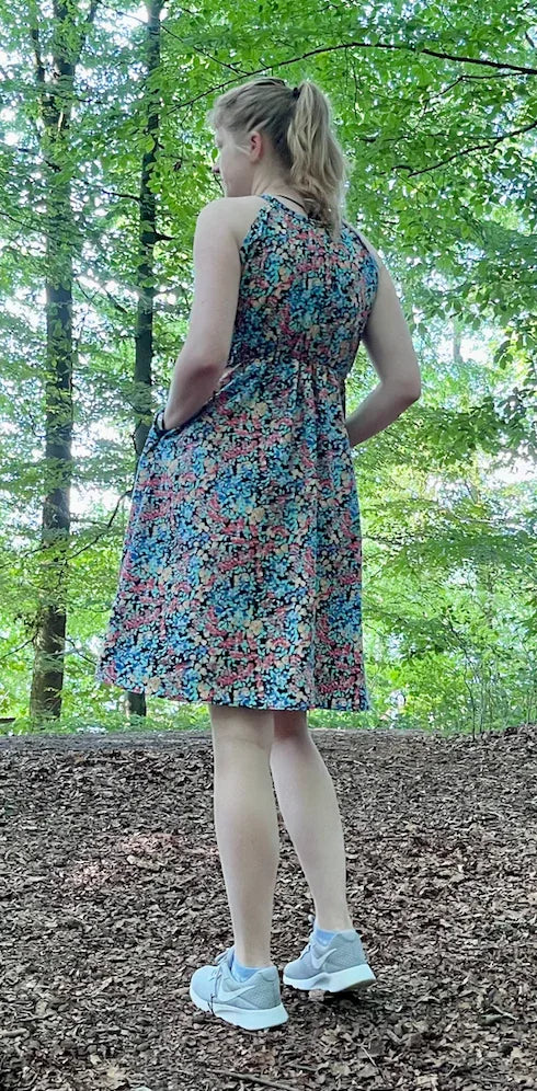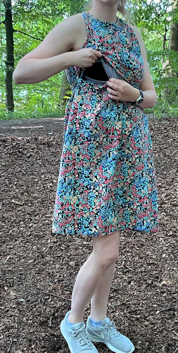 Stillkleid Ananas ist ärmellos und hat einen A-Linien-Rock sowie eine versteckte Stillfunktion. Das Kleid ist super für heiße Sommertage, soweit es aus atmungsaktiven Stoffen, wie Baumwolle oder Viskose genäht ist. Das Stilloberteil wird aus dehnbarem Stoff genäht, damit es zum Stillen zur Seite gezogen werden kann. In normalem Zustand, deckt es die Brust vollständig ab. Das vordere Oberteil hat an der Taille ein Gummiband, damit es an Ort und Stelle bleibt, aber zum Stillen problemlos hochgezogen werden kann. Die Länge des Rockes kann individuell angepasst werden. Dies ist ein digitaler Download eines Schnittmusters, das in A4, A0 und US Letter zur Verfügung gestellt wird. Zudem gibt es die bebildeter Nähanleitung auf Deutsch und Englisch. Ich bin mir sicher, dass auch ein_e Anfänger_in dieses Kleid nähen kann. Zudem gibt es eine Nachhaltigkeitsoption, die ermöglicht, das Kleid nach der Stillreise auch ohne Stilleinsatz zu nähen.