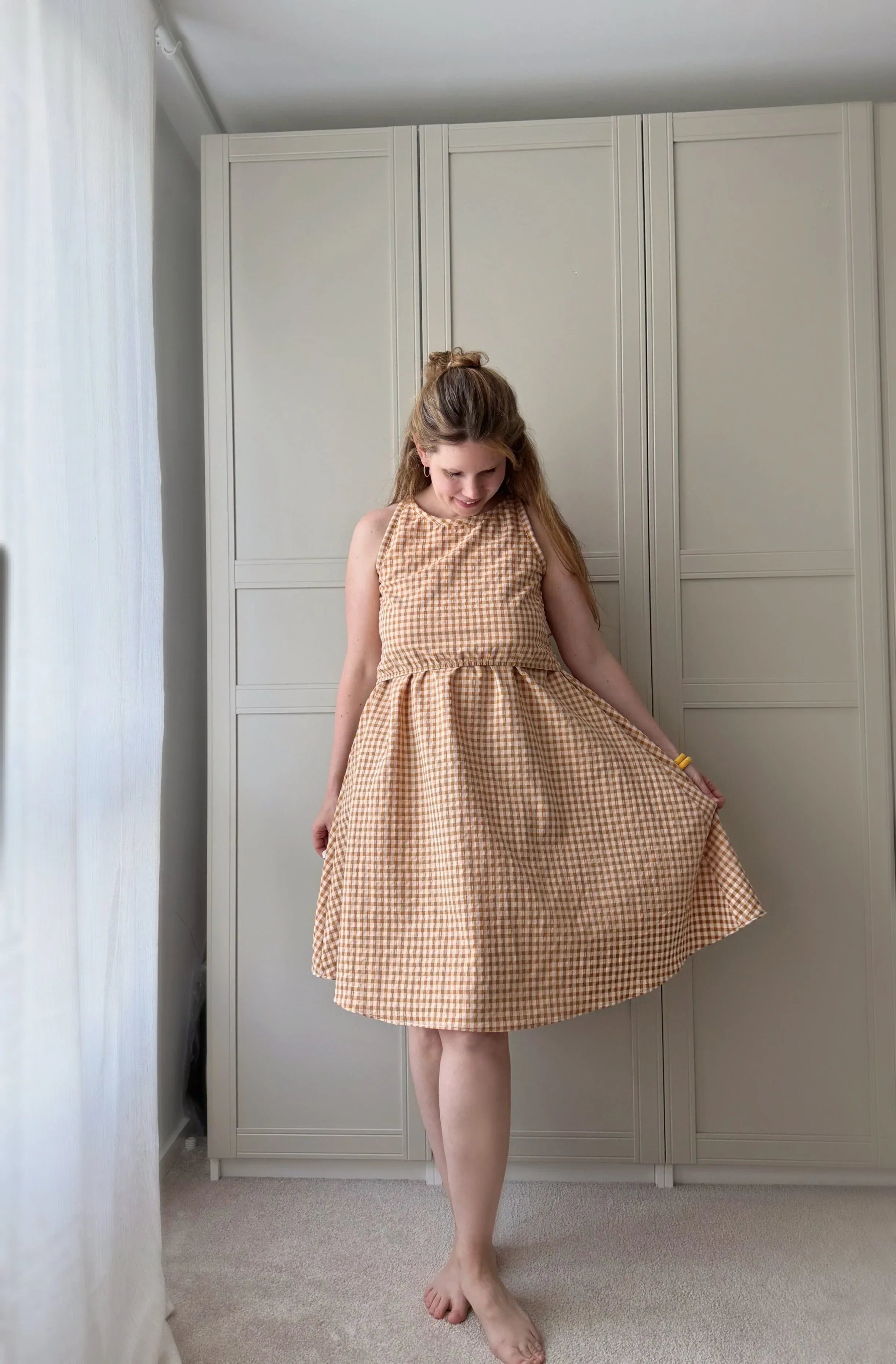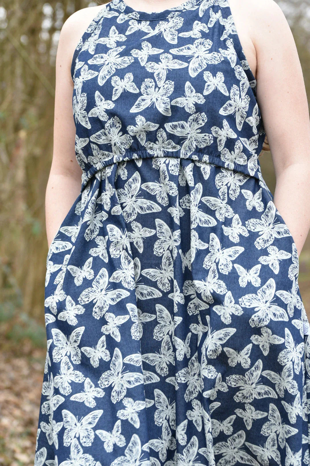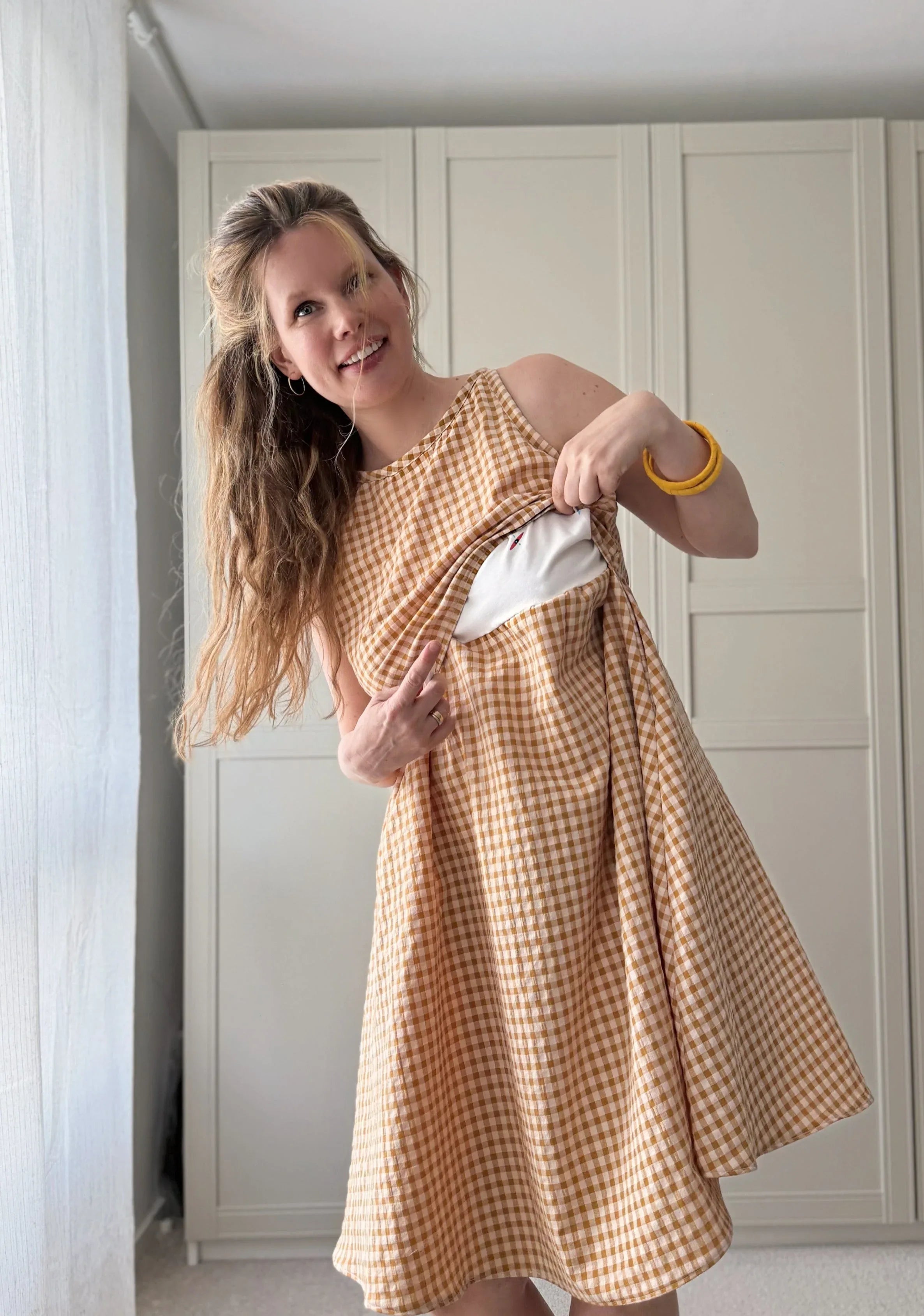 Stillkleid Ananas ist ärmellos und hat einen A-Linien-Rock sowie eine versteckte Stillfunktion. Das Kleid ist super für heiße Sommertage, soweit es aus atmungsaktiven Stoffen, wie Baumwolle oder Viskose genäht ist. Das Stilloberteil wird aus dehnbarem Stoff genäht, damit es zum Stillen zur Seite gezogen werden kann. In normalem Zustand, deckt es die Brust vollständig ab. Das vordere Oberteil hat an der Taille ein Gummiband, damit es an Ort und Stelle bleibt, aber zum Stillen problemlos hochgezogen werden kann. Die Länge des Rockes kann individuell angepasst werden. Dies ist ein digitaler Download eines Schnittmusters, das in A4, A0 und US Letter zur Verfügung gestellt wird. Zudem gibt es die bebildeter Nähanleitung auf Deutsch und Englisch. Ich bin mir sicher, dass auch ein_e Anfänger_in dieses Kleid nähen kann. Zudem gibt es eine Nachhaltigkeitsoption, die ermöglicht, das Kleid nach der Stillreise auch ohne Stilleinsatz zu nähen.