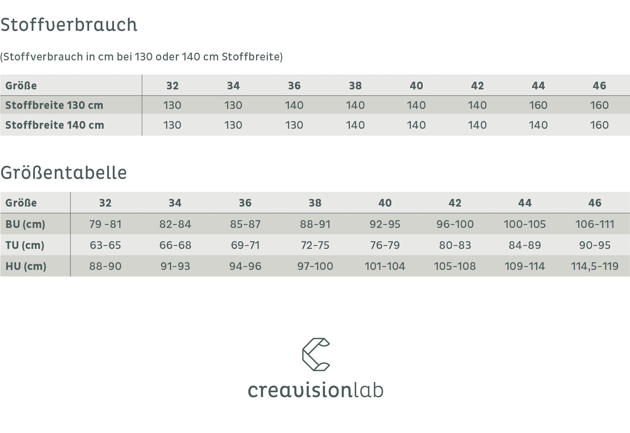 - Nahtzugabe: Die Nahtzugabe sowie Saumzugaben sind bei allen Schnittteilen enthalten.