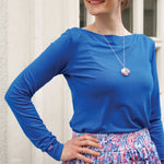 Der Pullover "Bettina" besticht durch seinen eleganten U-Boot-Ausschnitt und das raffinierte Detail, bei dem die Bündchenstreifen auf den Schultern direkt aufeinandertreffen. Dieses besondere Merkmal verleiht dem Pullover eine stilvolle Note und macht ihn zu einem echten Hingucker. Mit seinen überschnittenen Schultern und den extra langen Ärmeln sorgt "Bettina" für einen lässigen Look, der perfekt zu Röcken oder Hosen passt. Der Saum endet knapp unter der Hüfte und kann mit oder ohne Bündchen gestaltet werden - so kannst du den Pullover ganz nach deinem Geschmack anpassen.