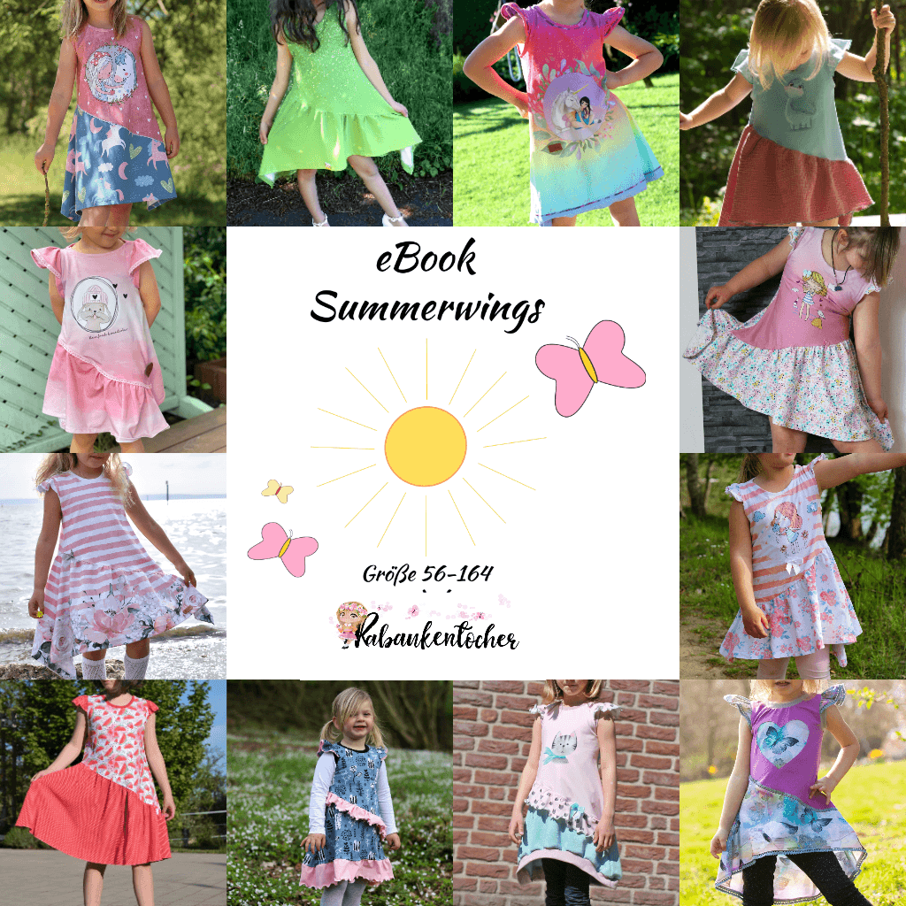 Beim eBook „Summerwings“ handelt es sich wahlweise um eine A-Linientunika oder ein A-Linienkleidchen mit: - Flügelärmeln - verschiedenen Abschlüssen - Belegen - zwei Teilungen - V-Ausschnitt zum Binden in den Einzelgrößen 56-164. Achtung! In Kombi mit dem Ärmel-Add On auch mit Ärmeln nähbar!