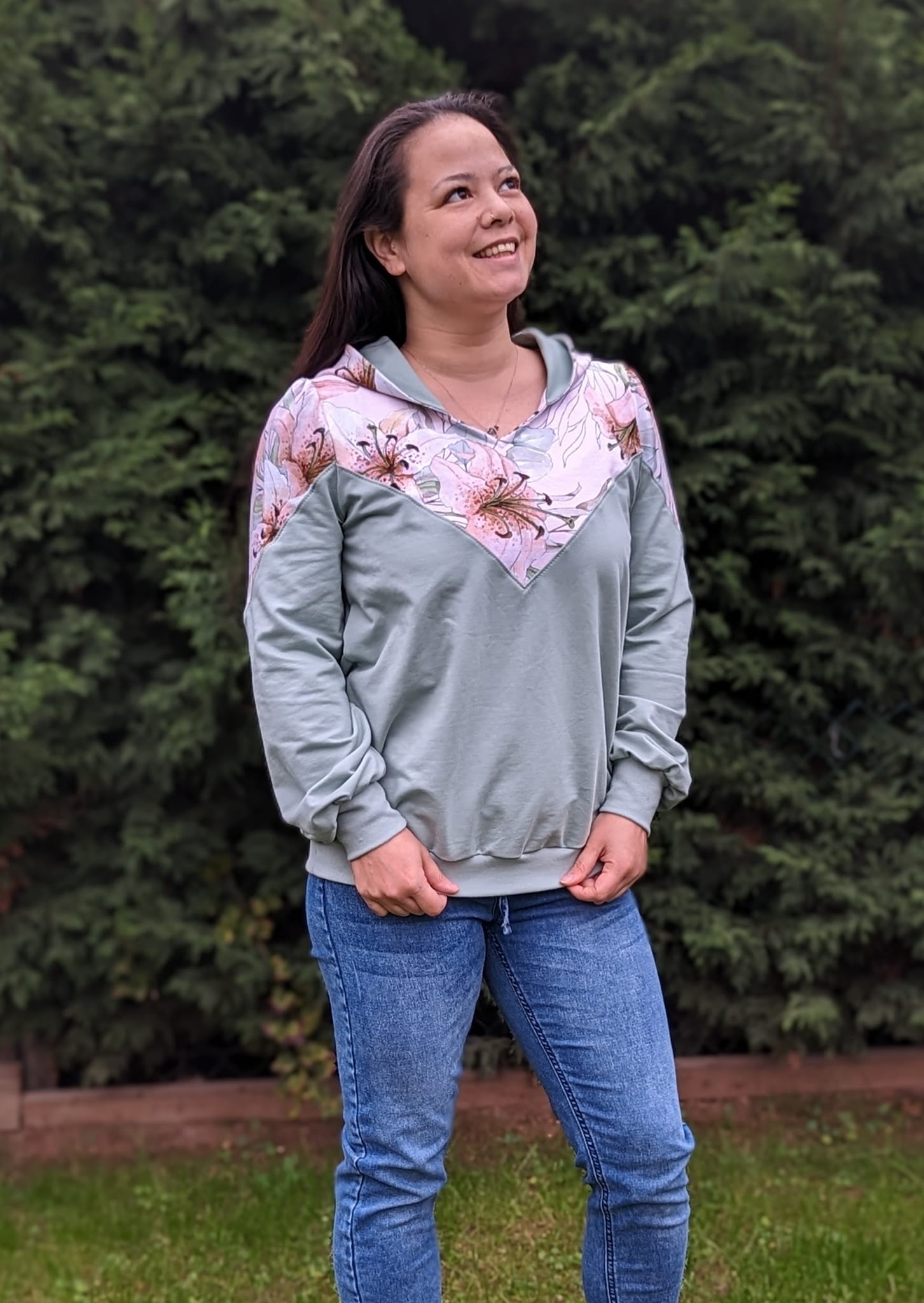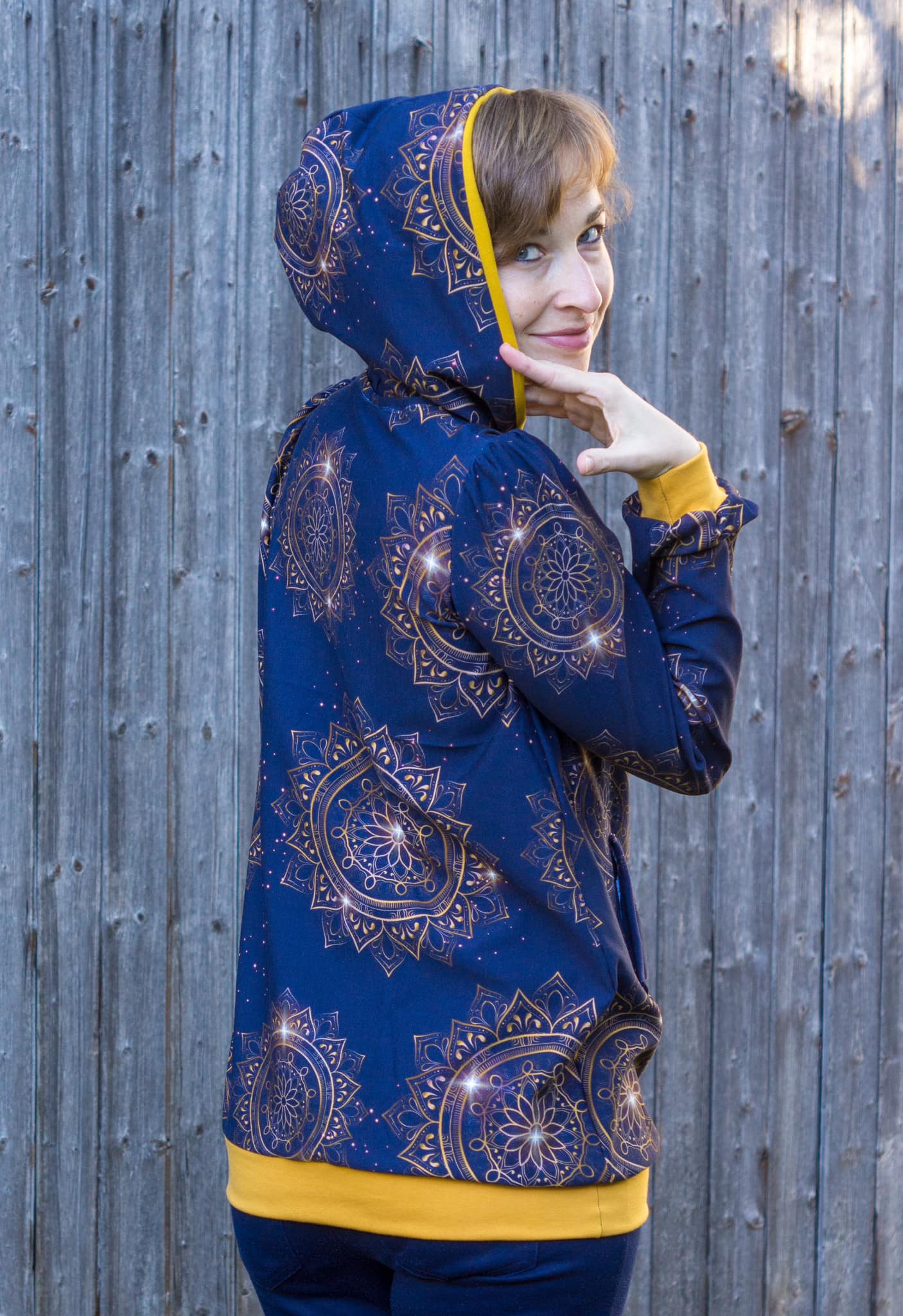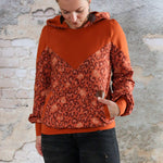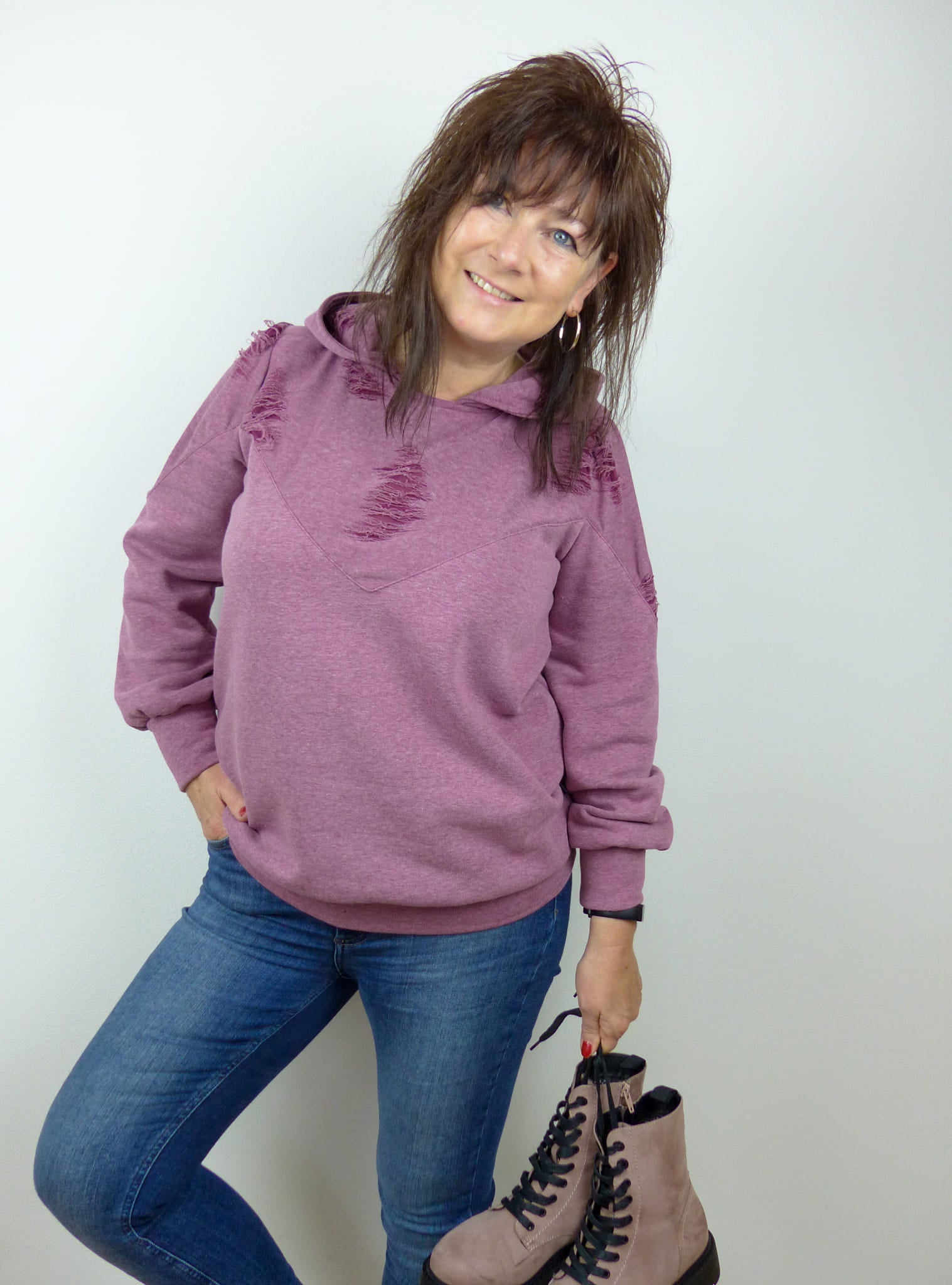 Auch die Kapuze ist hier etwas ganz Besonderes: Du kannst sie offen nähen und damit eine einzigartige Optik schaffen. Alternativ lässt sich der Hoodie auch ohne Kapuze als Rundhals- oder V-Neck-Sweater nähen.