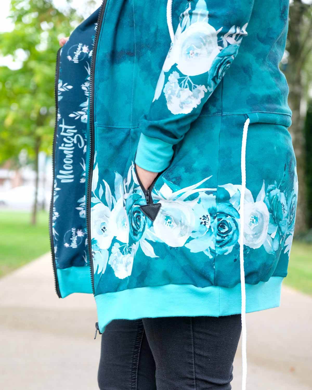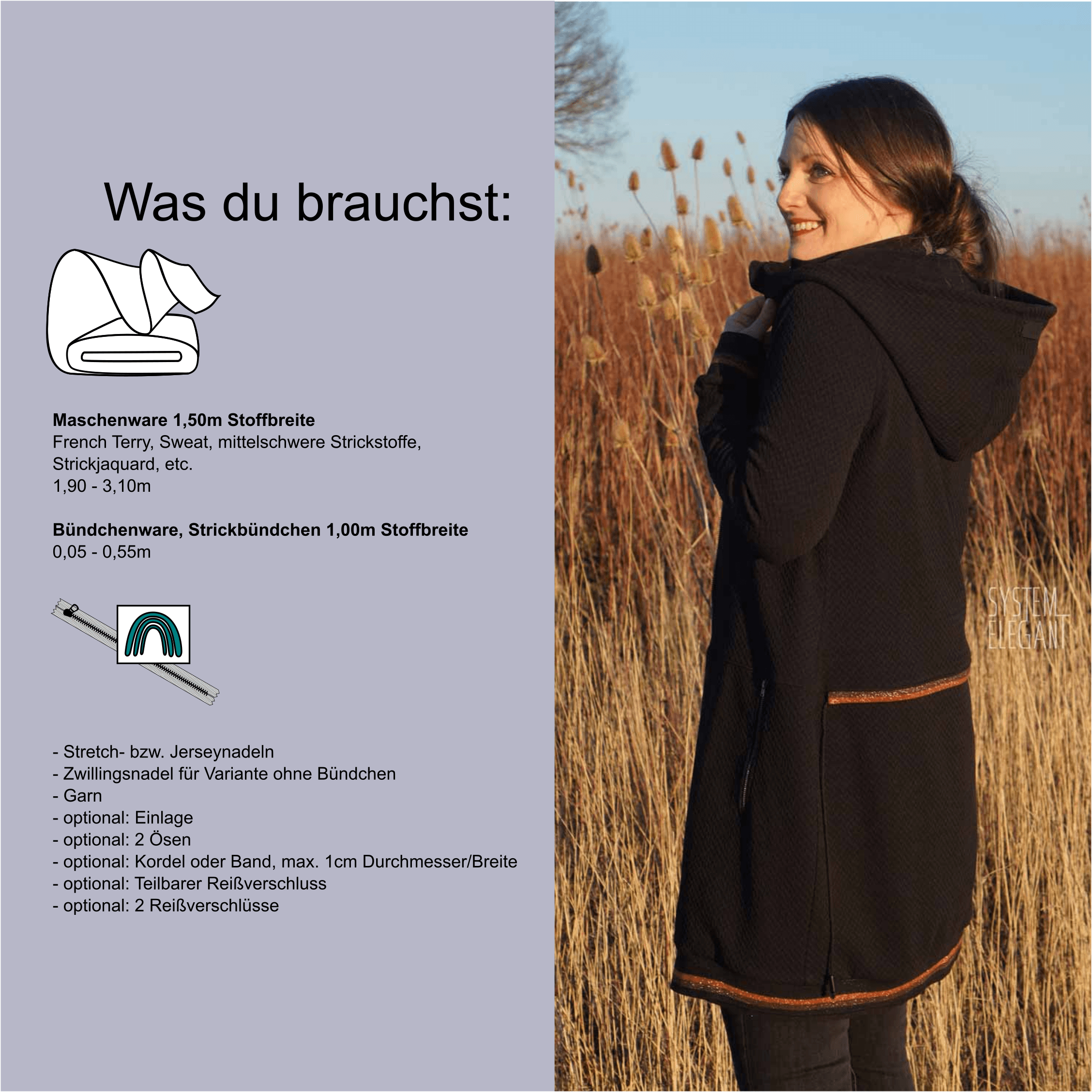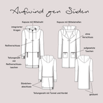 Dieser Schnitt für eine lange sportliche Sweatjacke oder feminineren Cardigan, die du sowohl mit als auch ohne Reißverschluss und Teilungen nähen kannst, der dir 2 Taschen und mehrere Kapuzen Varianten bietet, trägt den schönen Namen "Aufwind gen Süden". Das Schnittmuster beinhaltet eine ausführliche, schriftliche Anleitung (und Zugang zur bebilderten Anleitung) und die Damen Größen 32 - 62 und wird dir nach dem Kauf als Sofort Download in PDF Format zur Verfügung gestellt.