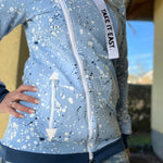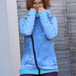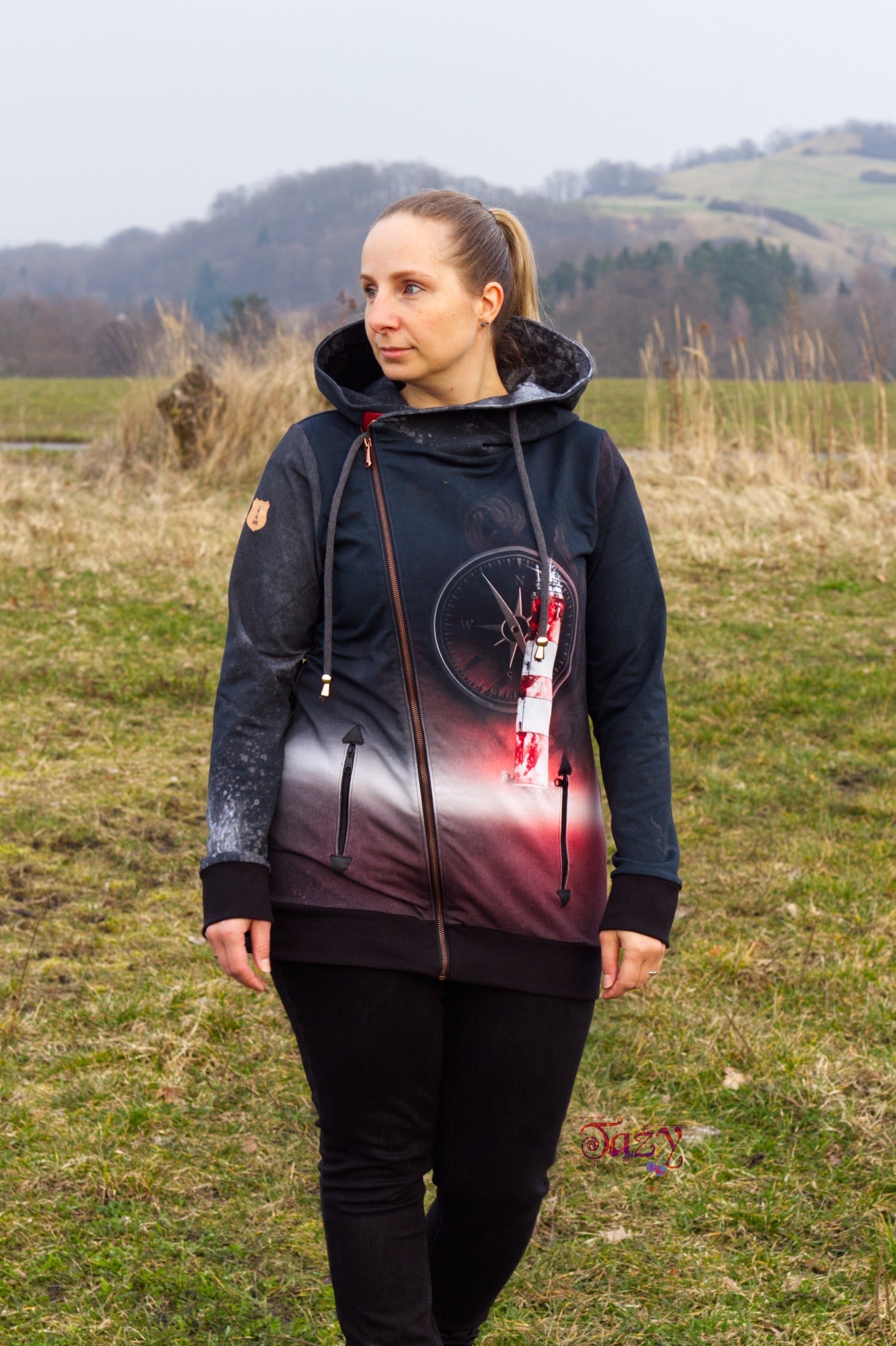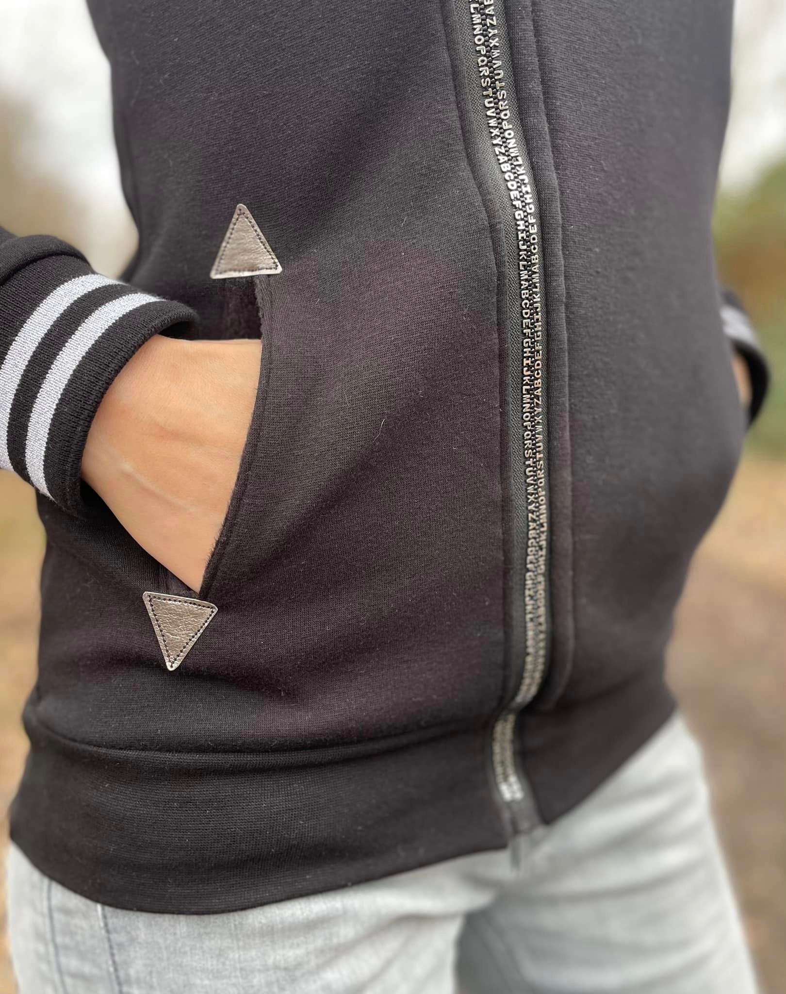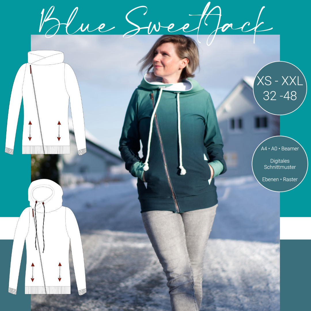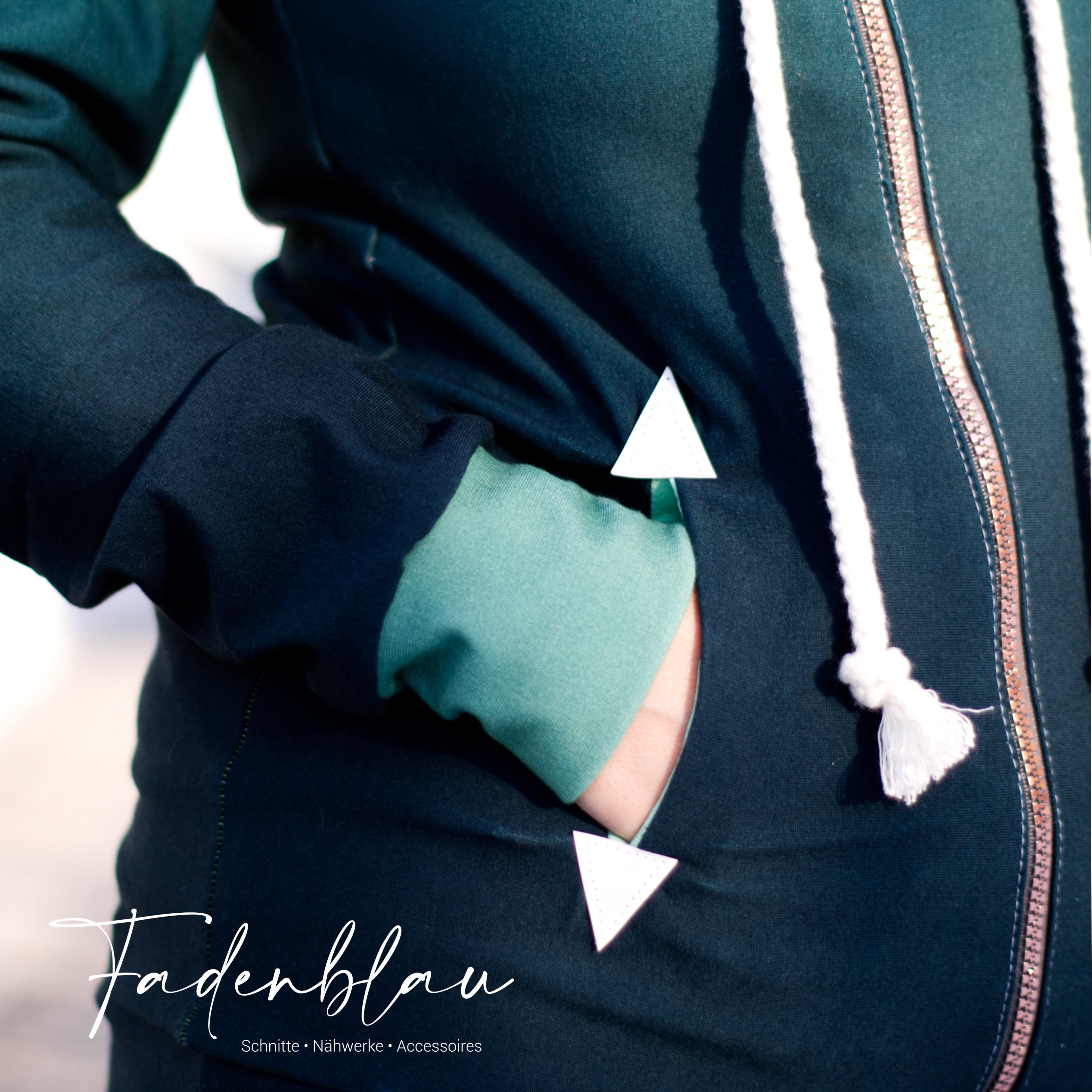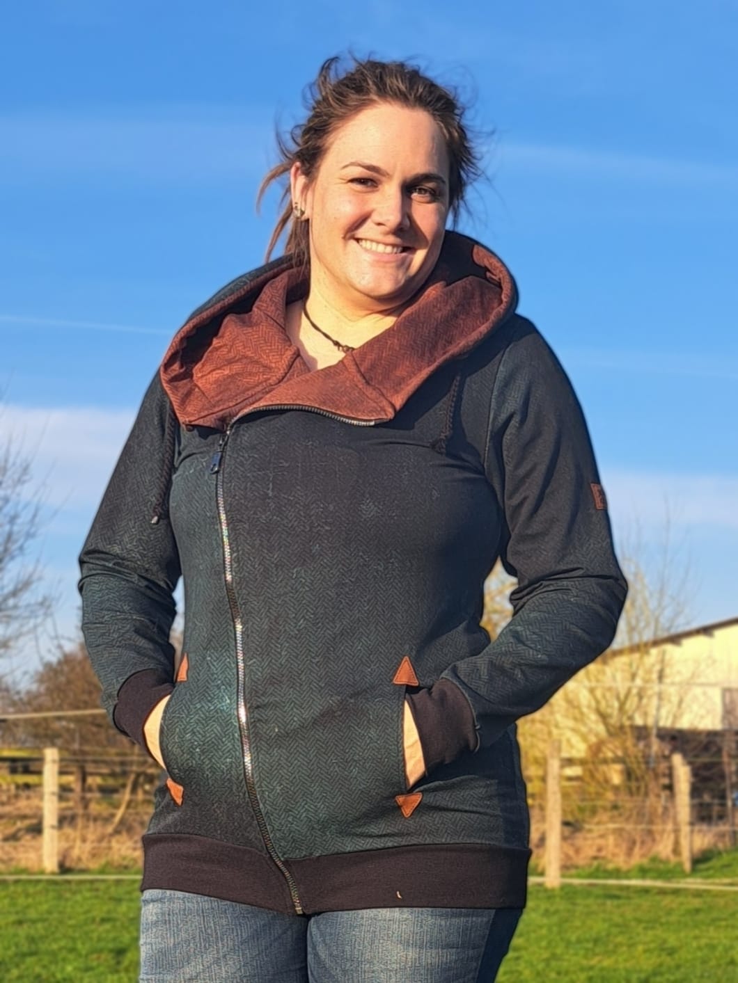 Die BlueSweetJack ist eine stylische Sweatjacke mit einem schrägen Reißverschluss, der für einen modernen und aufregenden Look sorgt. Du kannst die Jacke mit einer Kapuze oder einem Kragen nähen – je nach deinem persönlichen Stil. Besonders hervorstechend sind die Eingrifftaschen mit optionalen Patches, die du nach Lust und Laune mit oder ohne Reißverschluss umsetzen kannst. Die Patches sind in verschiedenen Formen als Vorlage im Schnittmuster enthalten und lassen sich einfach mit dem Plotter oder der Schere zuschneiden. Ein weiteres Highlight: Durch die inneren Belegesieht die Jacke auch offen getragen richtig gut aus!